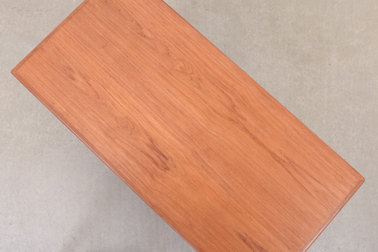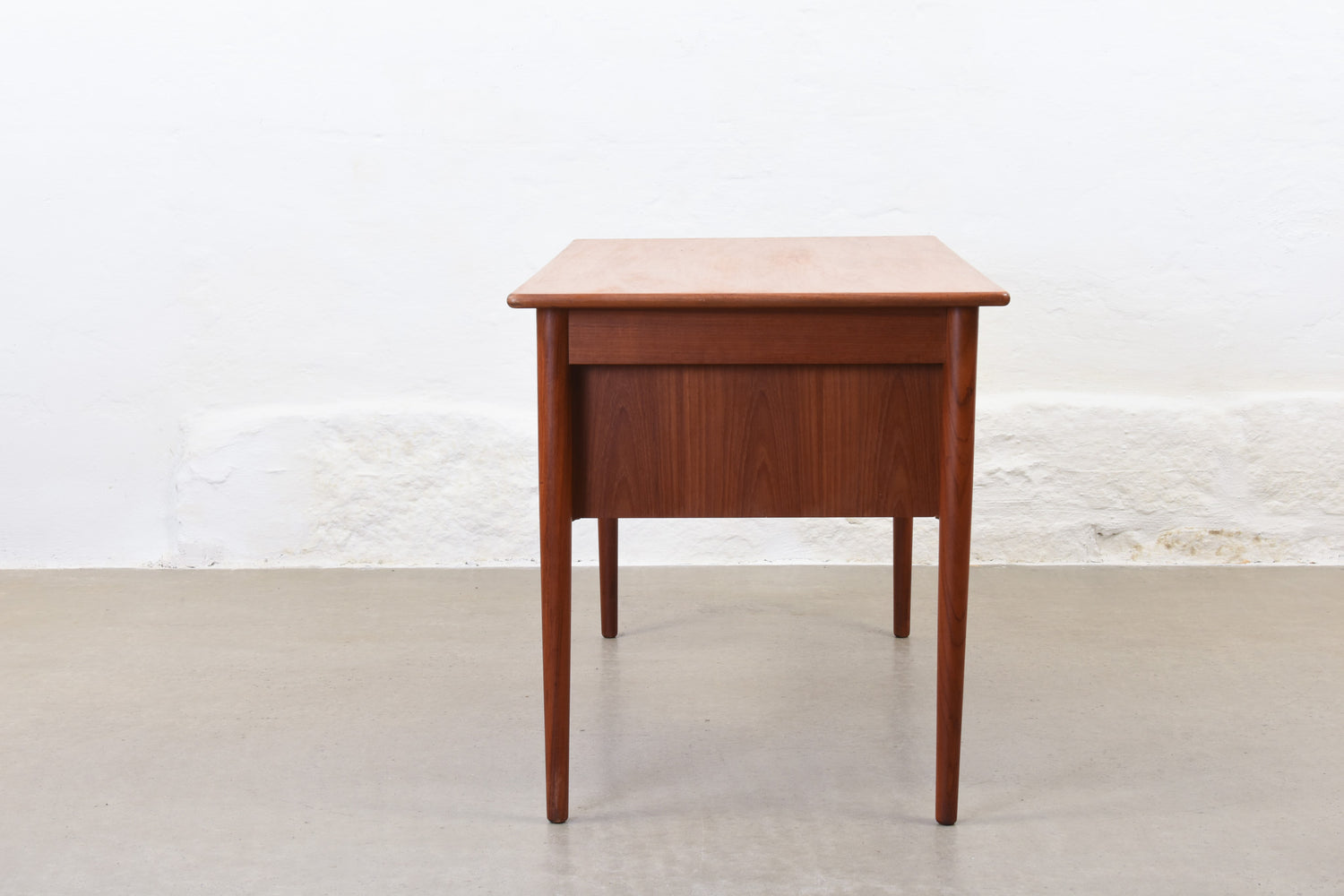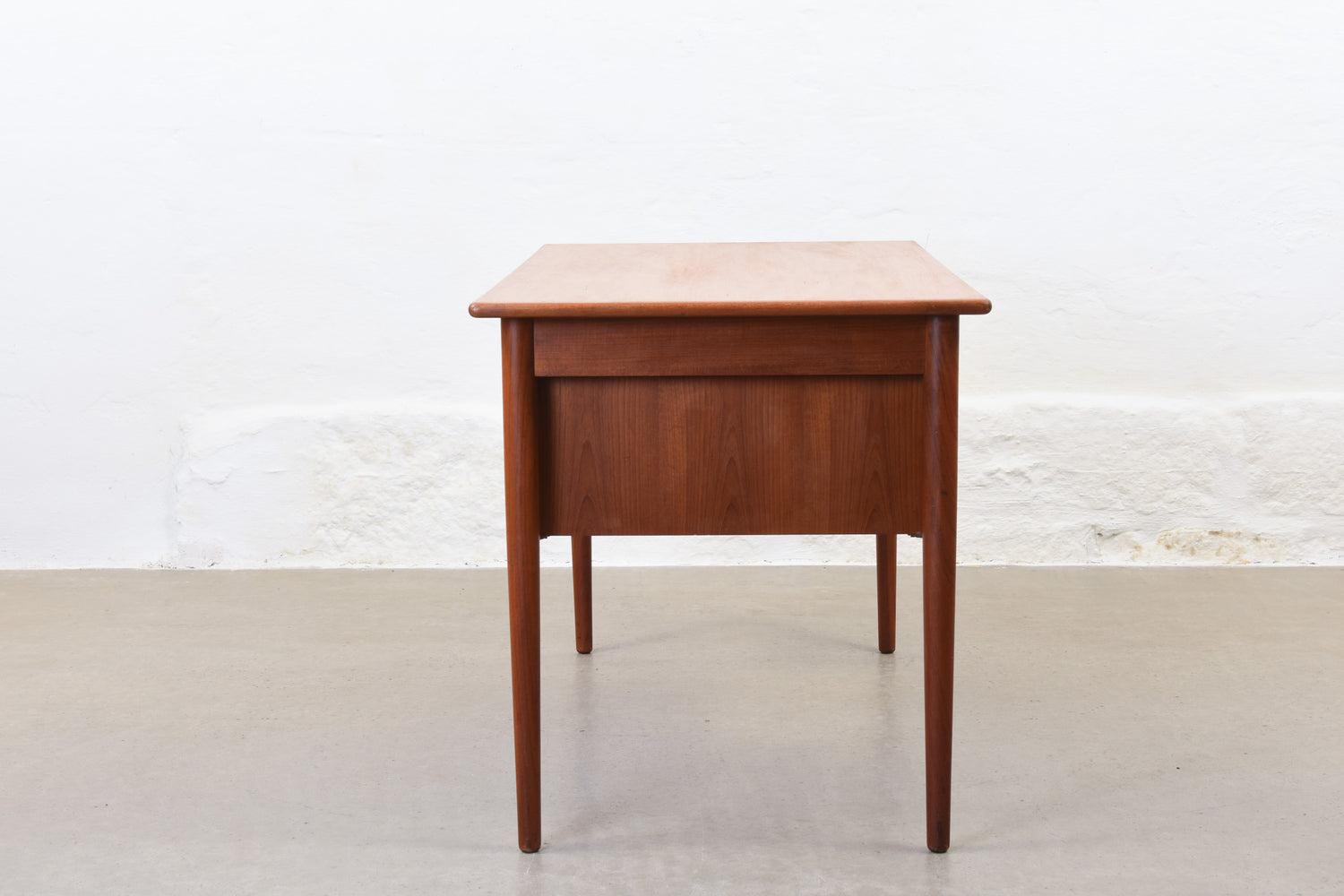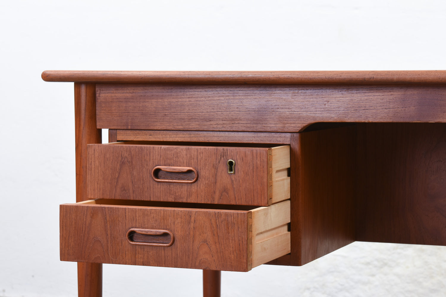 Twin pedestal desk in teak with a selection of four drawers and rear bookshelf.