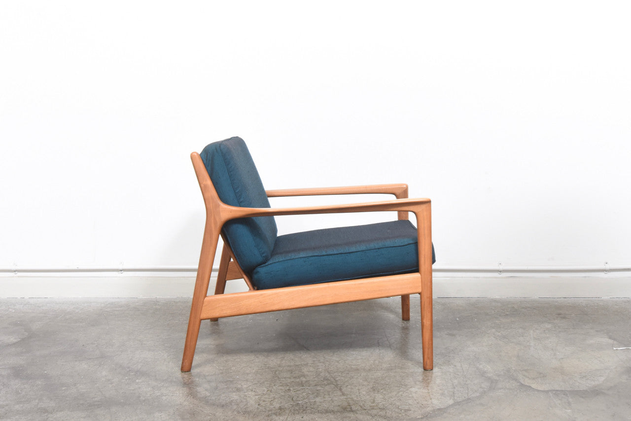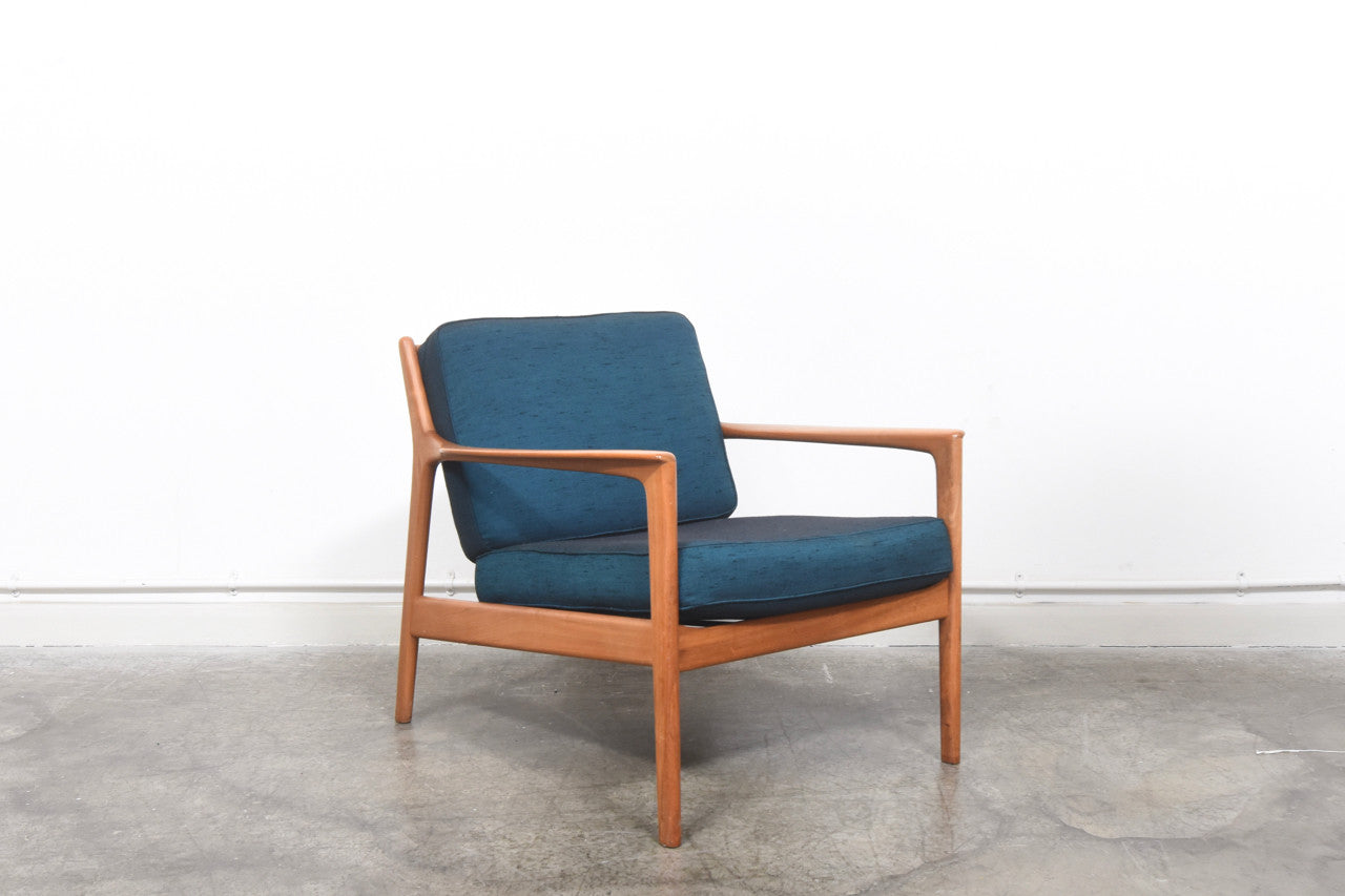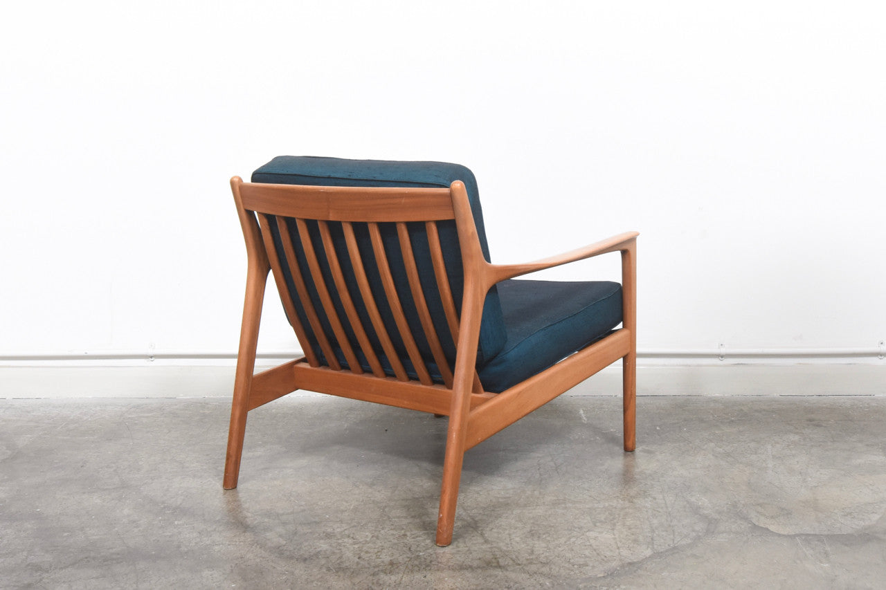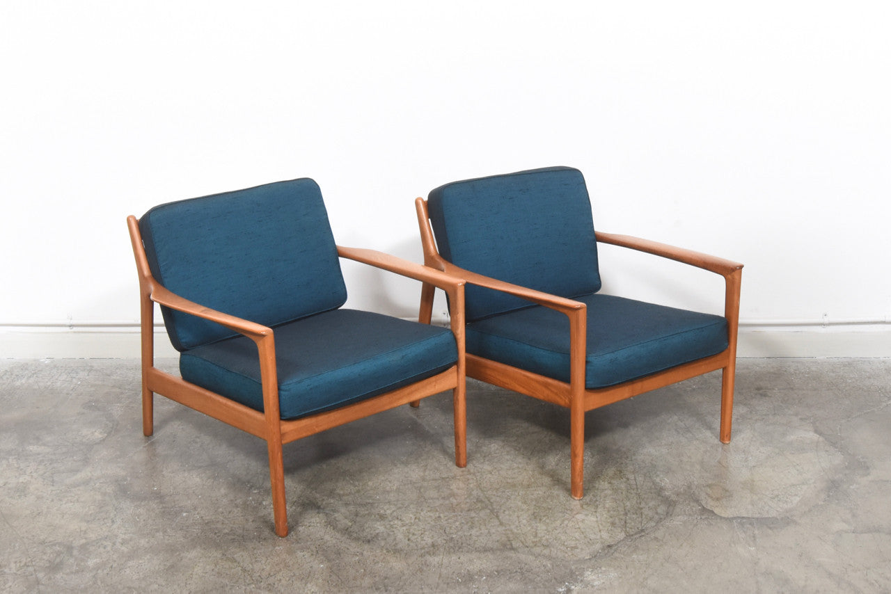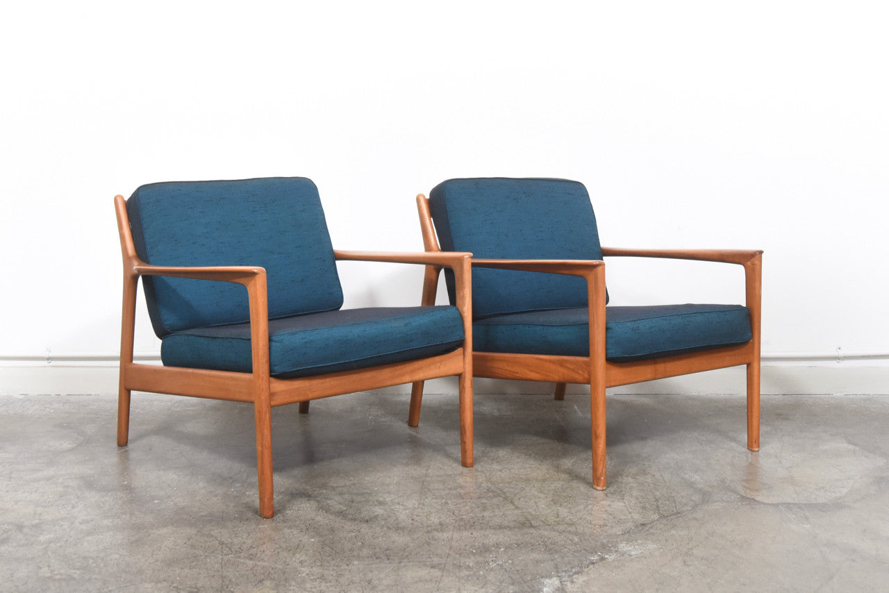 Stunning pair of model USA 75 low back lounge chairs designed by Folke Ohlsson for DUX. Chairs feature walnut frames and their original covers with new foam cushions. Sweden, 1960s.