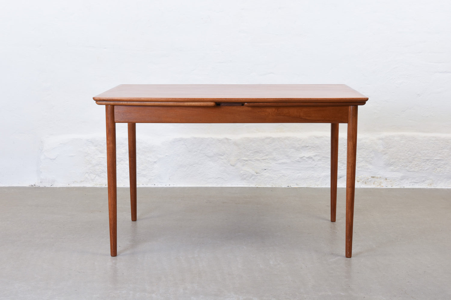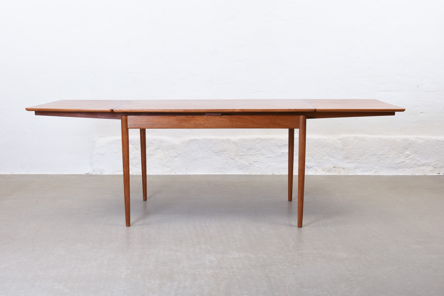 Extending dining table in teak with two hidden pull out extension leaves. Sits six normally and up to eight comfortably when fully extended.