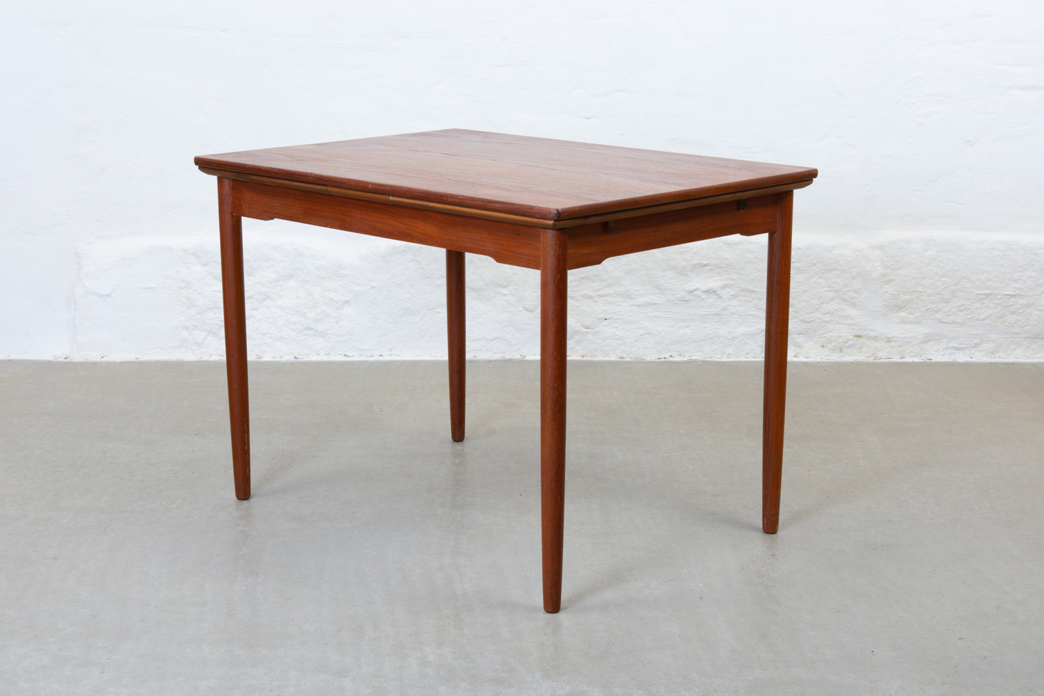 Extending dining table in teak with hidden pull-out extension leaves. When fully extended will sit up to six comfortably.
