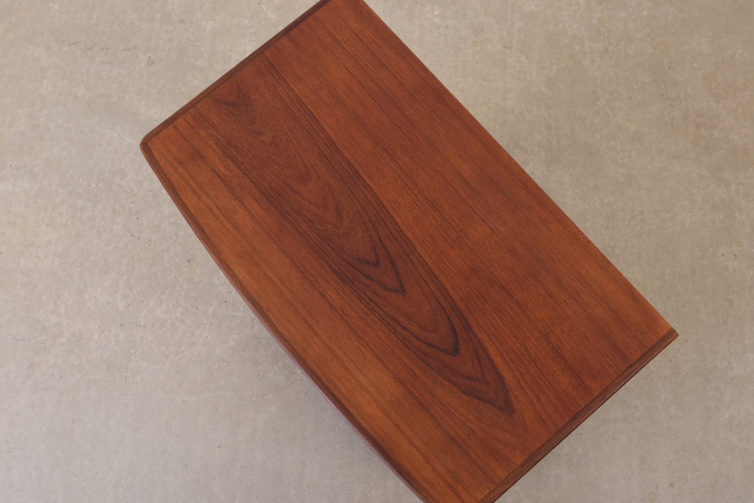 Bow-fronted chest of six drawers in teak with inset handles. Sits on an oak base.