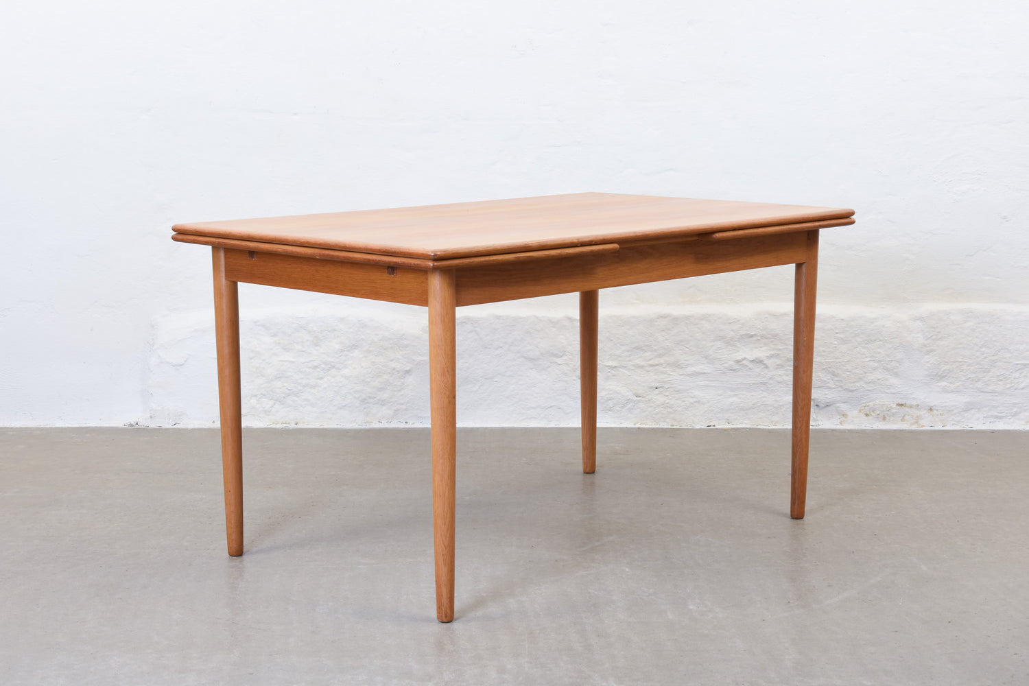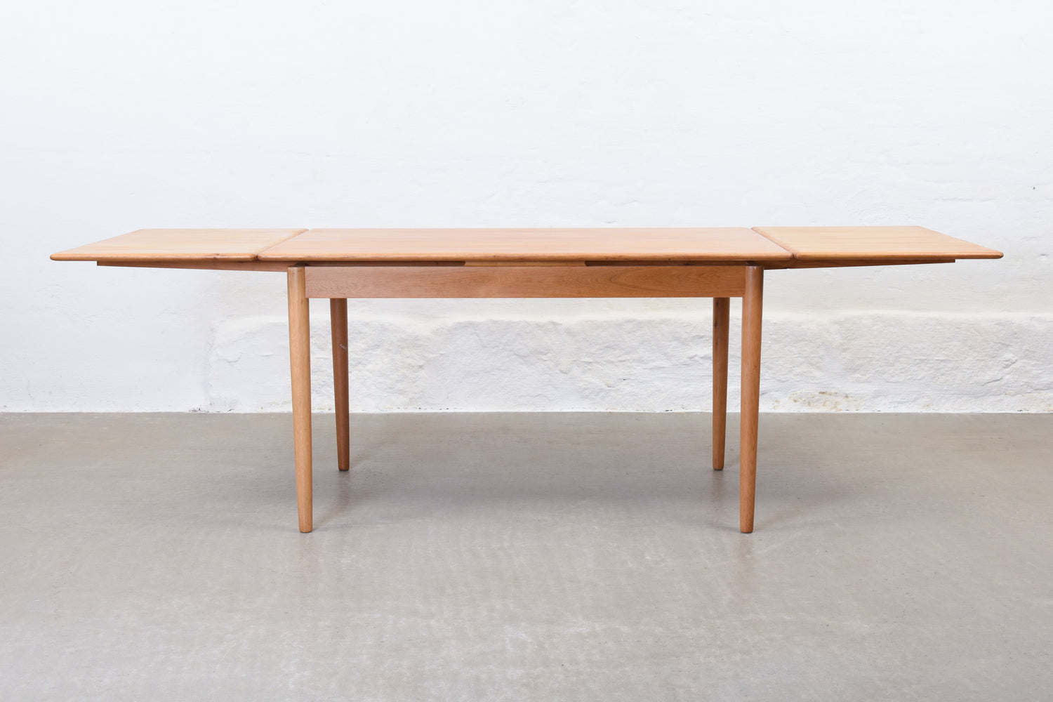 Extending dining table in oak with two hidden pull out extension leaves. Sits six normally and up to eight comfortably when fully extended.