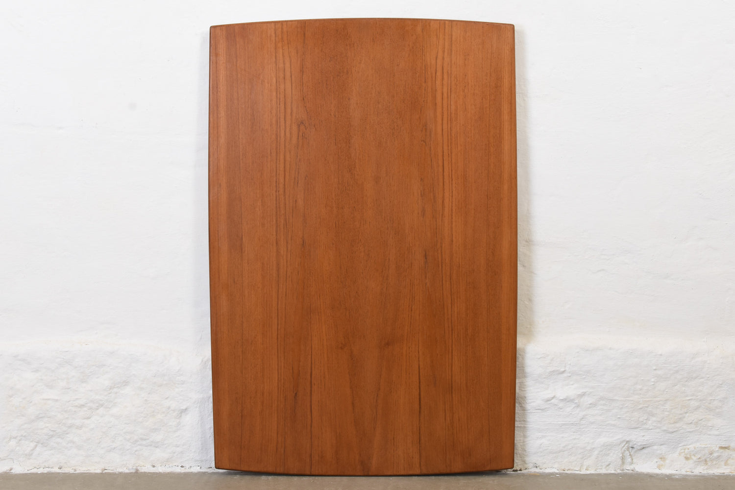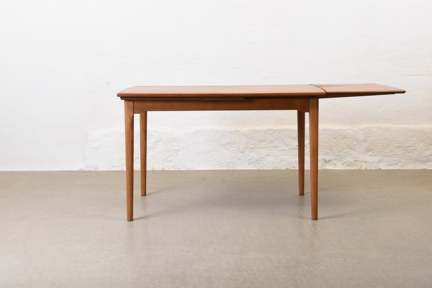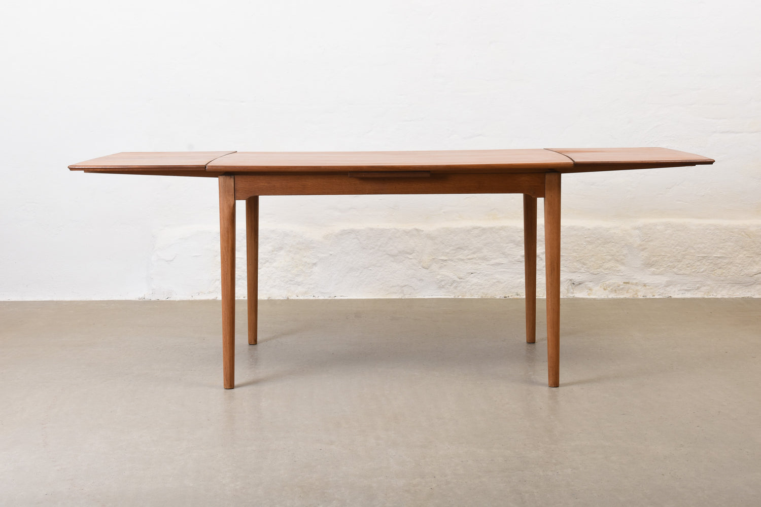 Extending boat-shaped dining table in teak on an oak base. Sits six normally and up to eight comfortably when fully extended.