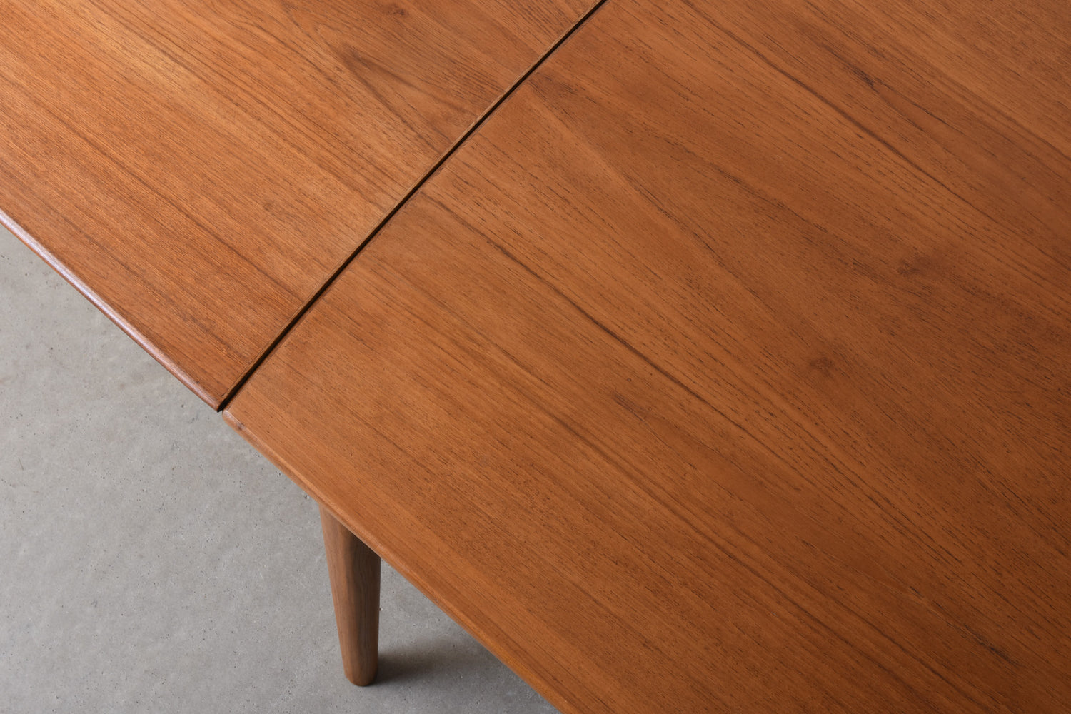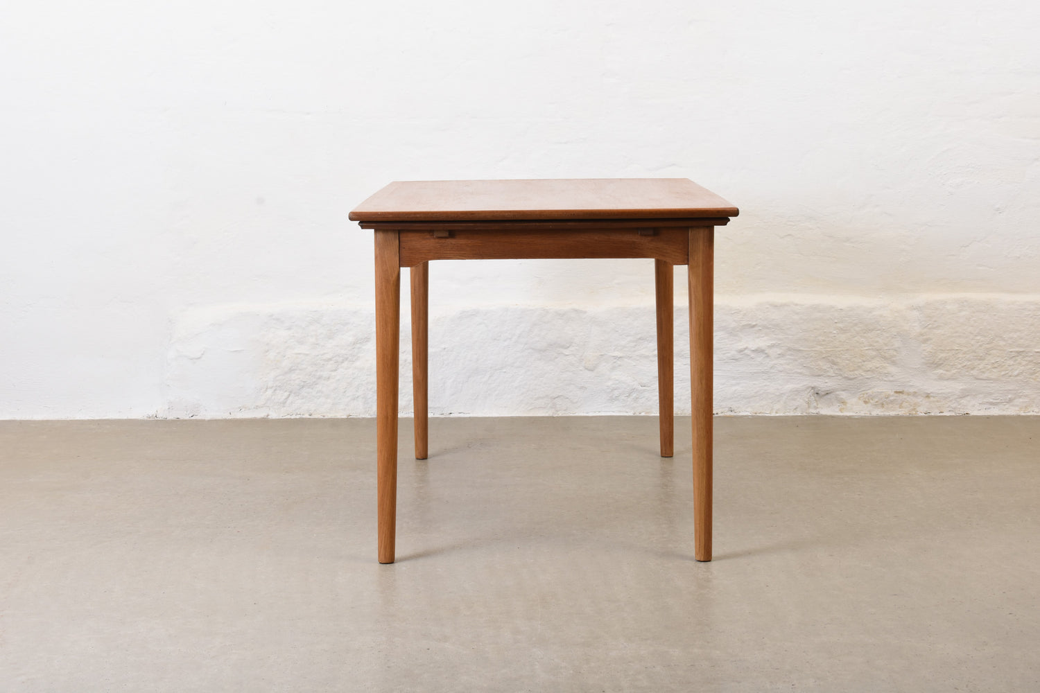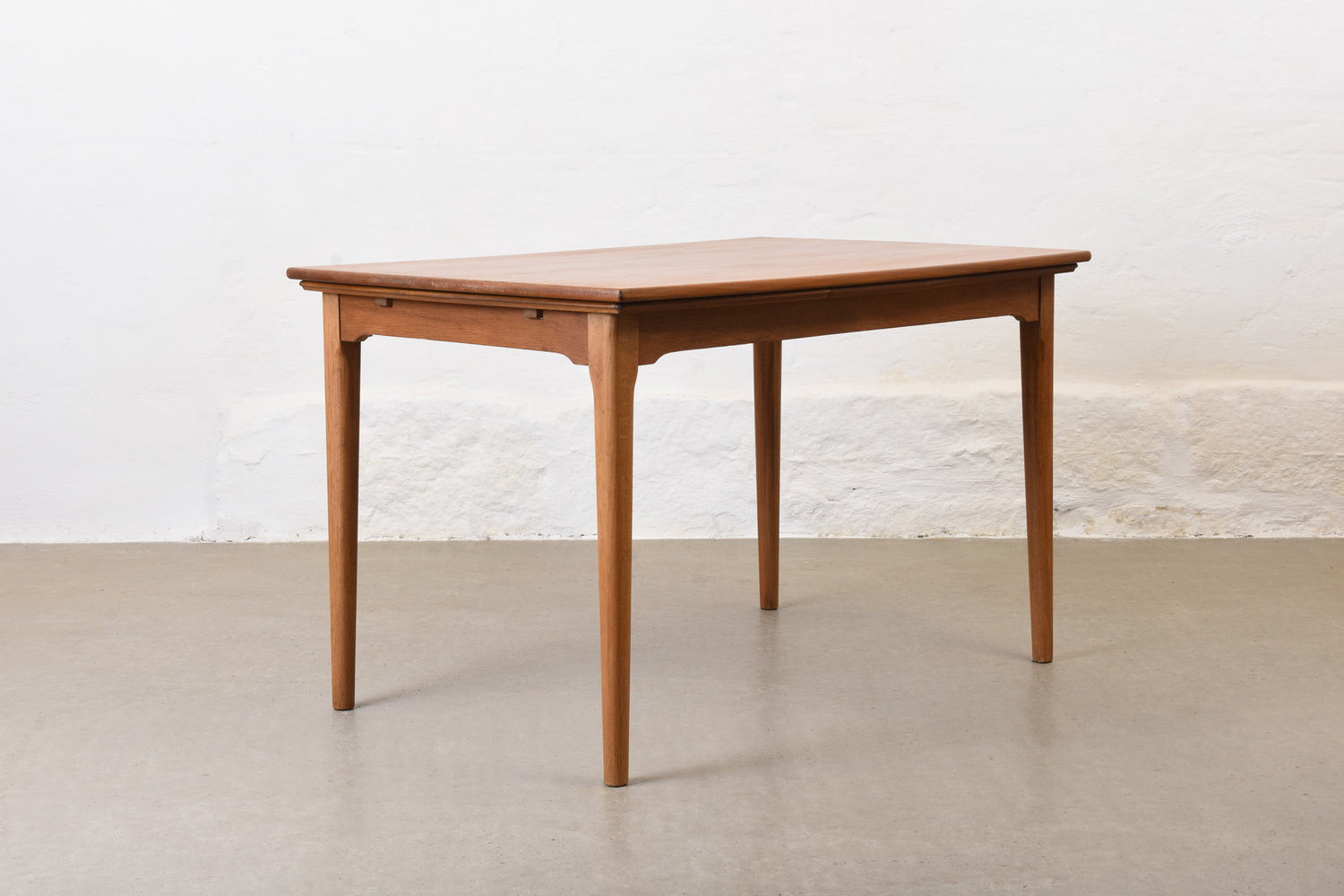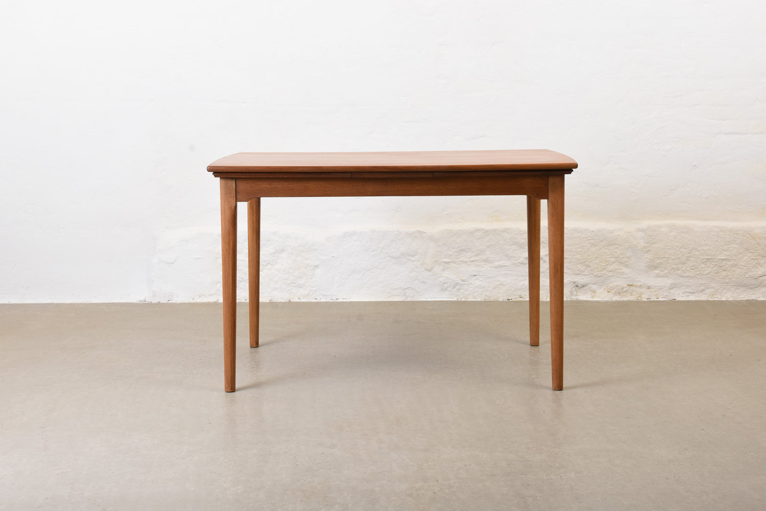 Extending boat-shaped dining table in teak on an oak base. Sits six normally and up to eight comfortably when fully extended.