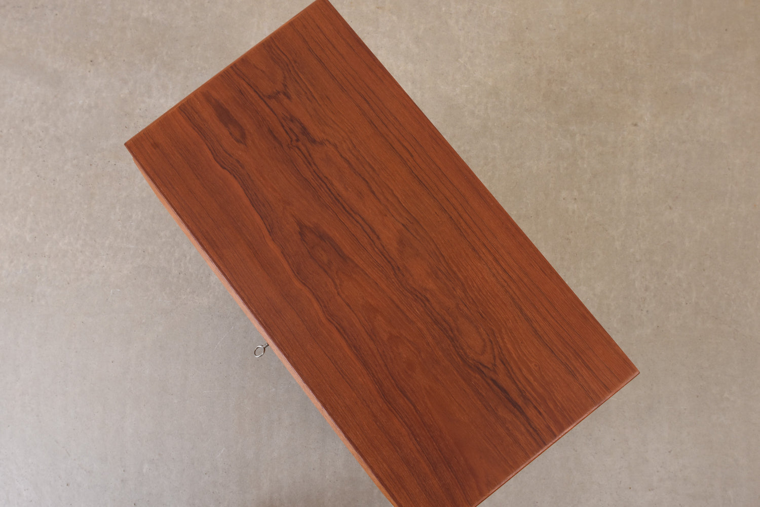 Teak chest of six drawers with lipped handles and locking top drawer (original key included). Sits on tapered solid teak legs.