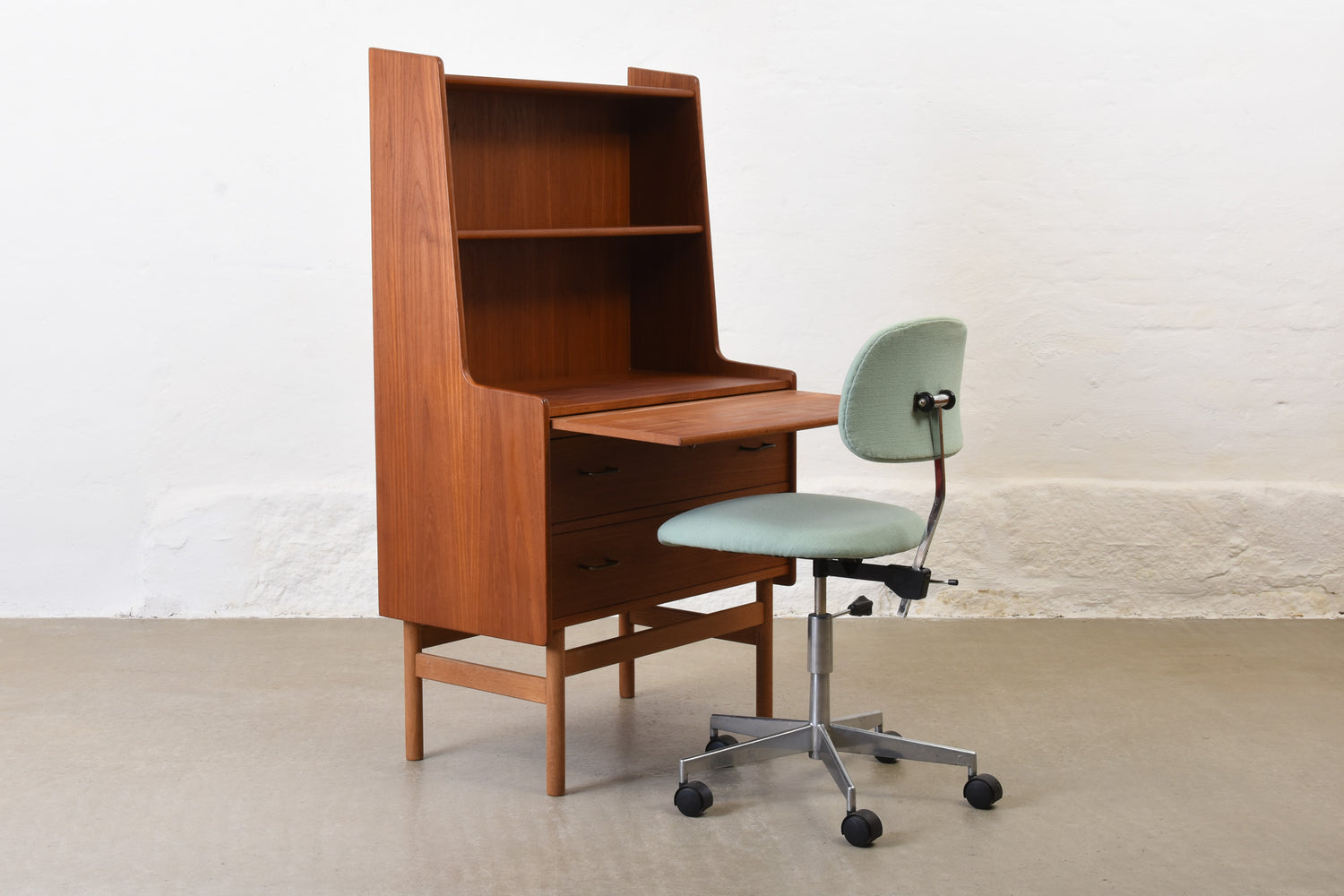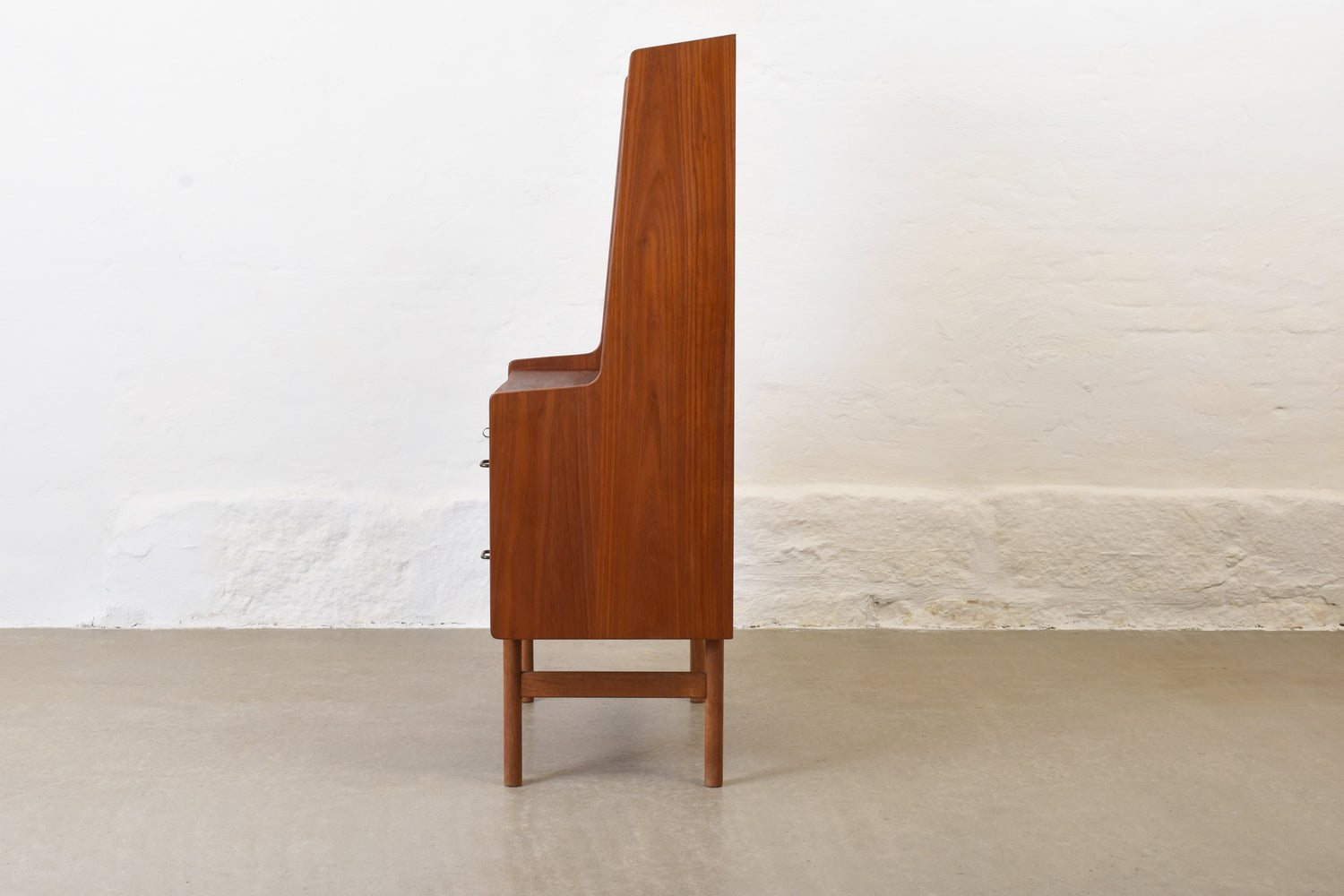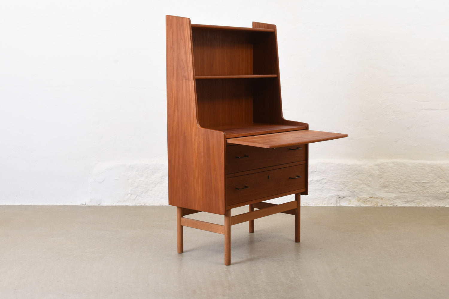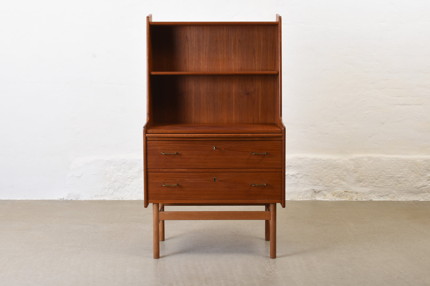 Teak secretary with bookshelf, hidden pull-out worktop and two locking drawers with brass handles. Sits on an oak base.