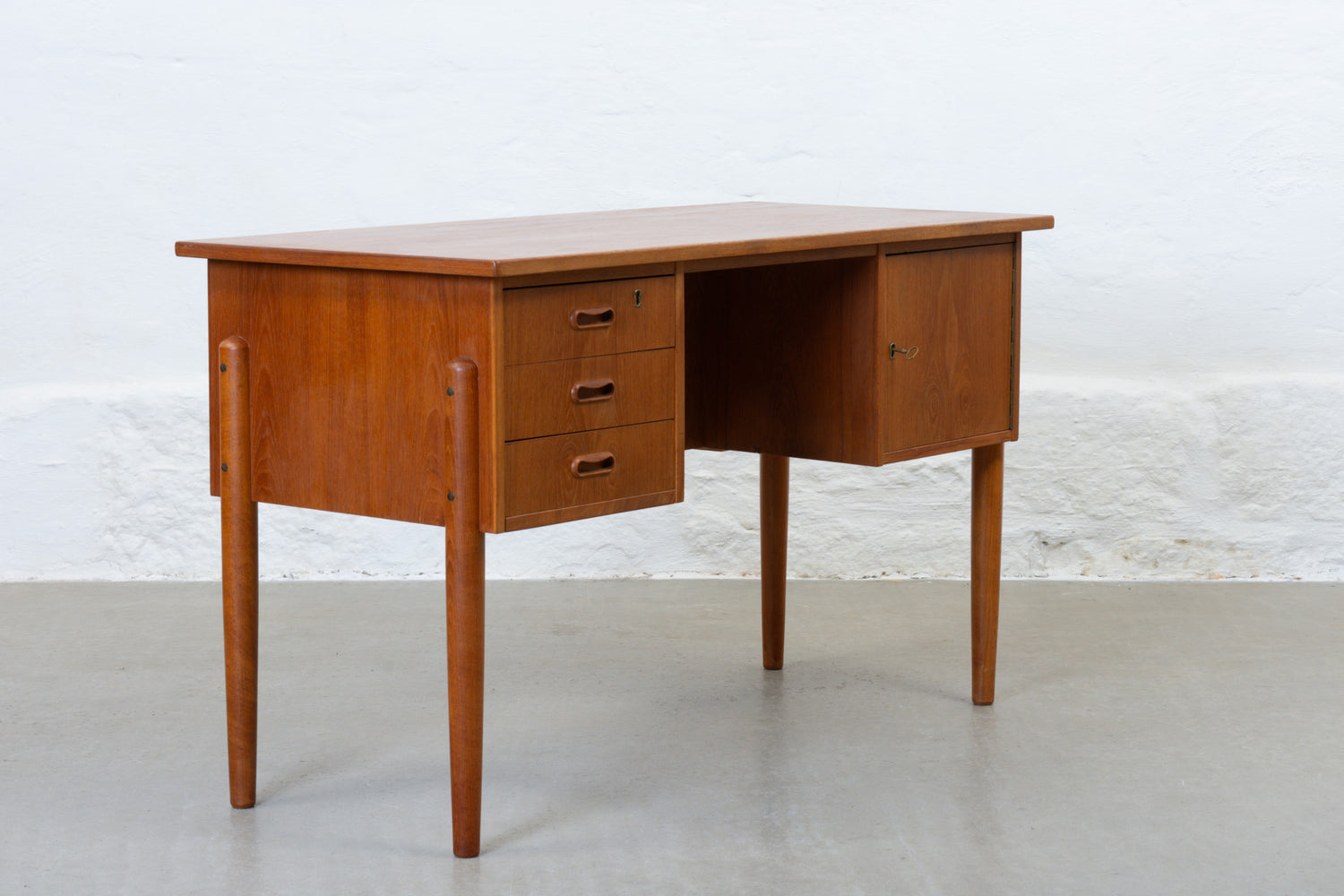 Twin pedestal desk in teak with three drawers, a locking cabinet and rear bookshelf. Original key included.