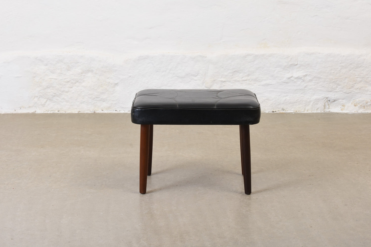 Vintage footstool with padded top upholstered in black vinyl. Sits on turned teak legs.