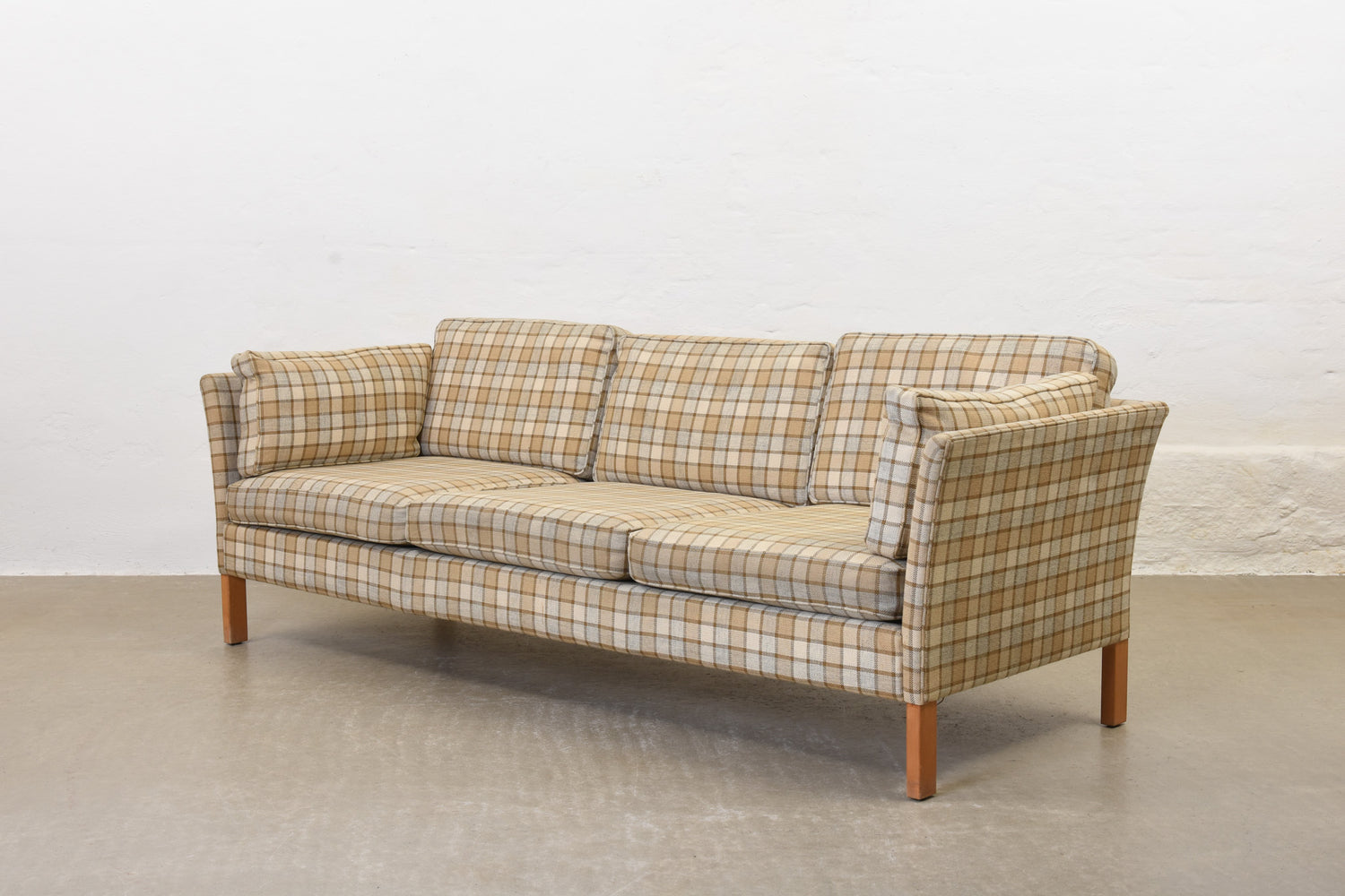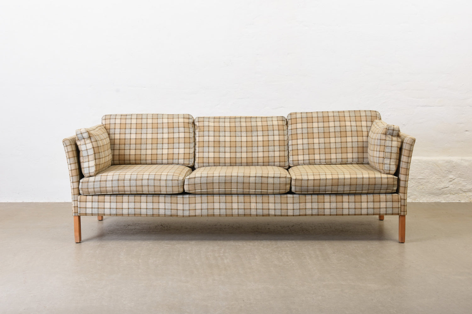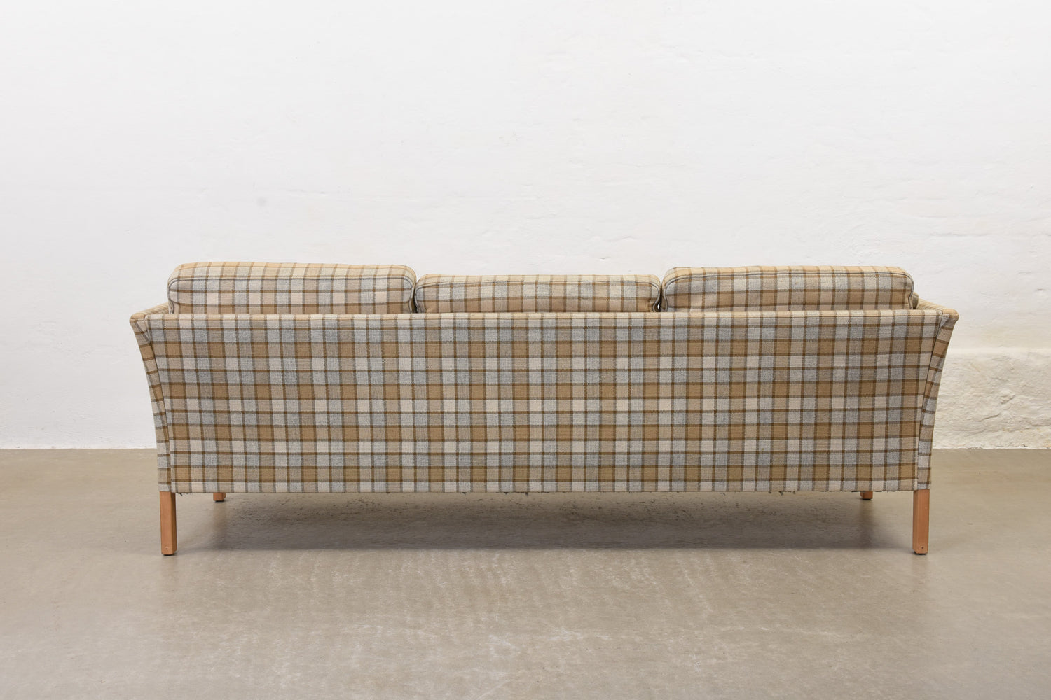 Vintage 'EJ-260' three seat sofa upholstered in its original plaid wool fabric. Features eight loose cushions with a mixture of feather and foam filling. Sits on beech legs.