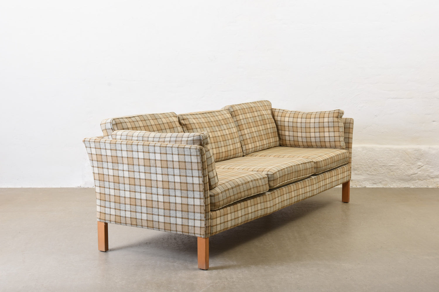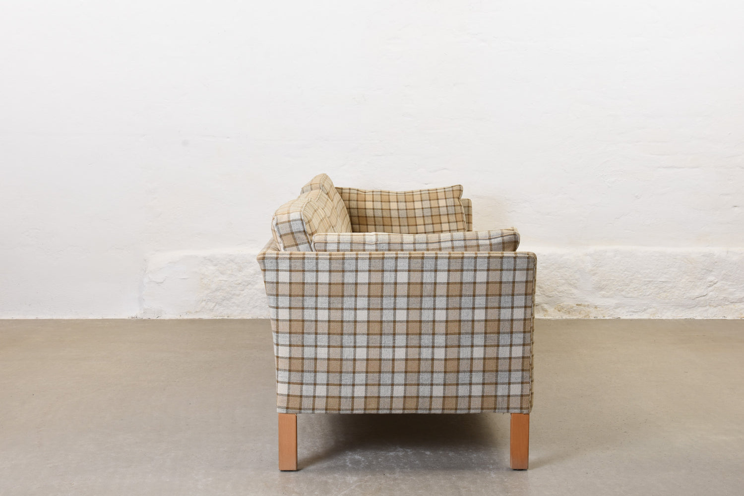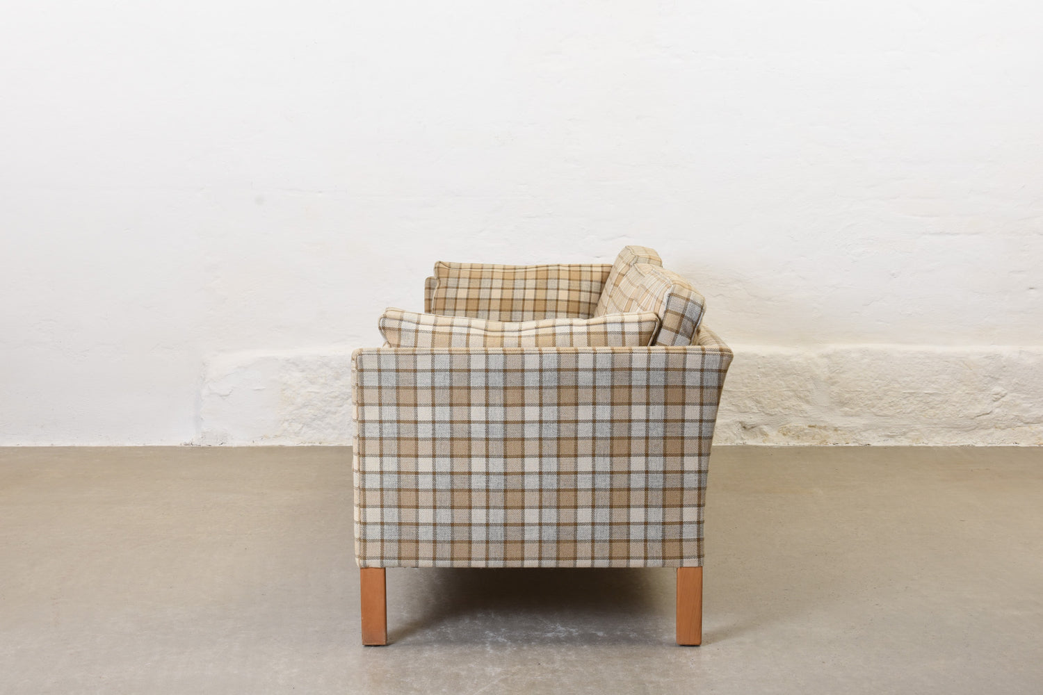 Vintage 'EJ-260' three seat sofa upholstered in its original plaid wool fabric. Features eight loose cushions with a mixture of feather and foam filling. Sits on beech legs.