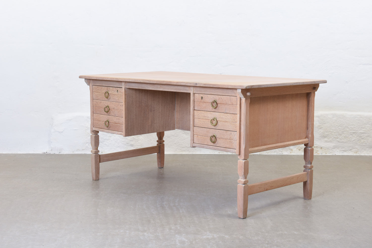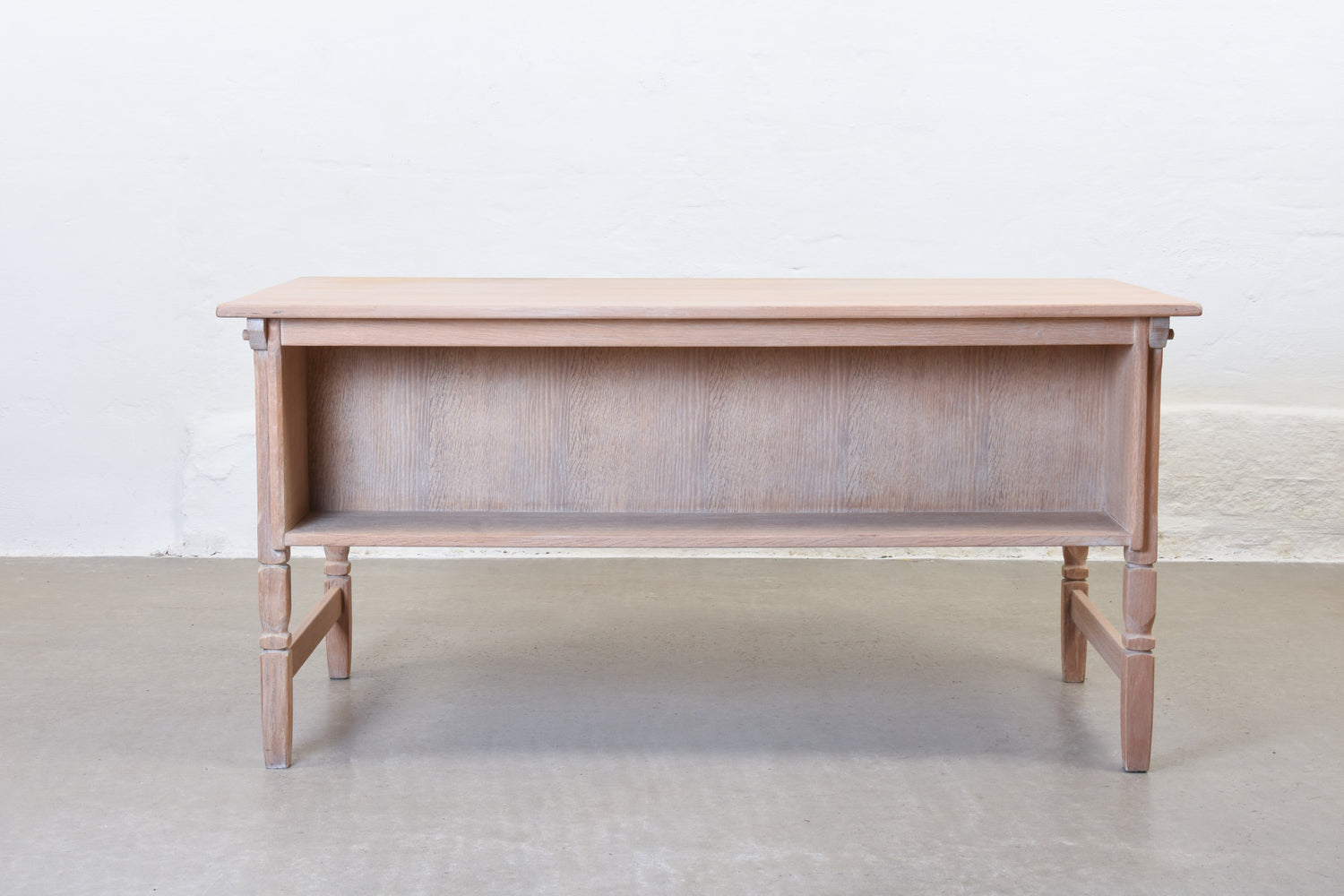 Twin pedestal desk in soaped oak with a selection of six drawers with brass handles and rear bookshelf.