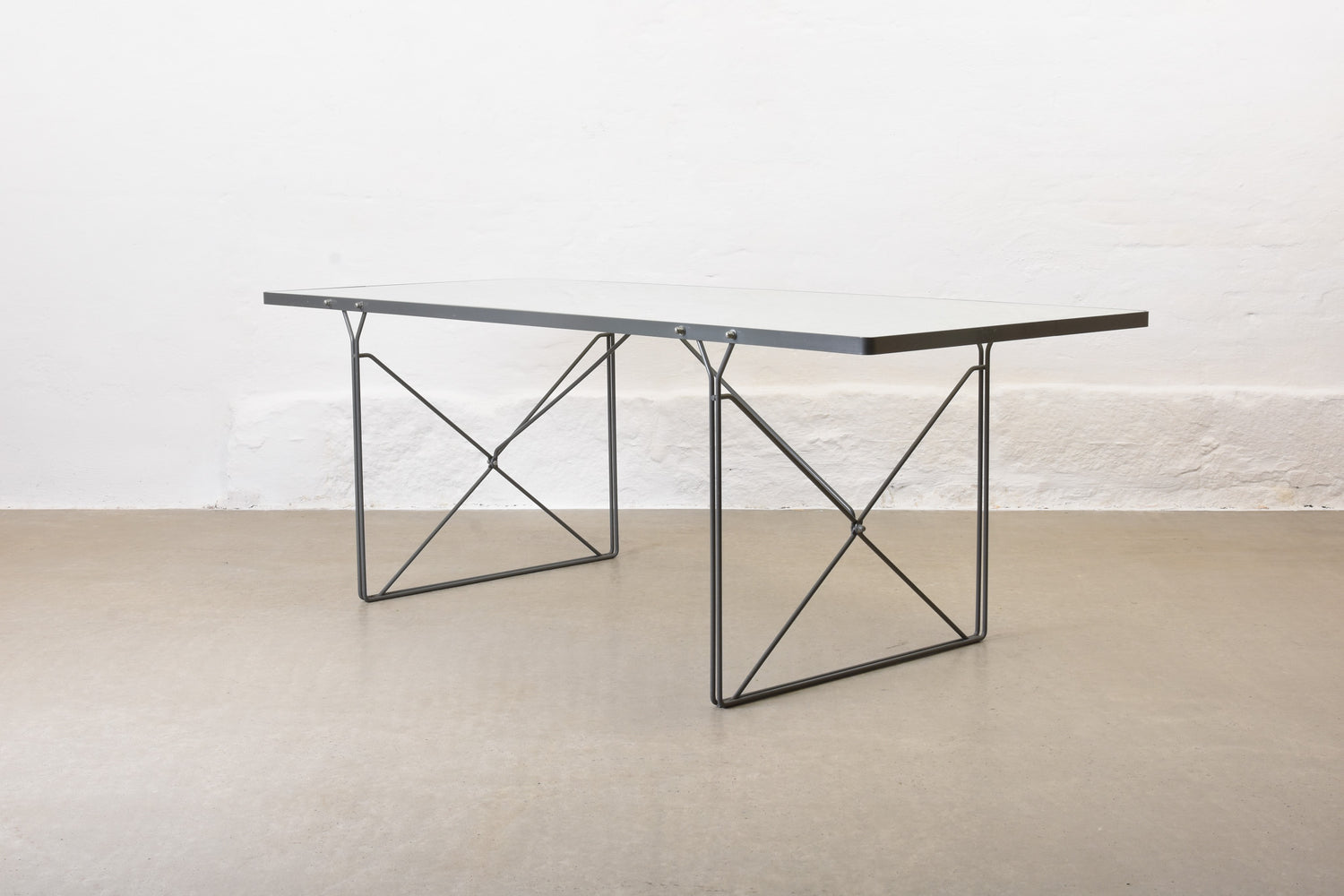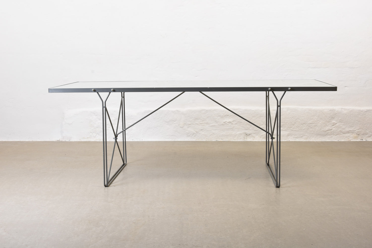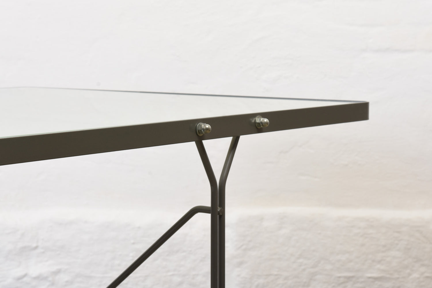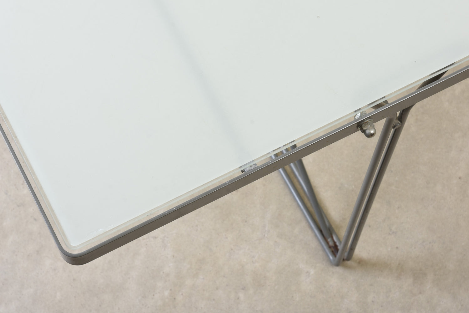 Dining table with a powder-coated steel frame and frosted glass tabletop.
