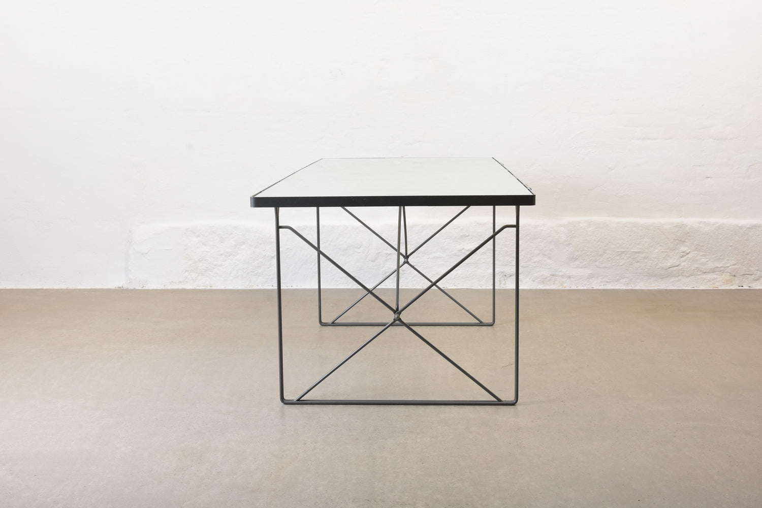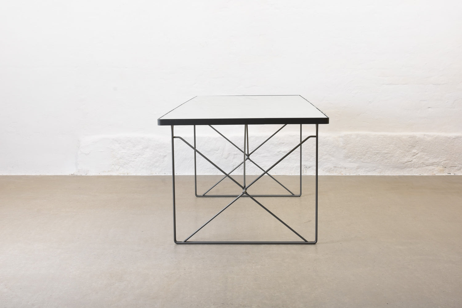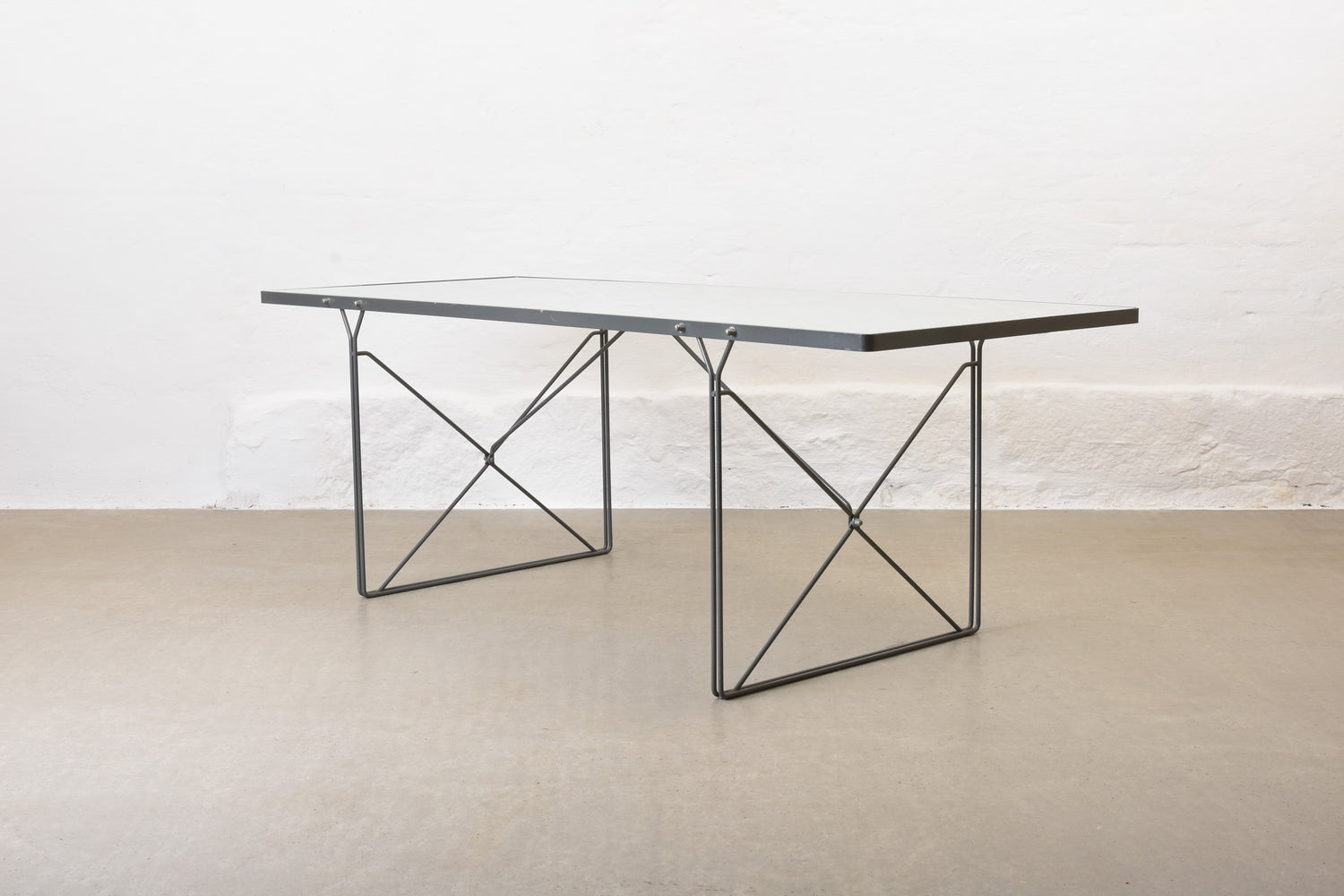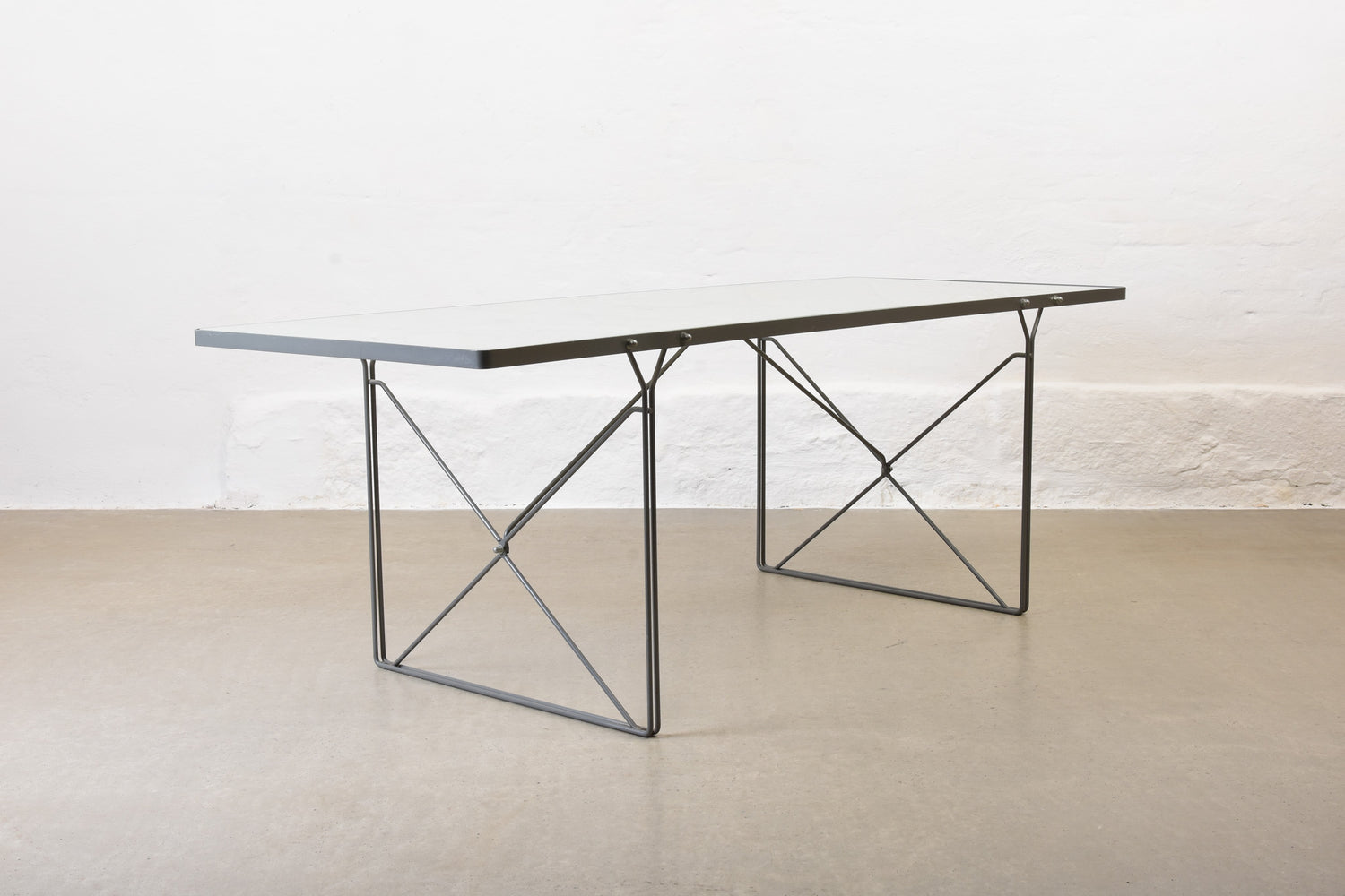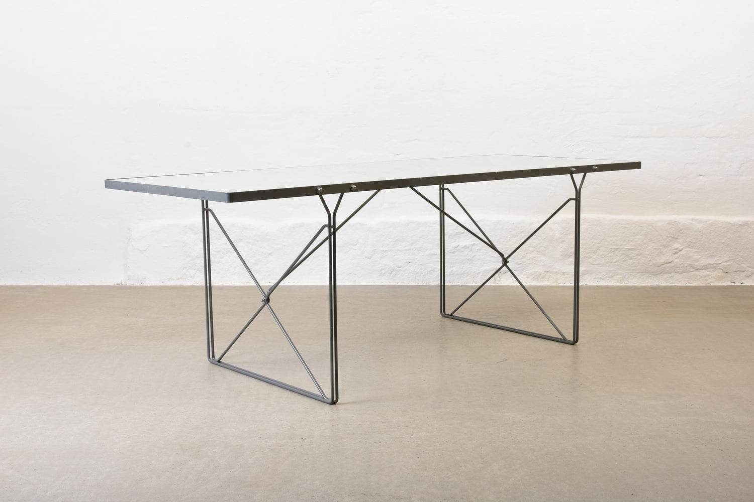 Dining table with a powder-coated steel frame and frosted glass tabletop.