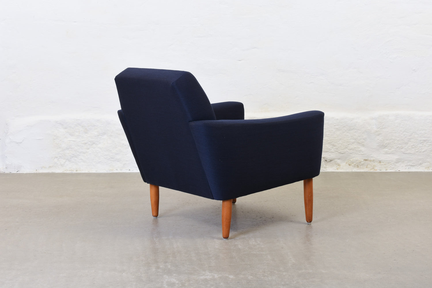 Low back lounge chair on turned beech legs. Newly reupholstered in navy wool.