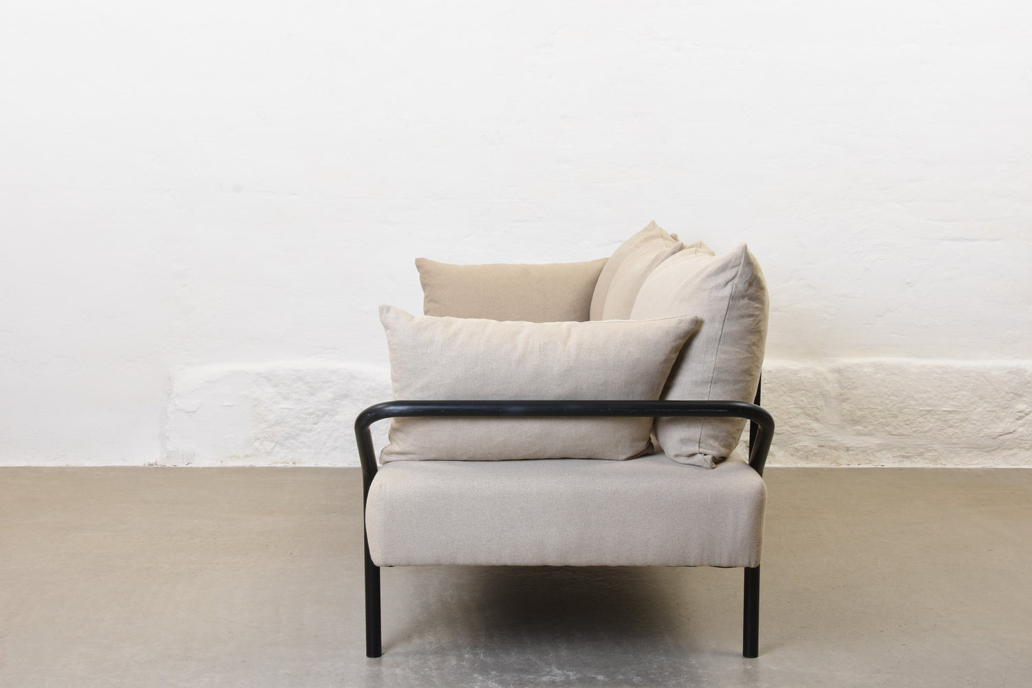 Vintage daybed with a black-lacquered metal frame, five loose foam-filled cushion and sprung mattress all newly reupholstered in 100% linen.