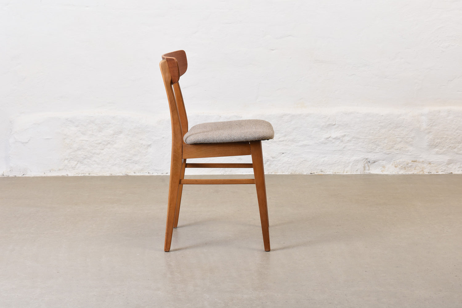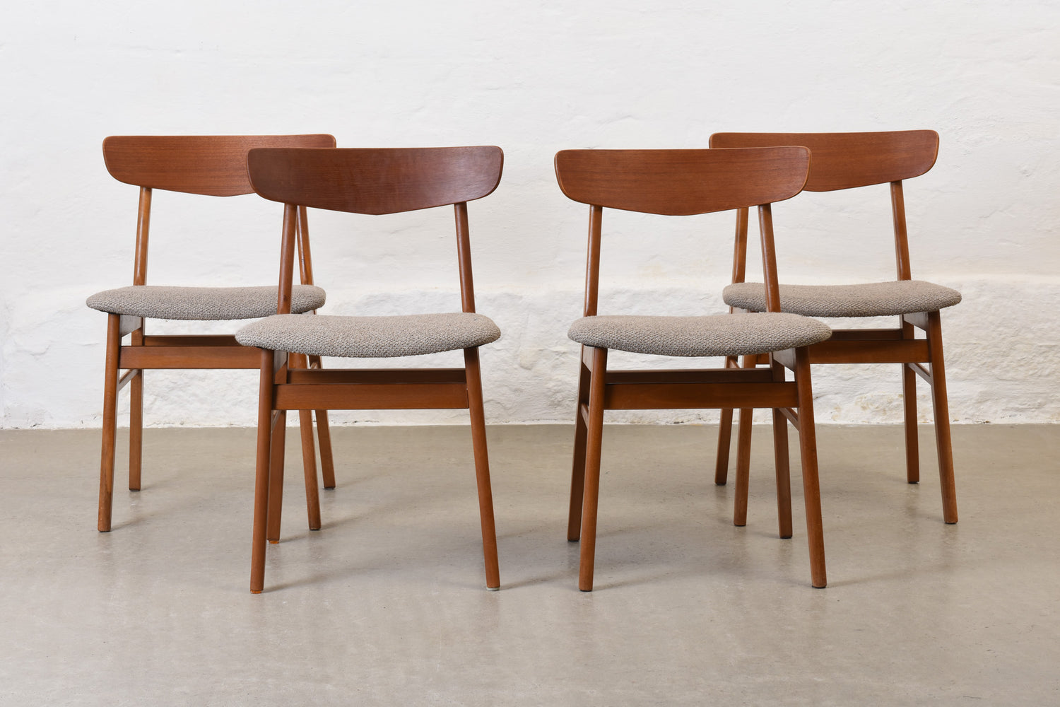 Set of four 'Mosbøl' dining chairs with teak backs, beech frames and padded seats newly reupholstered in a textured cotton/wool blend by Yarn Collective.