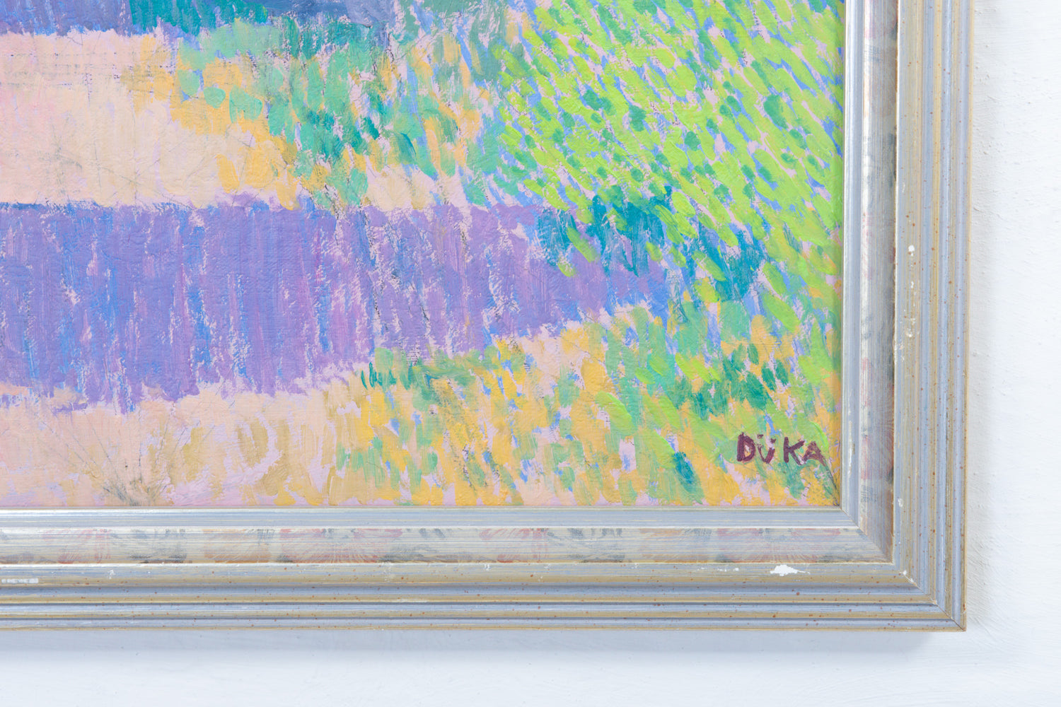 Signed by ‘Düka’, it appears the artist was inspired by the Impressionist approach of working outdoors in order to truly feel the qualities of nature and capture its essence. We can sense the bright atmospheric conditions and the beauty of nature through softly blended blues and greens, with warmth and earthiness captured through muted pinks and oranges. The delicate balancing of these colours creates an optimistic mood, and suggests the artist viewed this scene as idyllic.