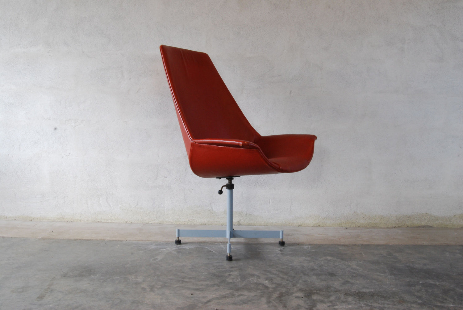 Height adjusting swivel chair by KEVI. Upholstered in red leather. Sits on steel base.