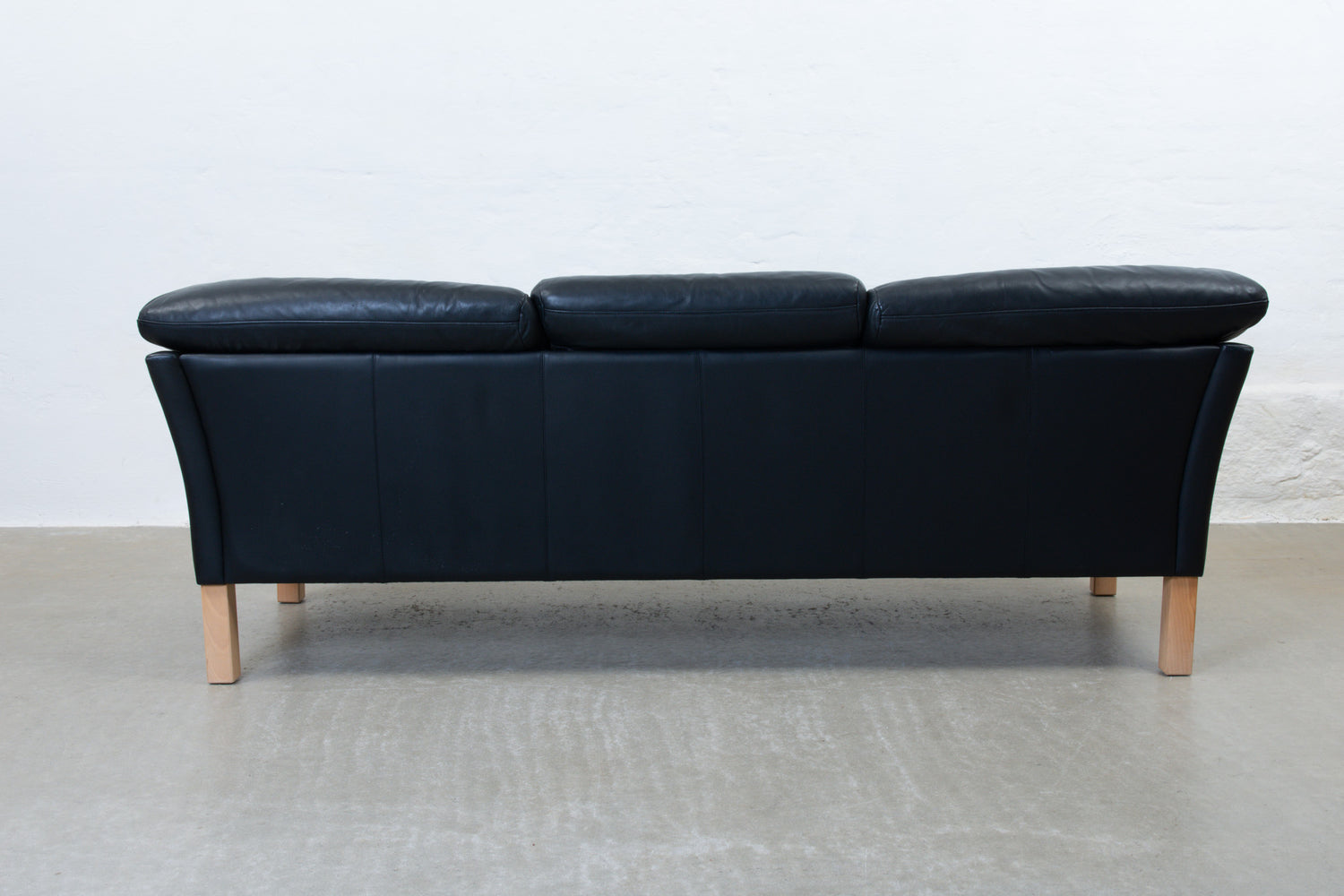Three seat sofa upholstered in black leather. Features six loose foam-filled cushions and sits on squared beech legs.