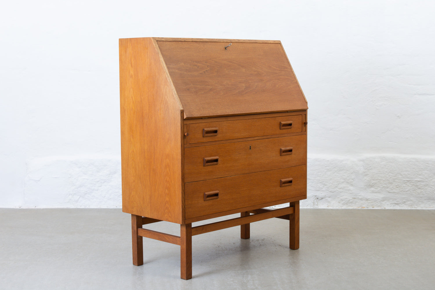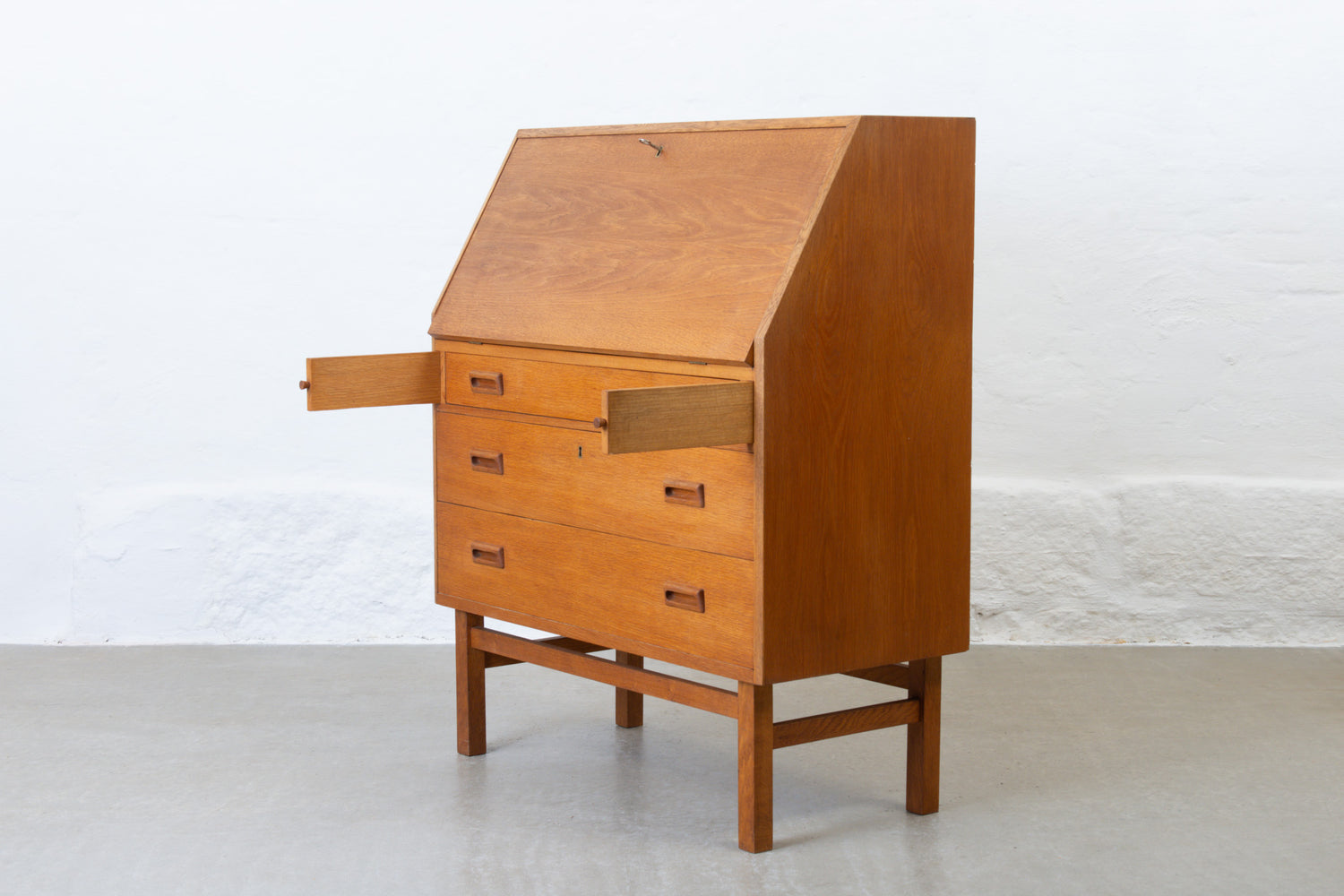 Secretary in oak with locking drop-down worktop. Features a selection of internal drawers/storage compartments and three low drawers.
