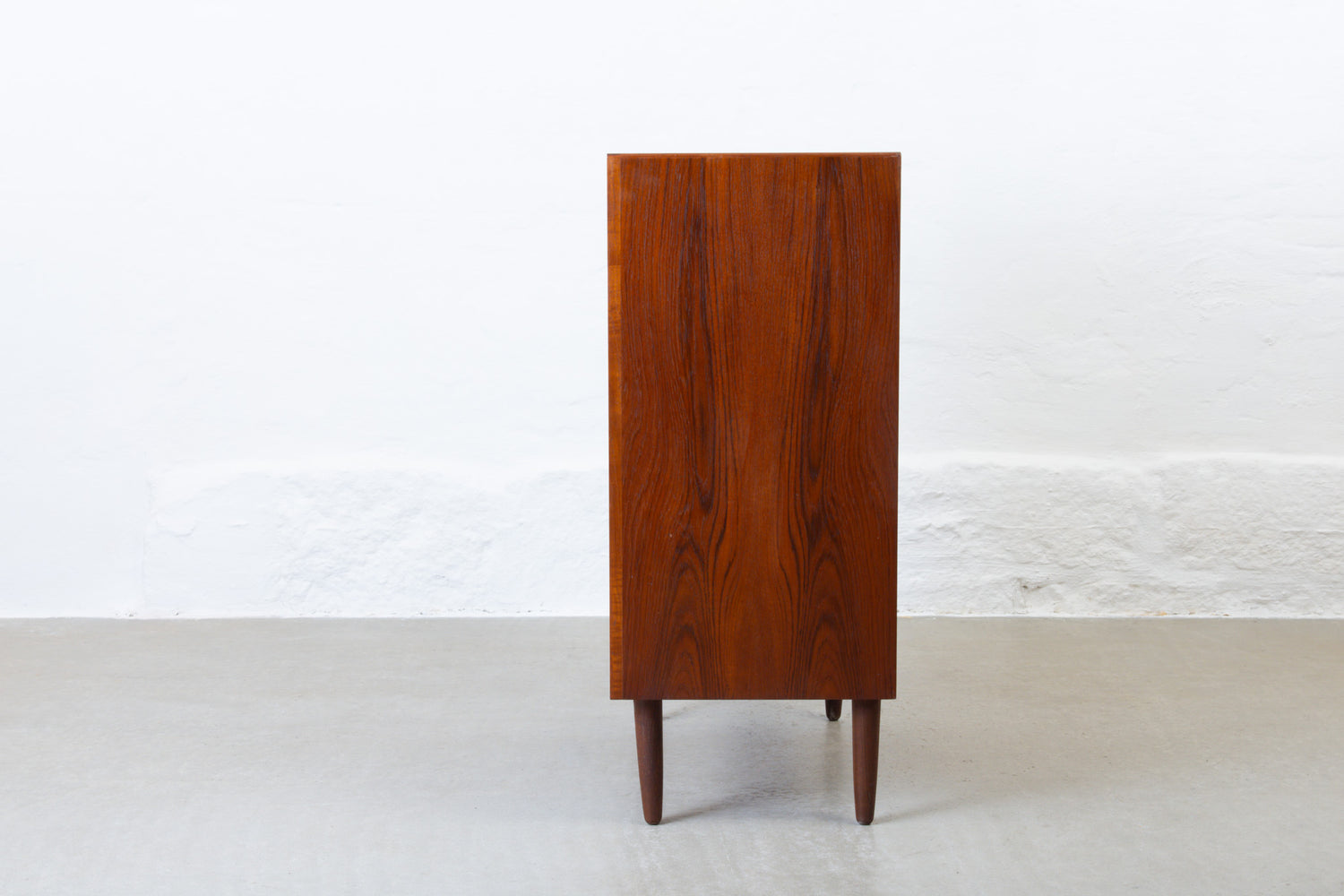 Teak chest of six drawers with lipped handles. Sits on turned solid teak legs.