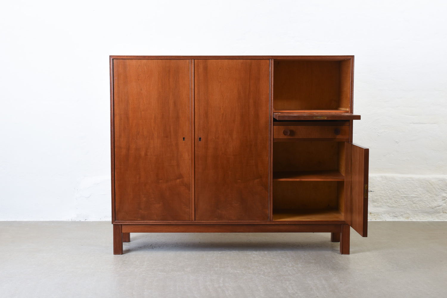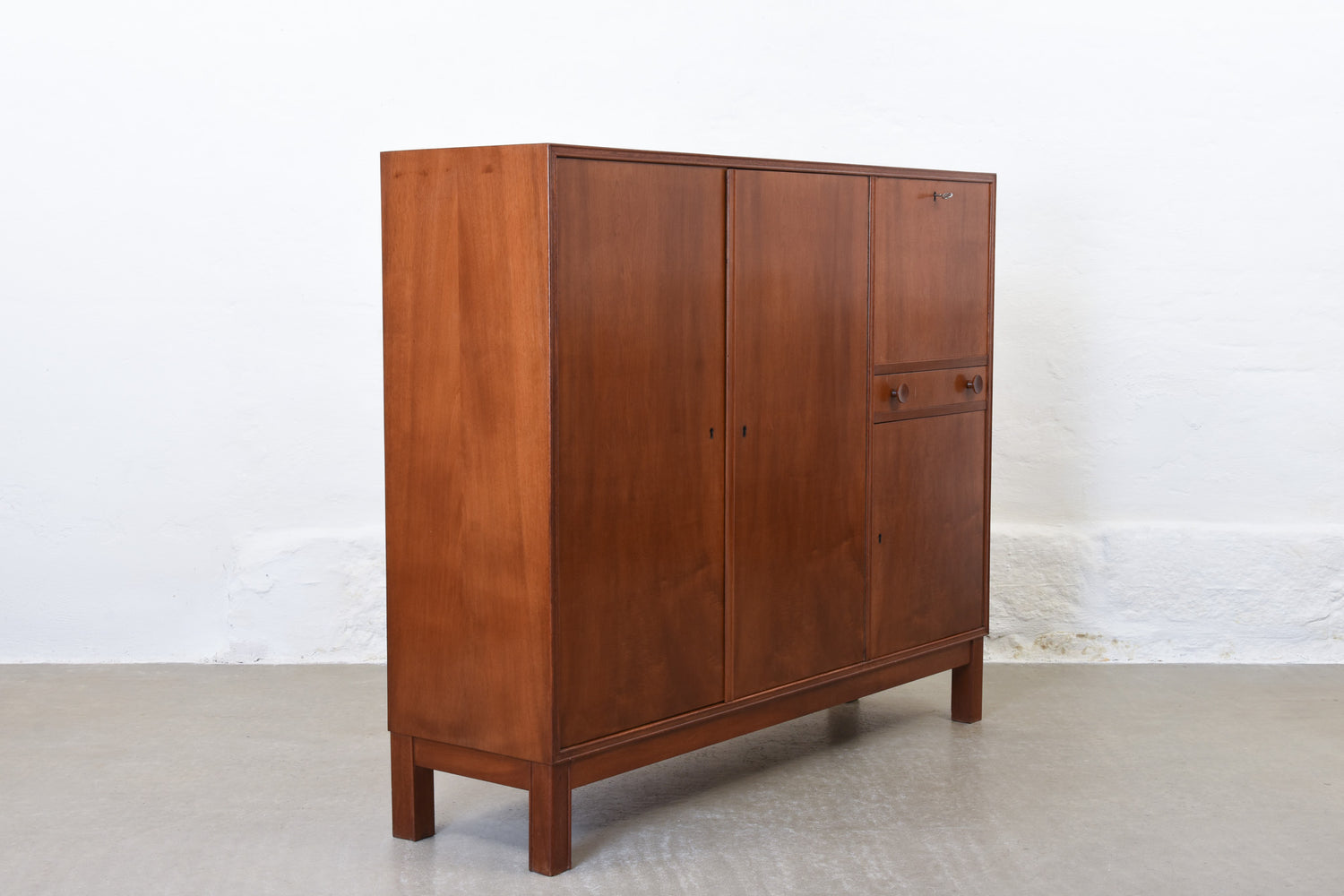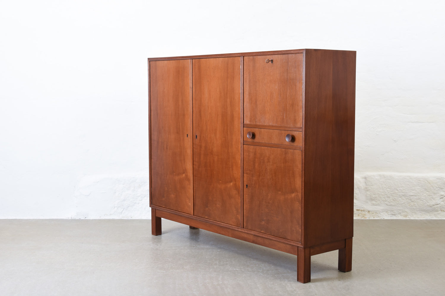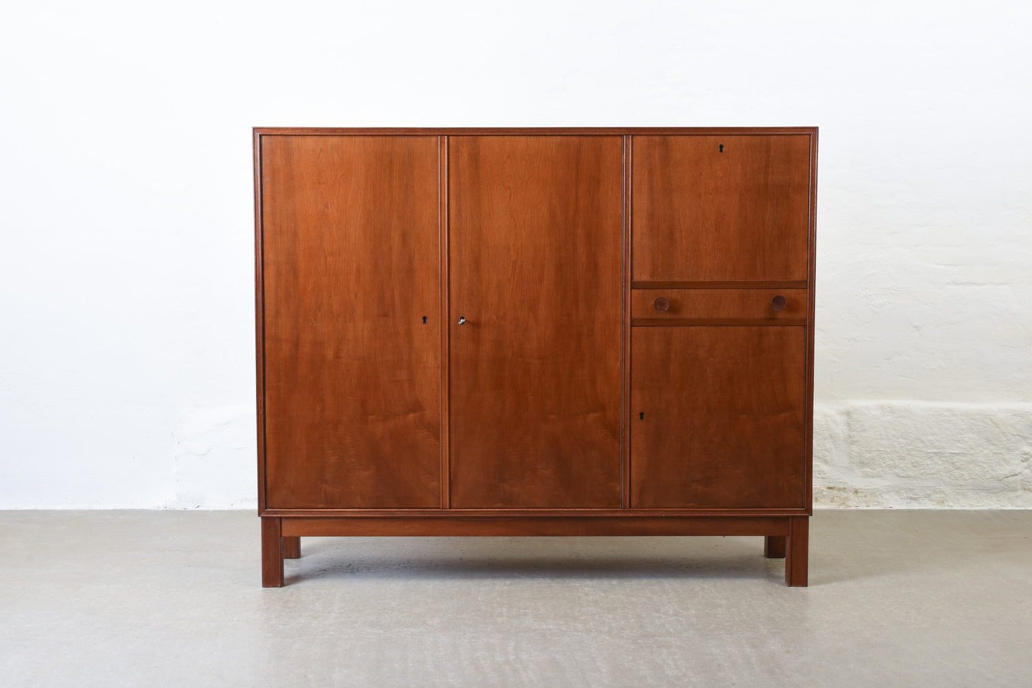 Large storage cabinet in walnut with a selection of locking cupboards and one drawer.