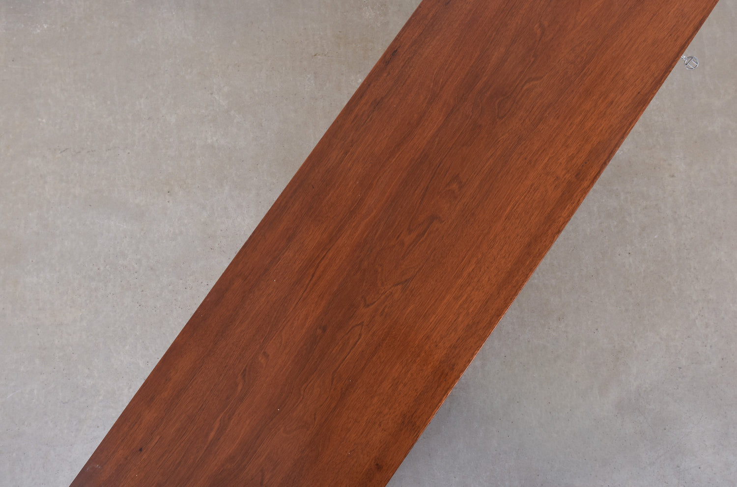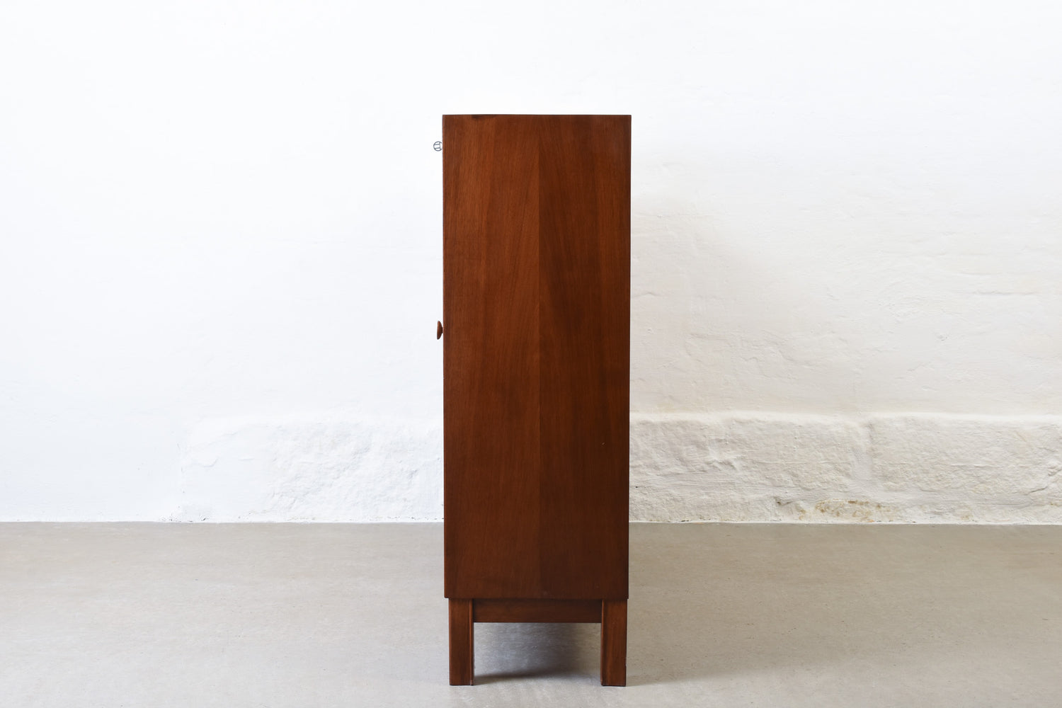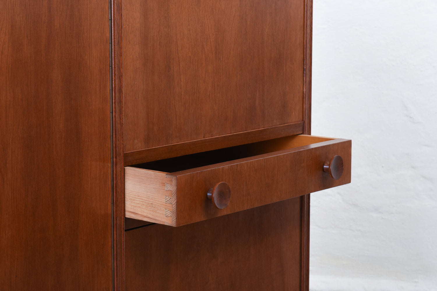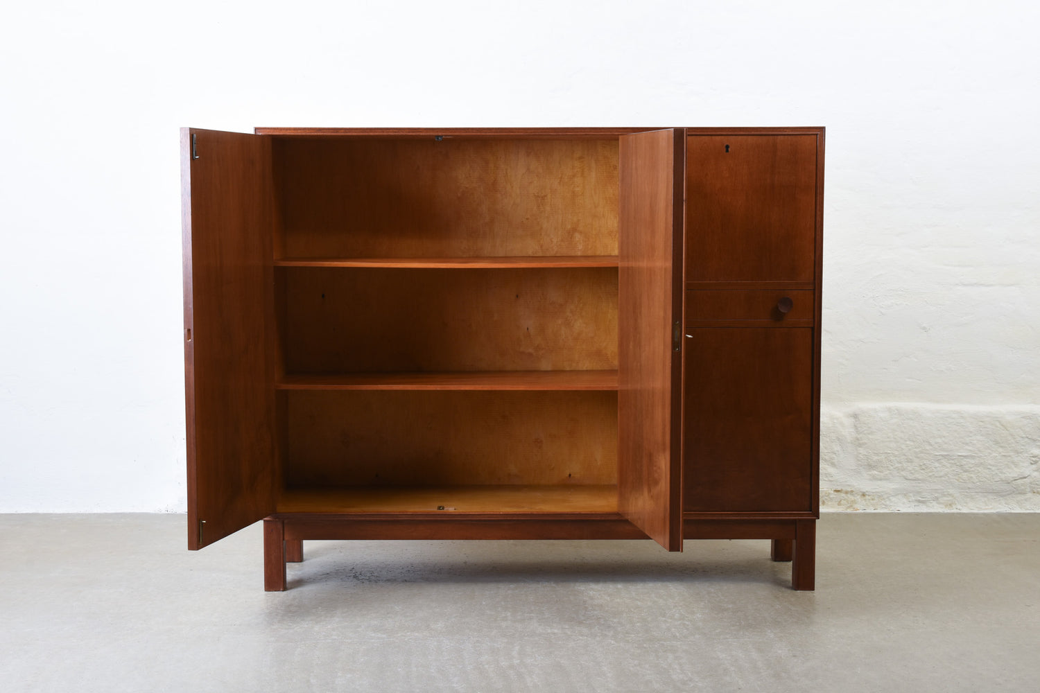 Large storage cabinet in walnut with a selection of locking cupboards and one drawer.