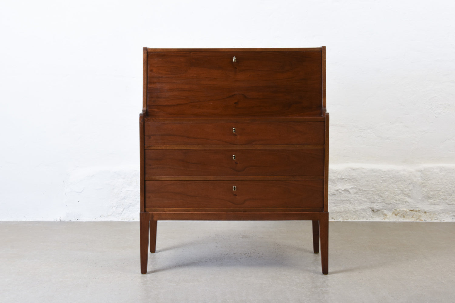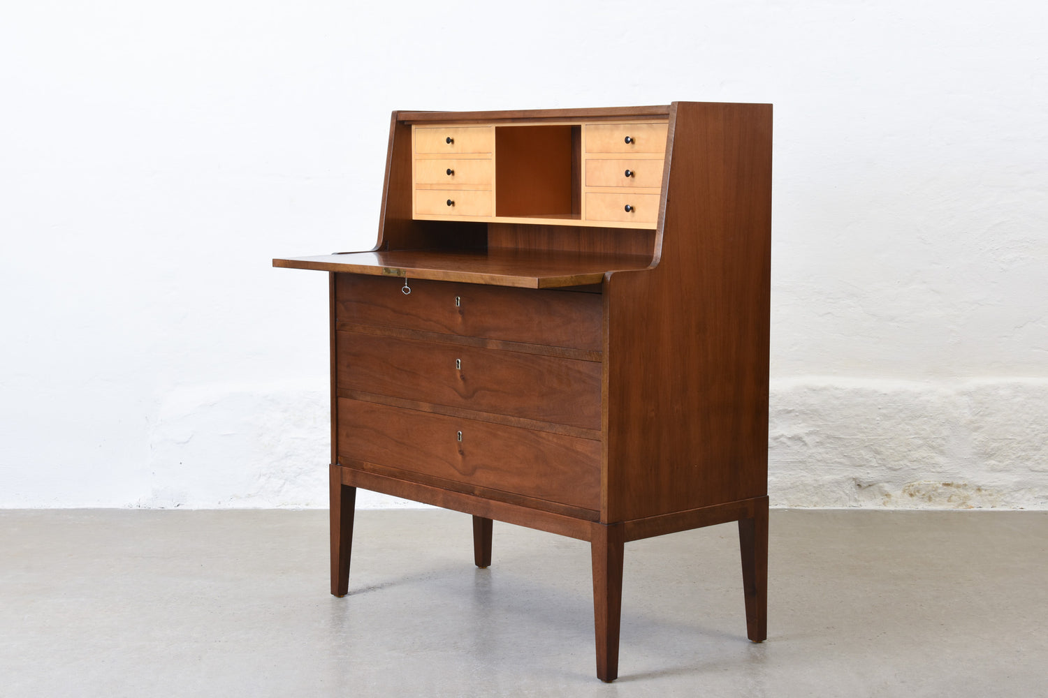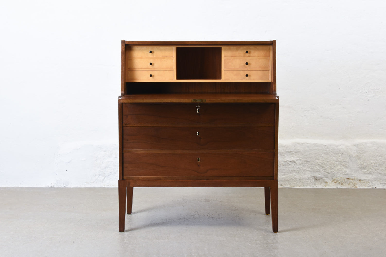 Secretary in walnut with locking drop-down worktop. Features a selection of six small drawers in birch as well as three deep oak-lined locking drawers.