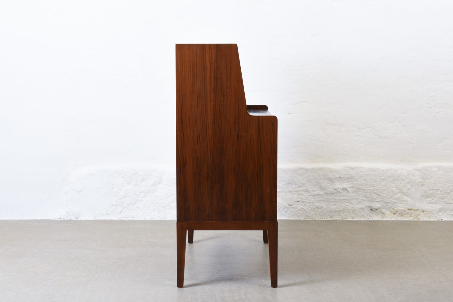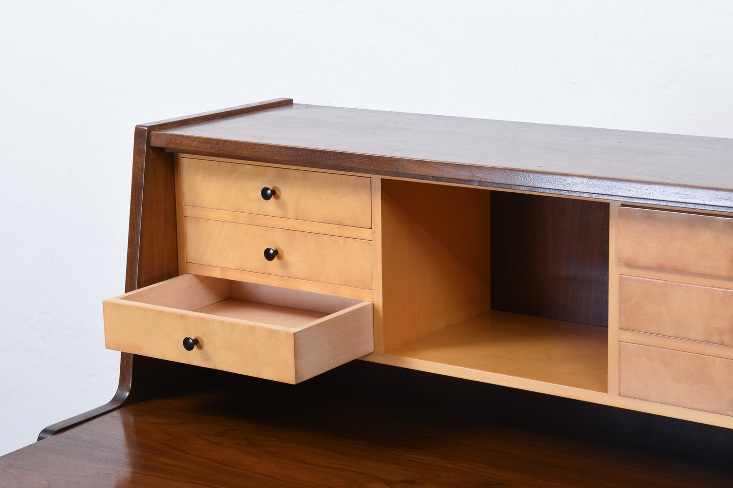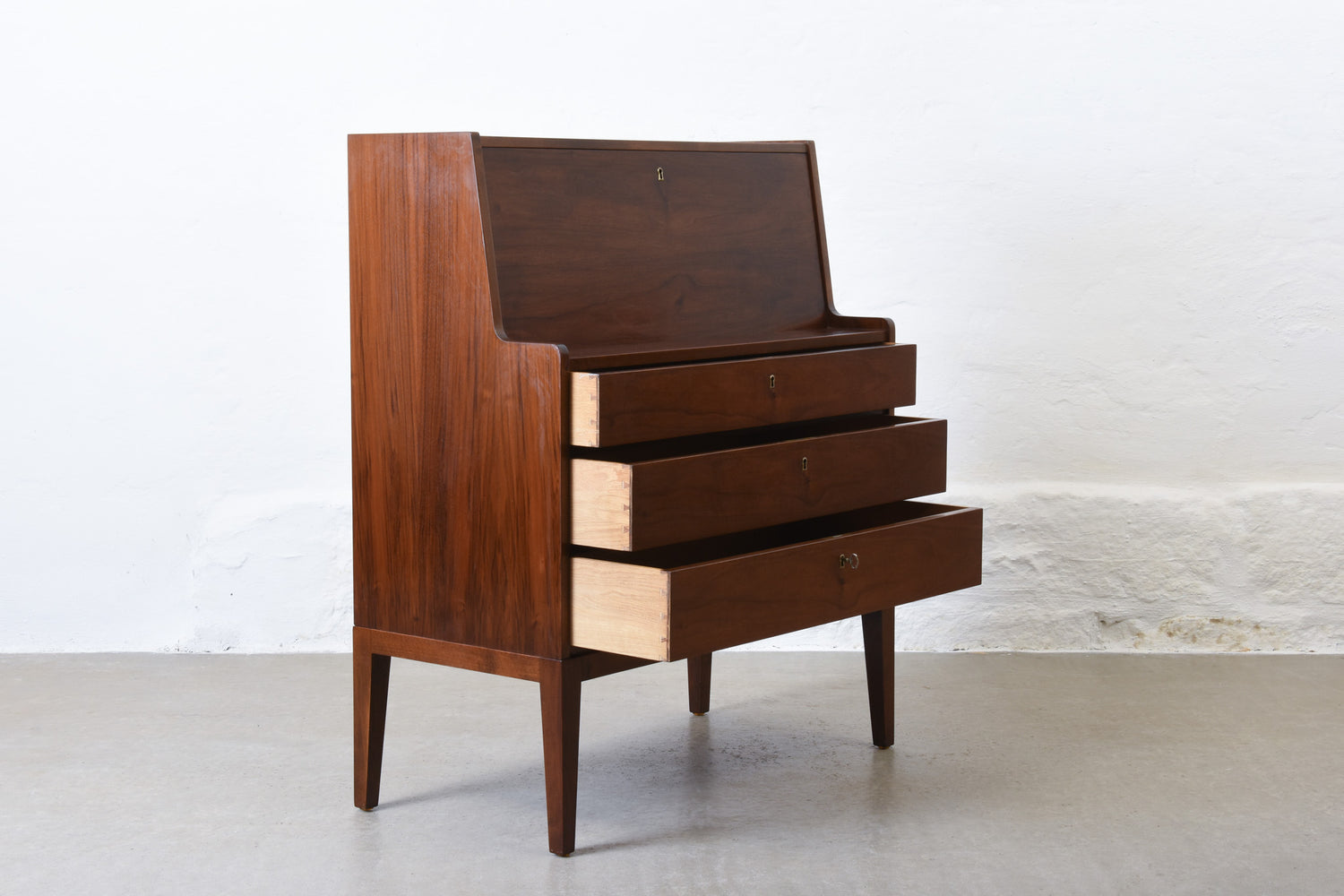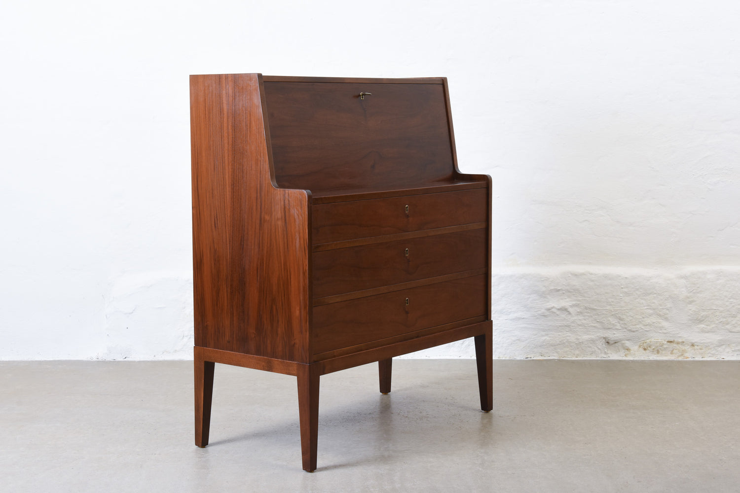 Secretary in walnut with locking drop-down worktop. Features a selection of six small drawers in birch as well as three deep oak-lined locking drawers.