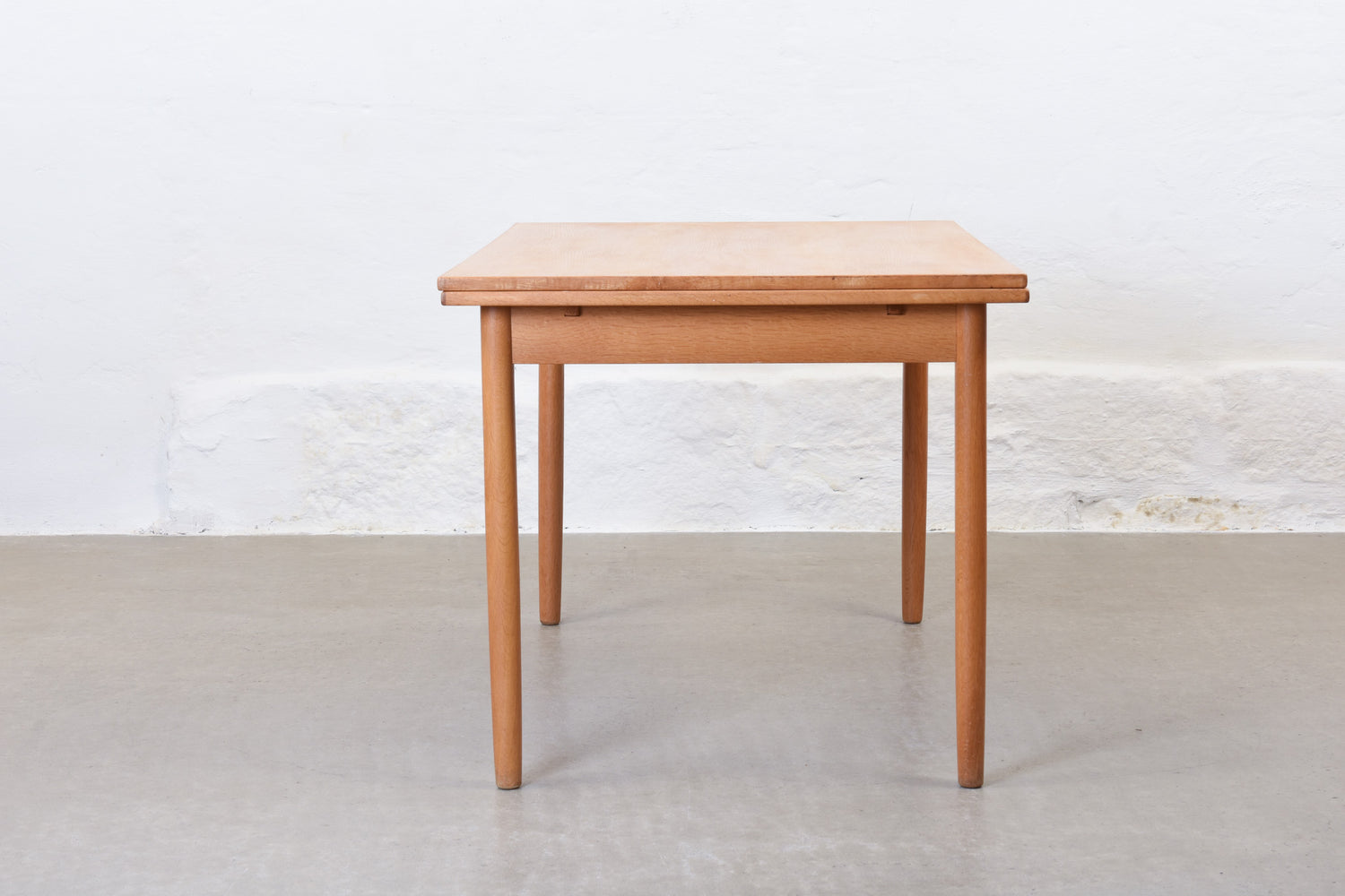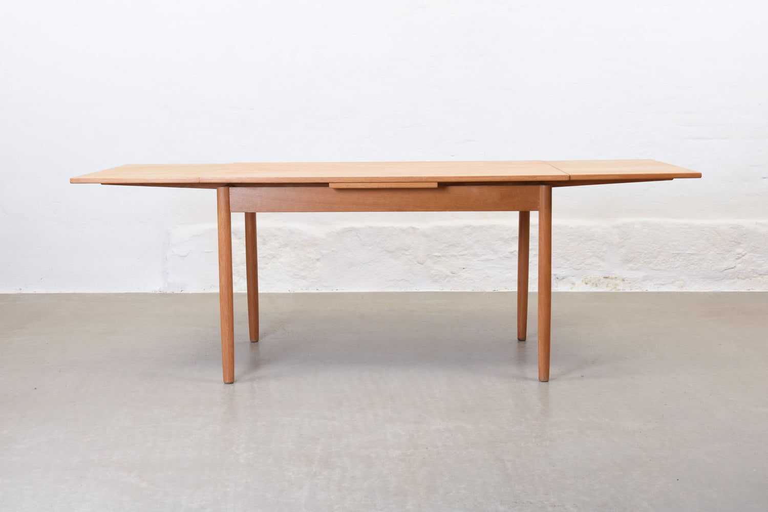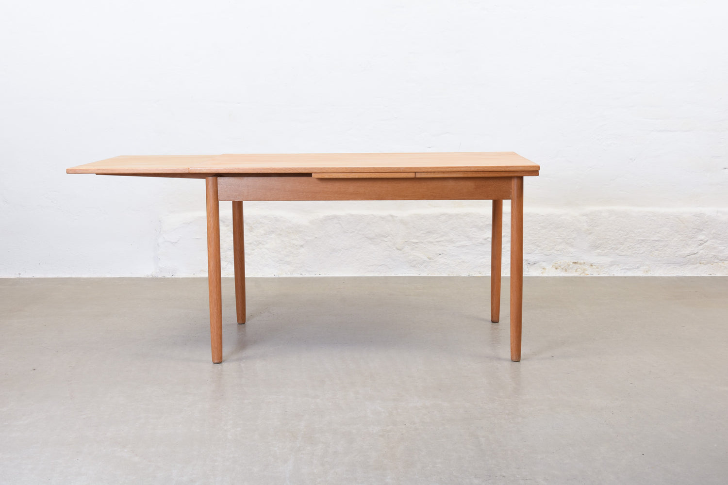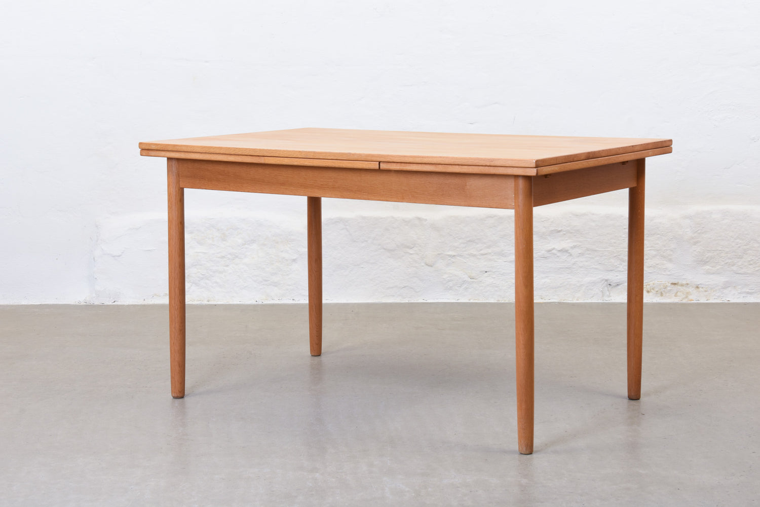 Extending dining table in oak with two hidden pull-out leaves. Sits six normally and up to eight comfortably when fully extended.