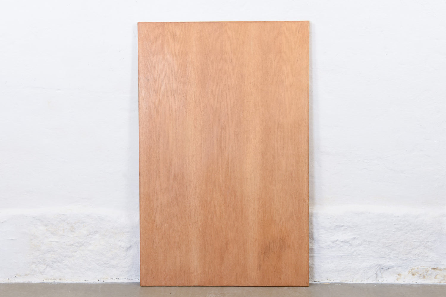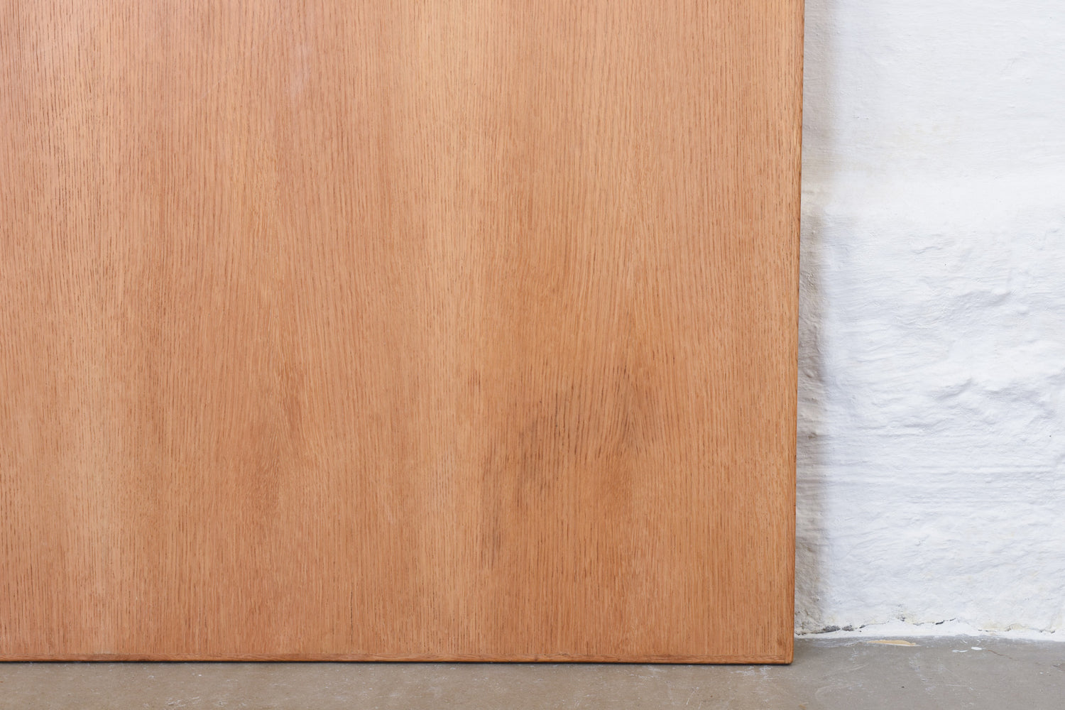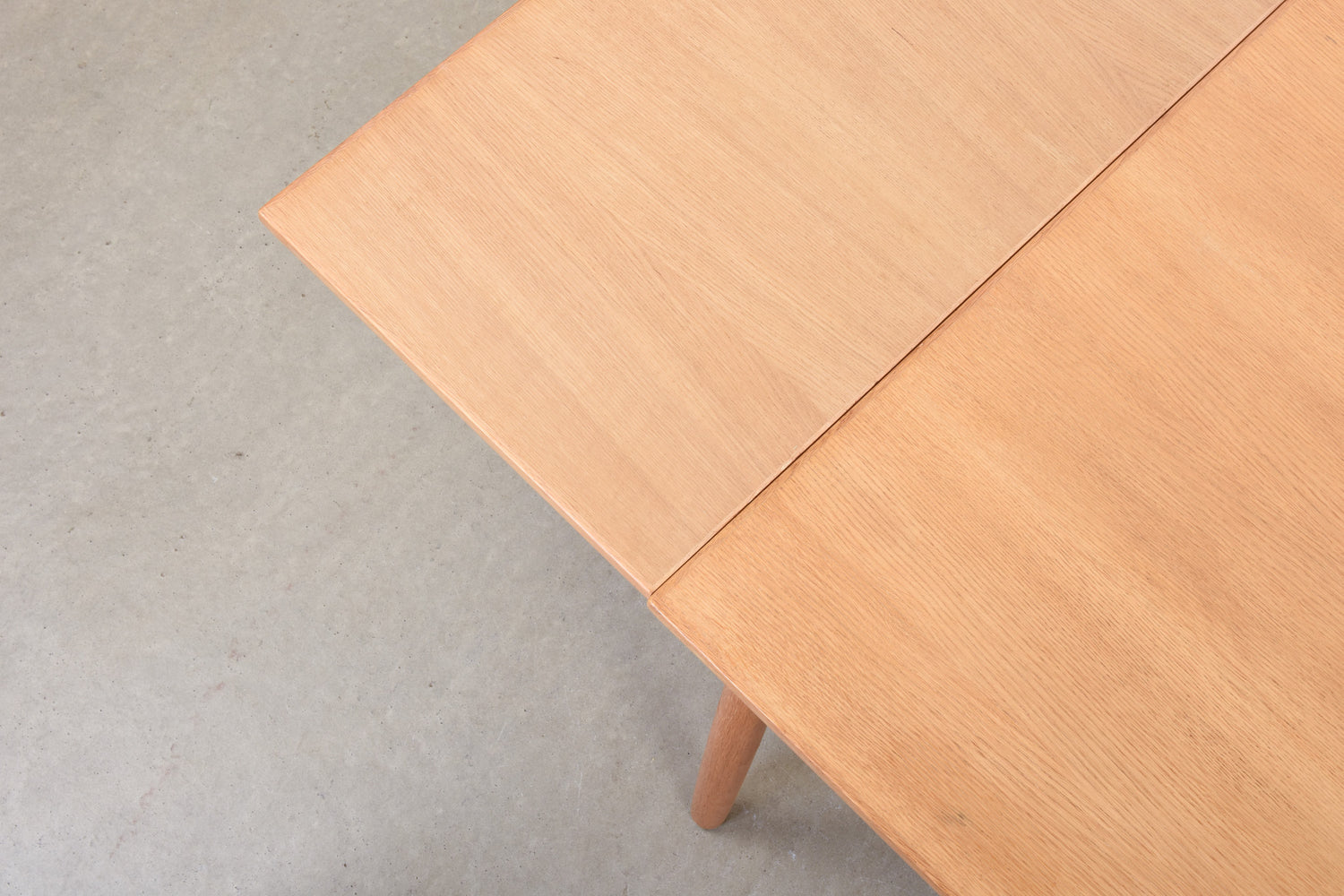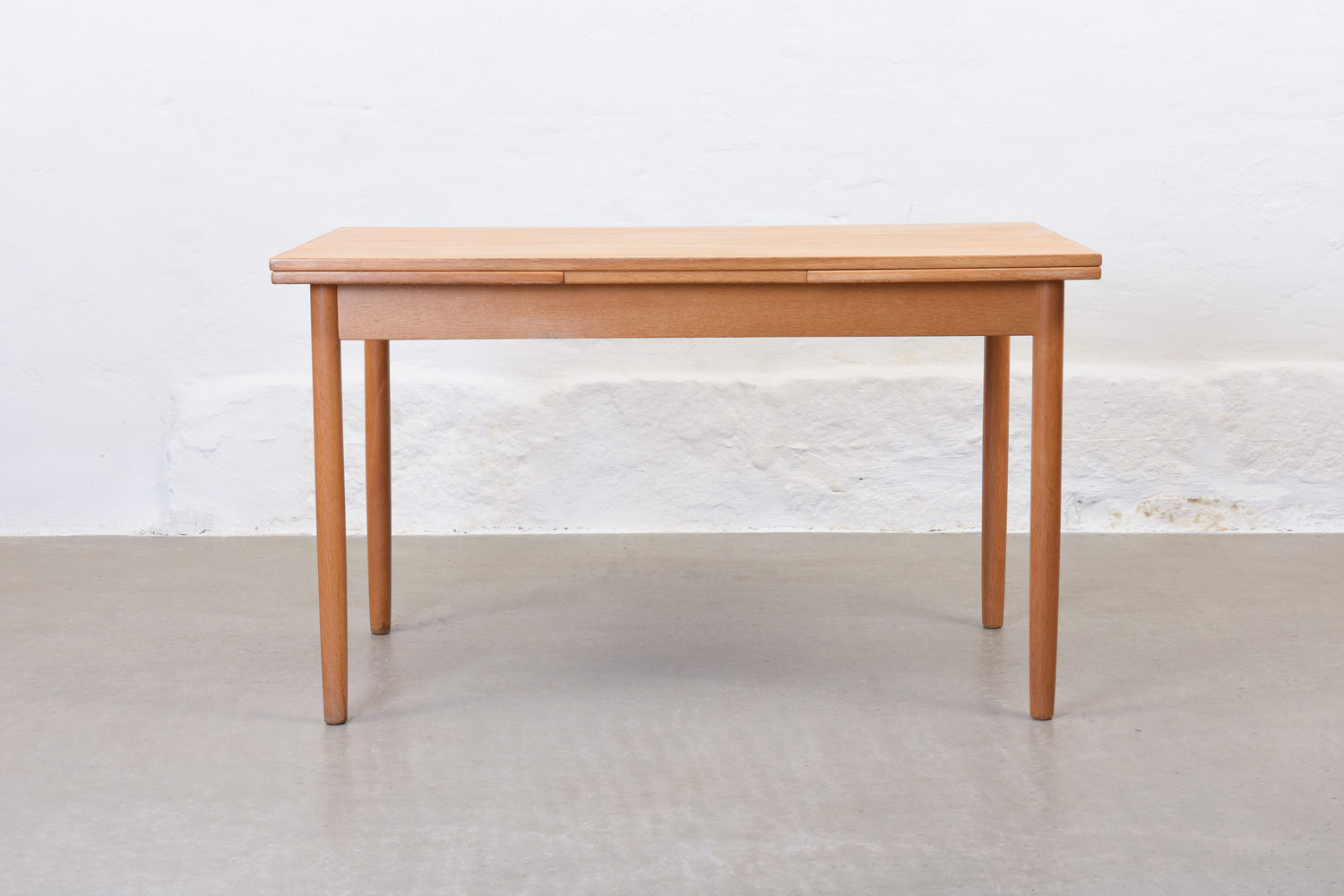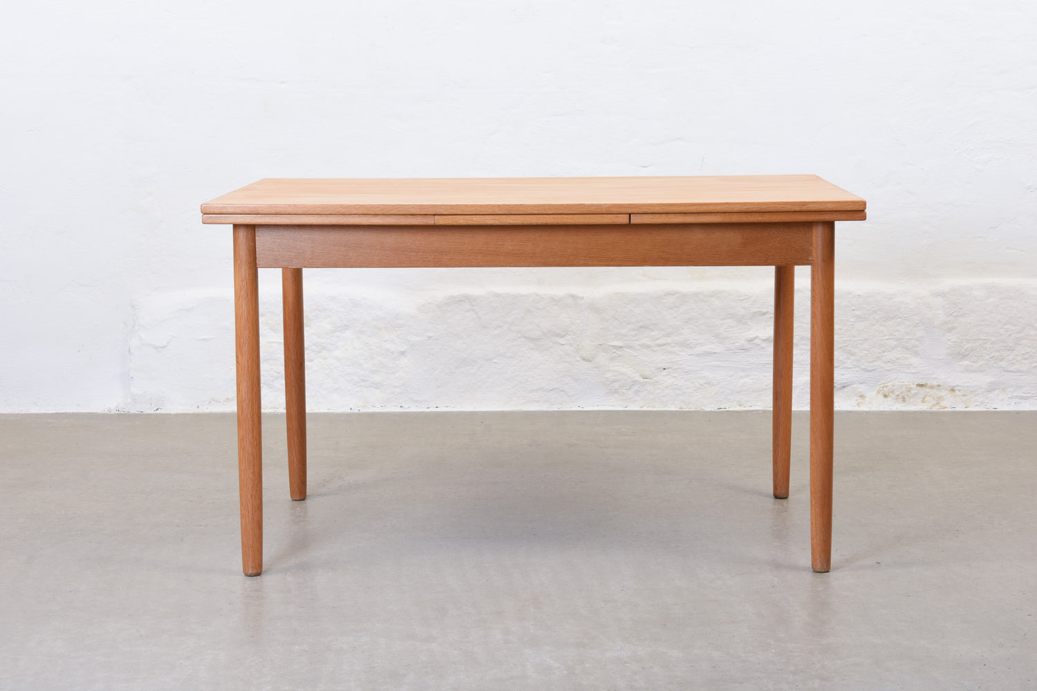 Extending dining table in oak with two hidden pull-out leaves. Sits six normally and up to eight comfortably when fully extended.