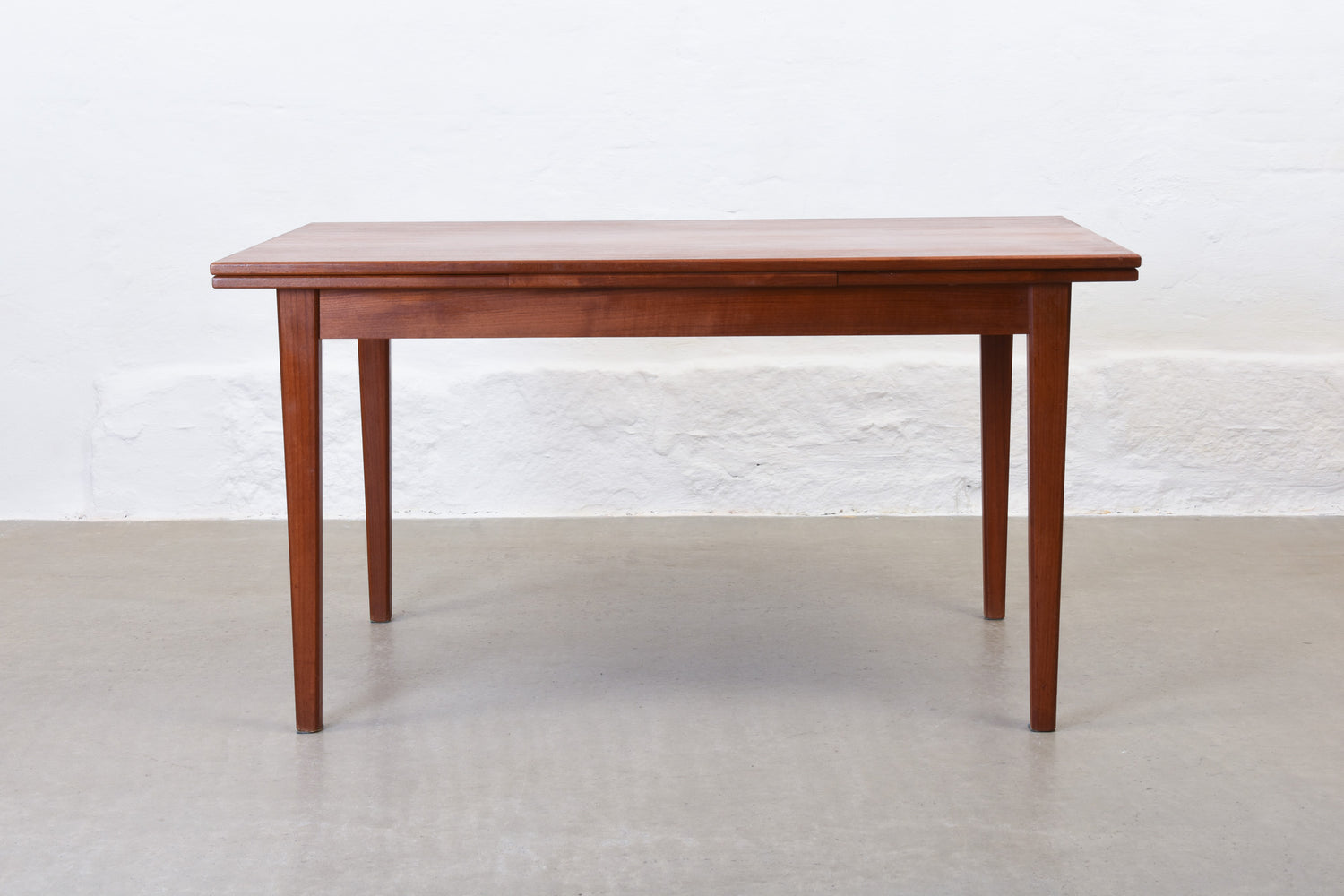 Extending dining table in teak with hidden pull-out extension leaves. Sits six normally and up to eight comfortably when fully extended.
