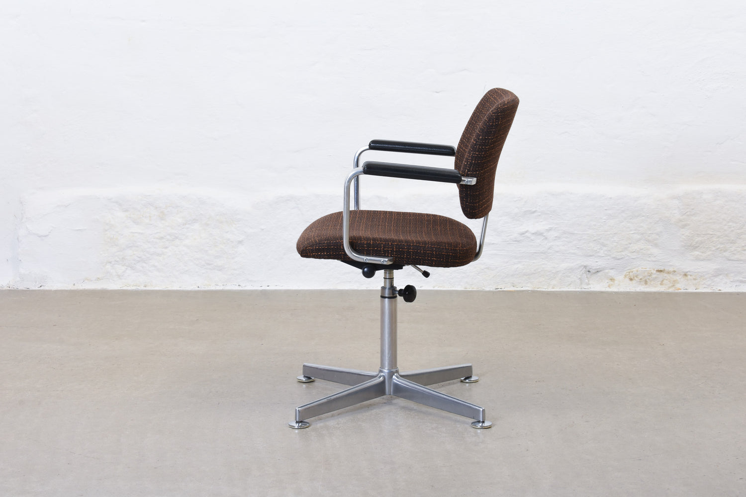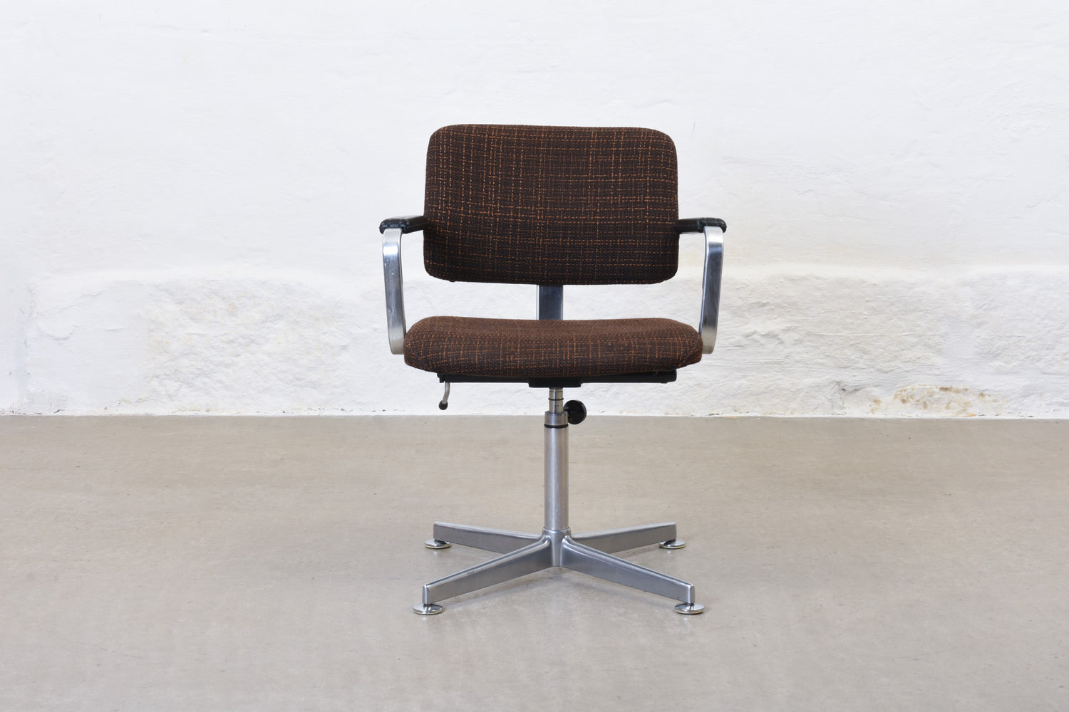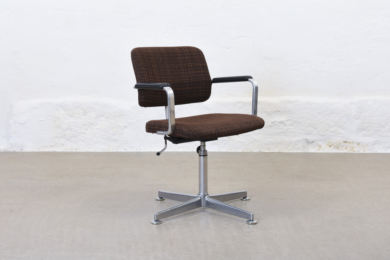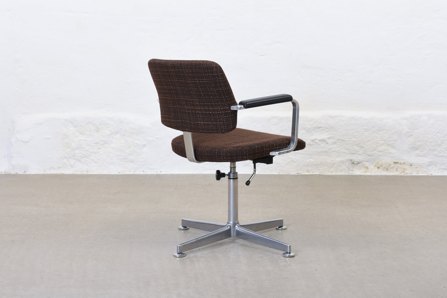 Vintage height-adjustable desk chair on a steel swivel base. Upholstered in its original wool and also features rubberised armrests and an adjustable rocking function.