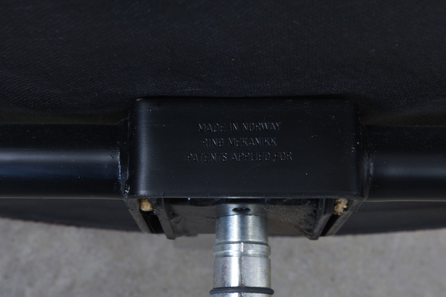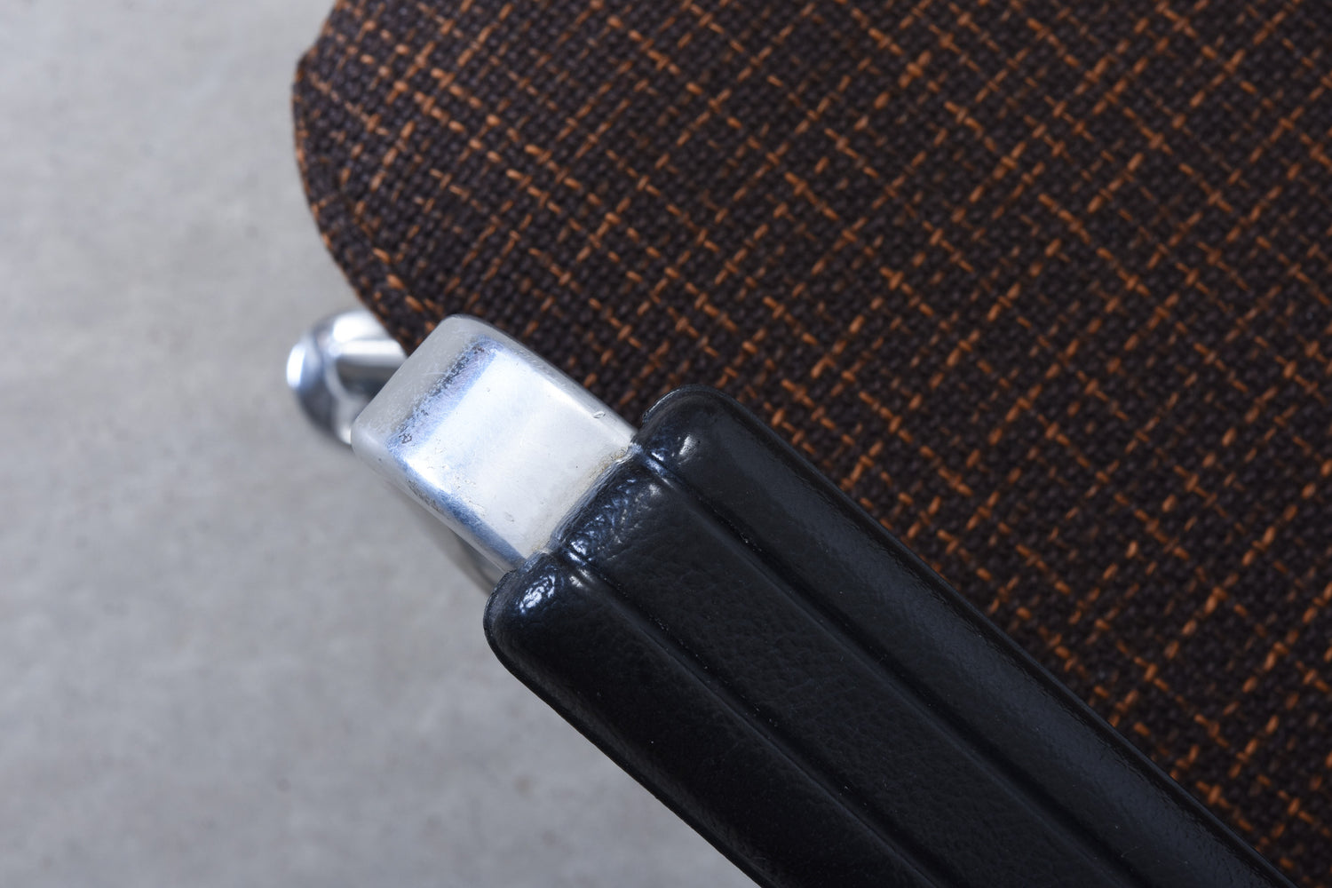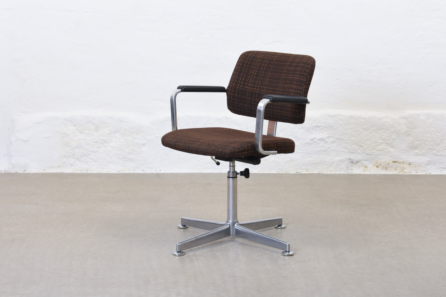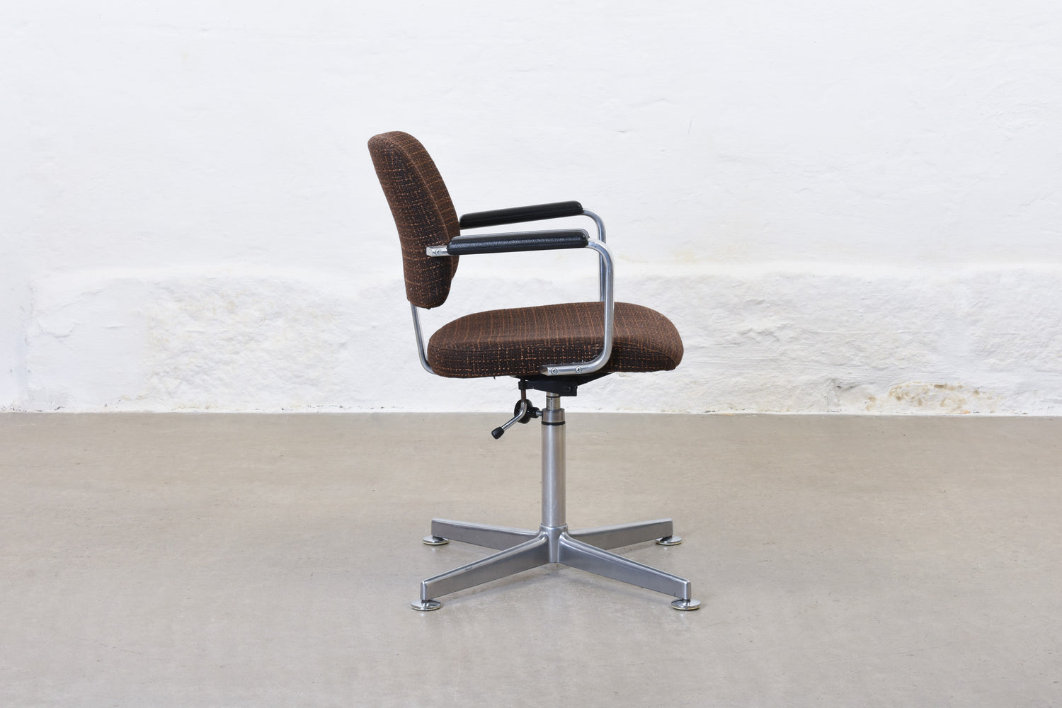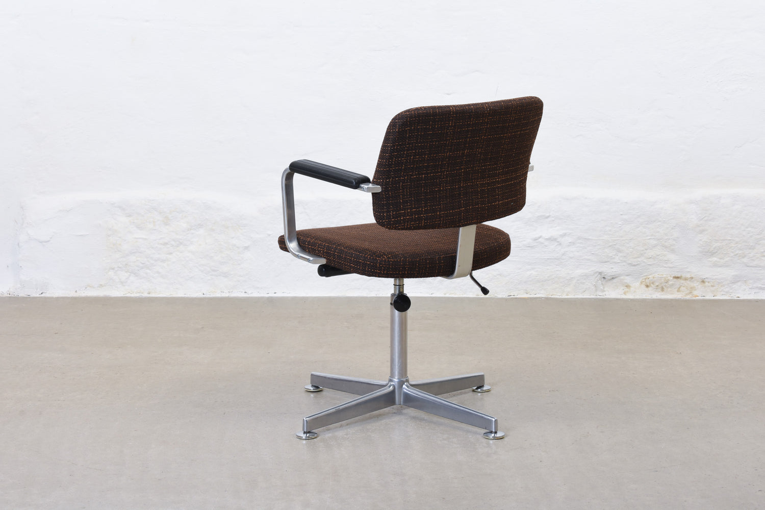 Vintage height-adjustable desk chair on a steel swivel base. Upholstered in its original wool and also features rubberised armrests and an adjustable rocking function.
