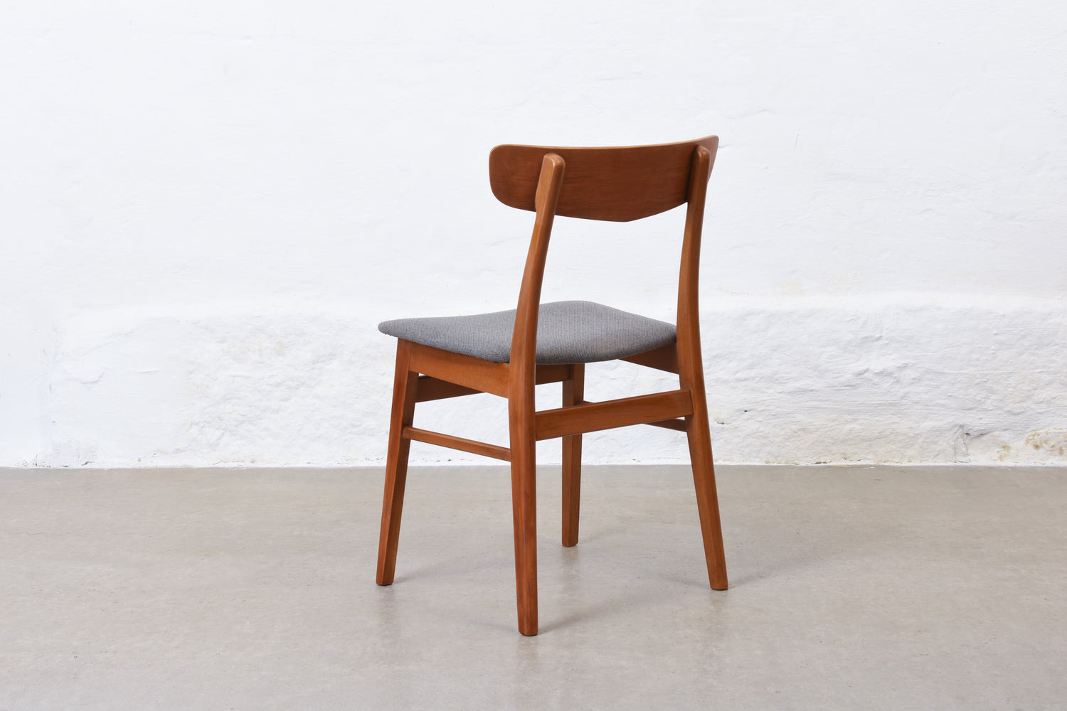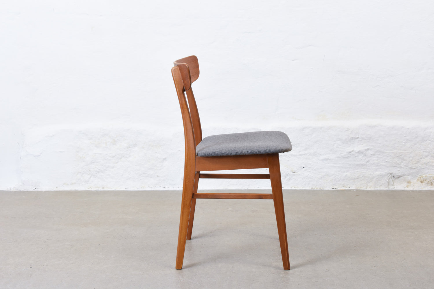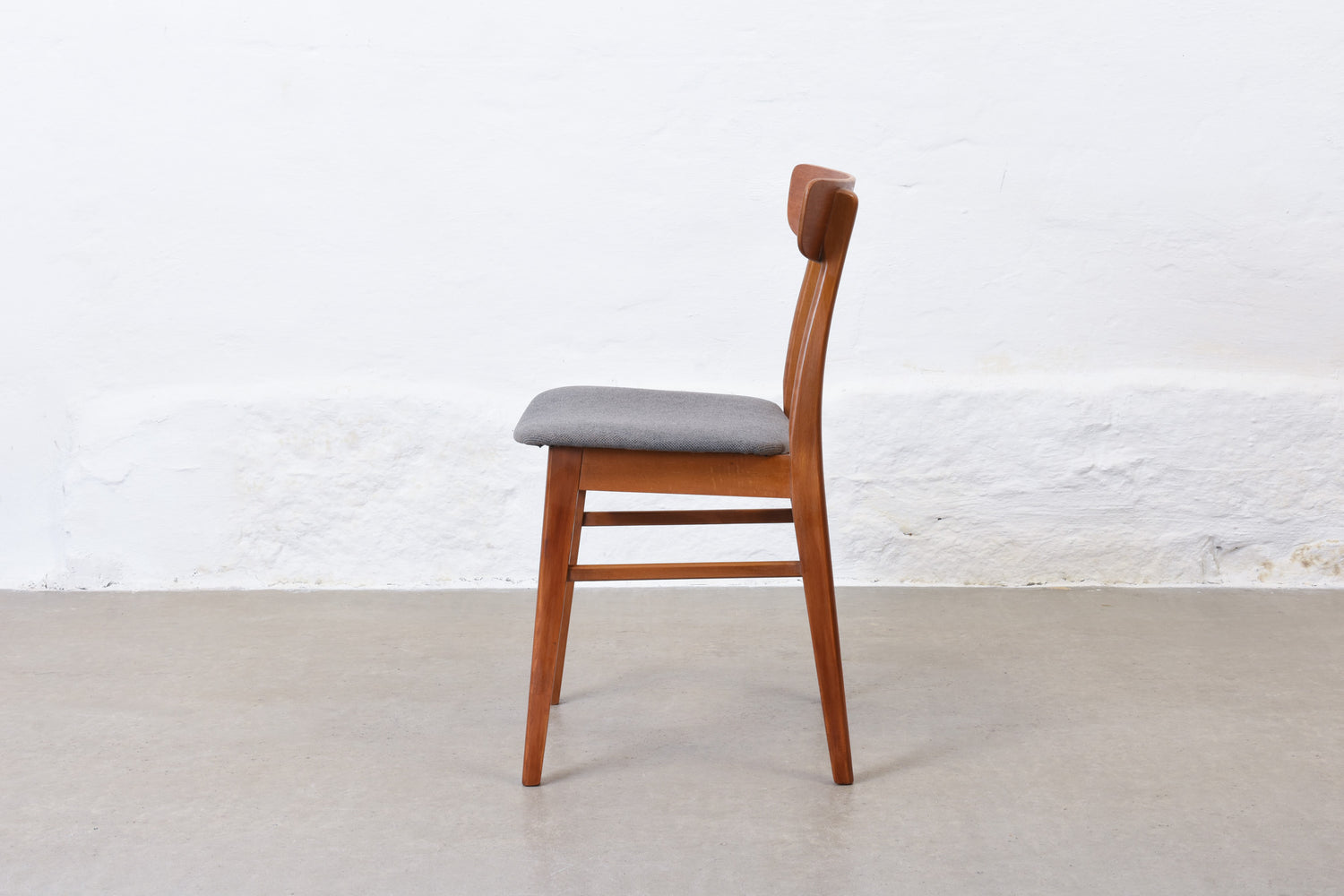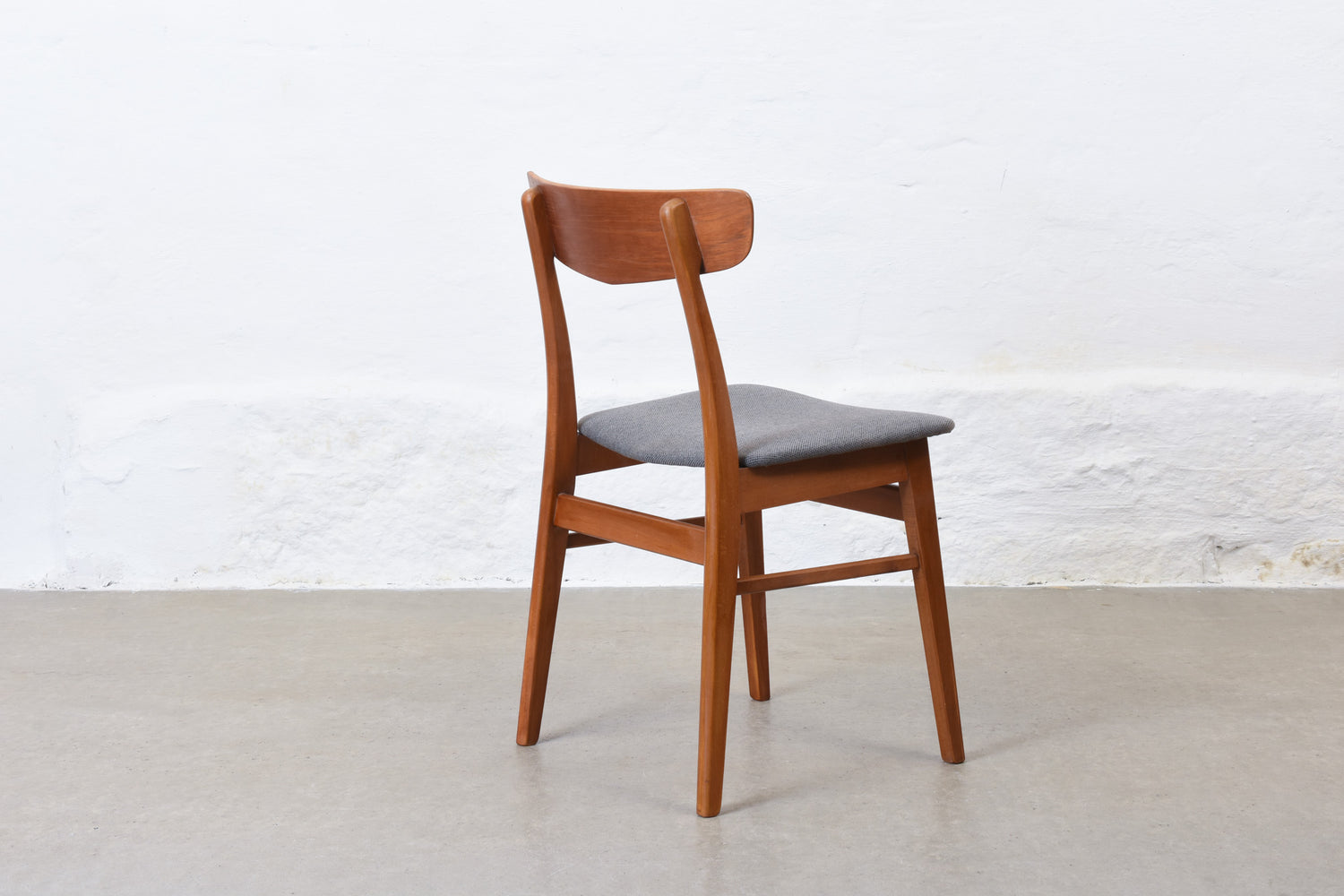 Set of six dining chairs with teak backs, beech frames and padded seats newly reupholstered in wool.