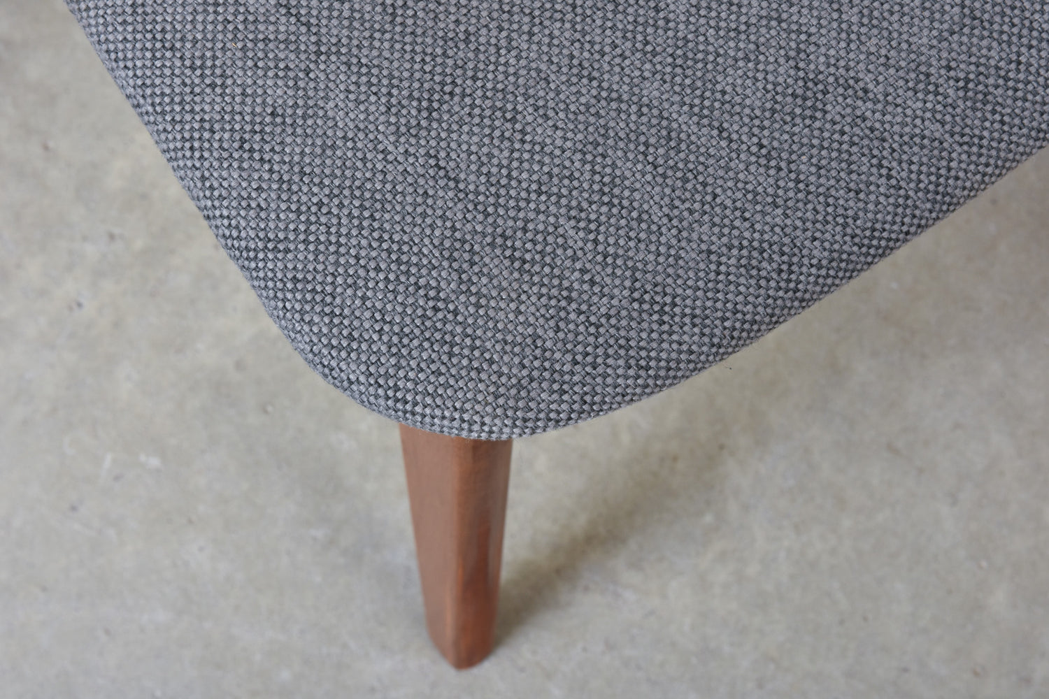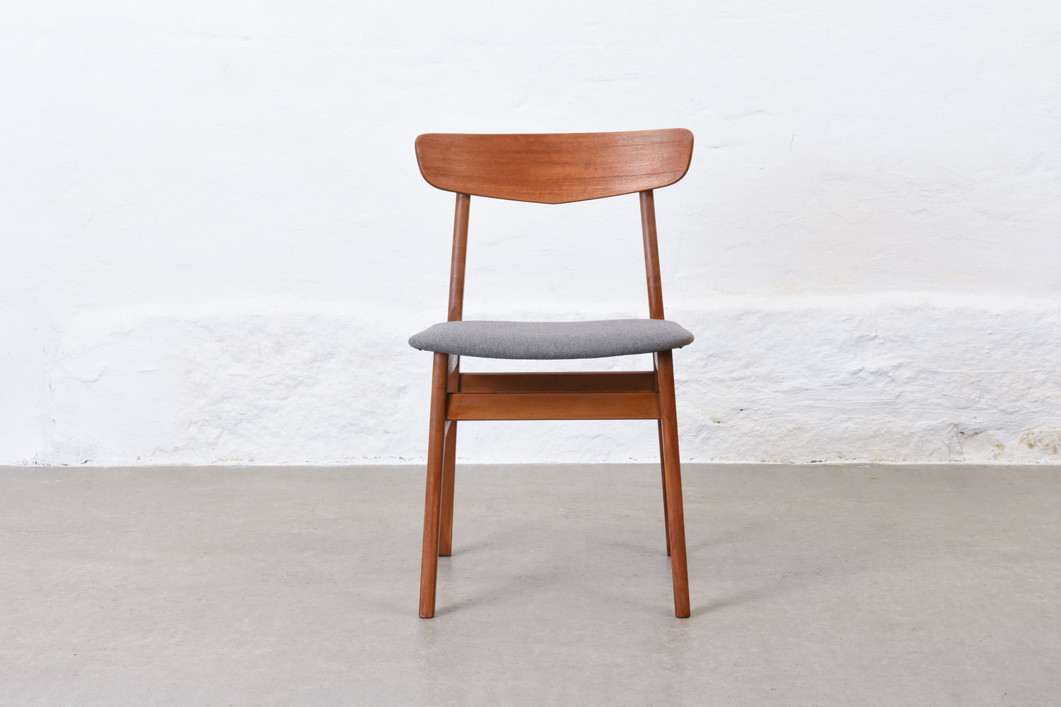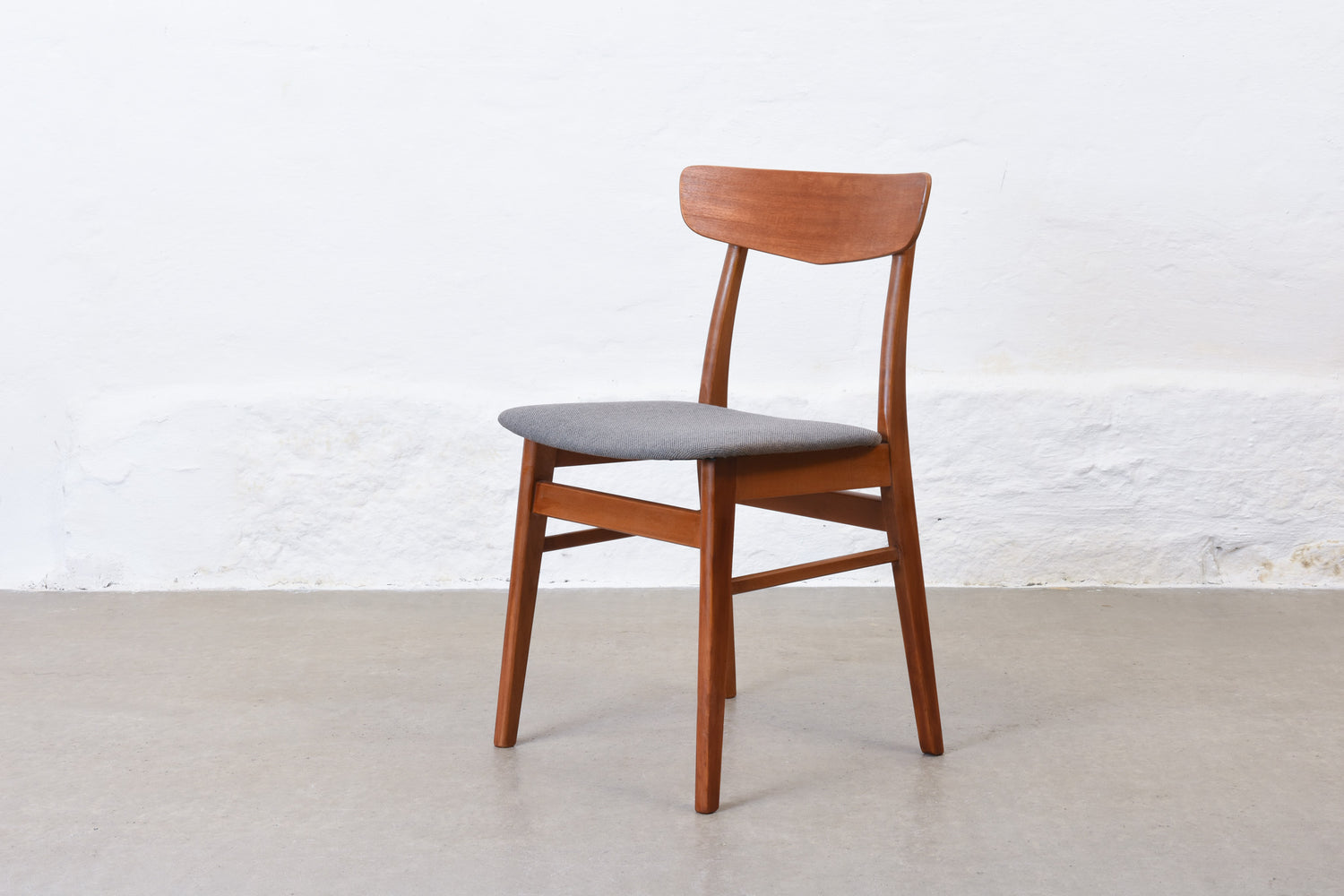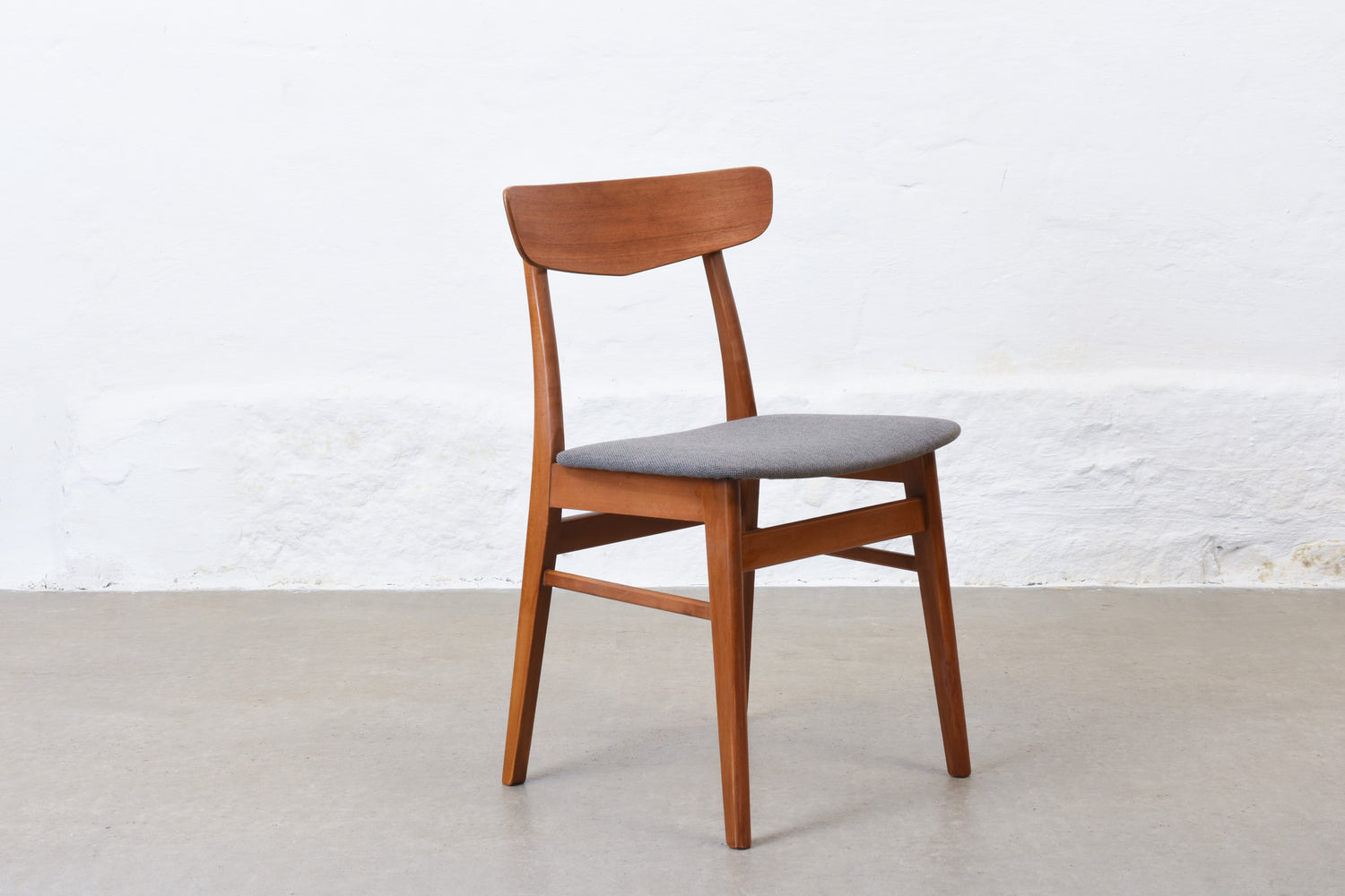 Set of six dining chairs with teak backs, beech frames and padded seats newly reupholstered in wool.