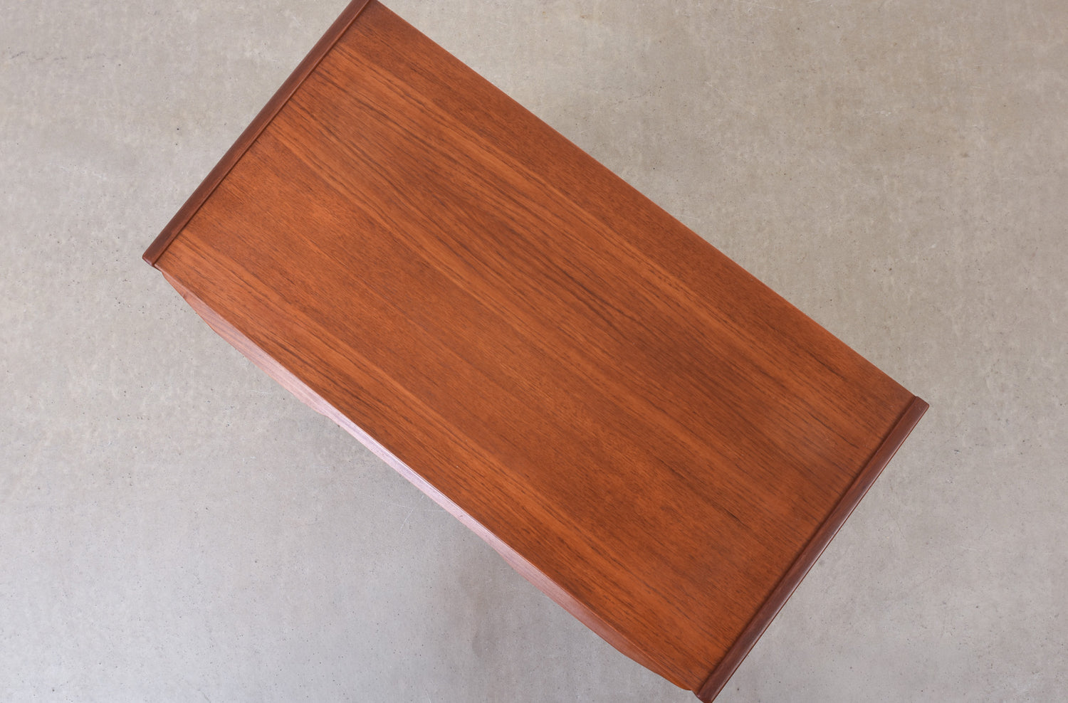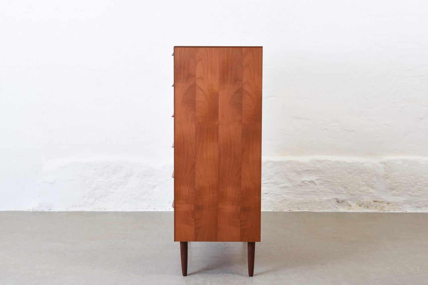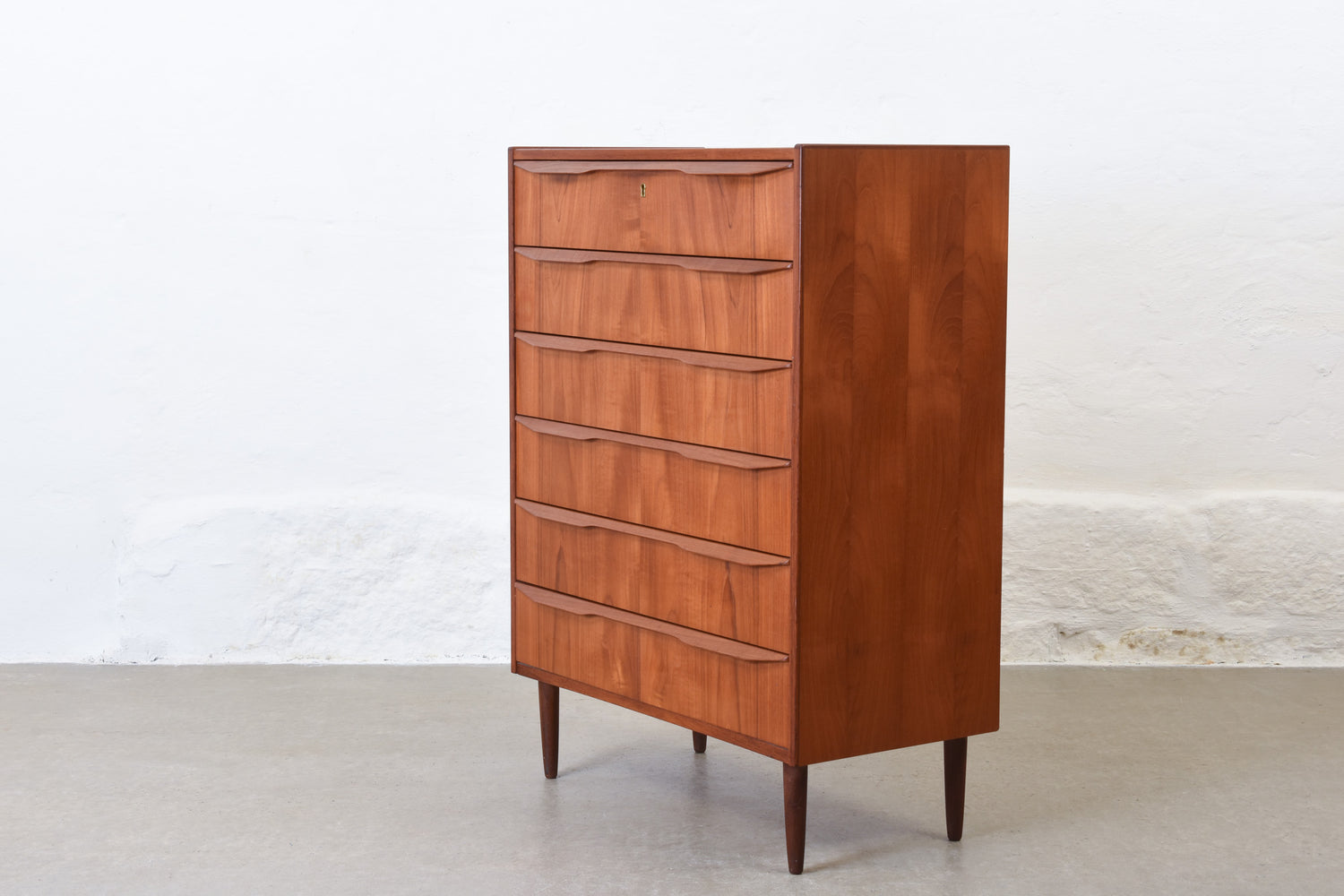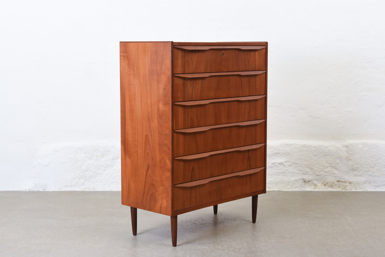 Teak chest of six drawers with lipped handles. Sits on tapered solid teak legs.
