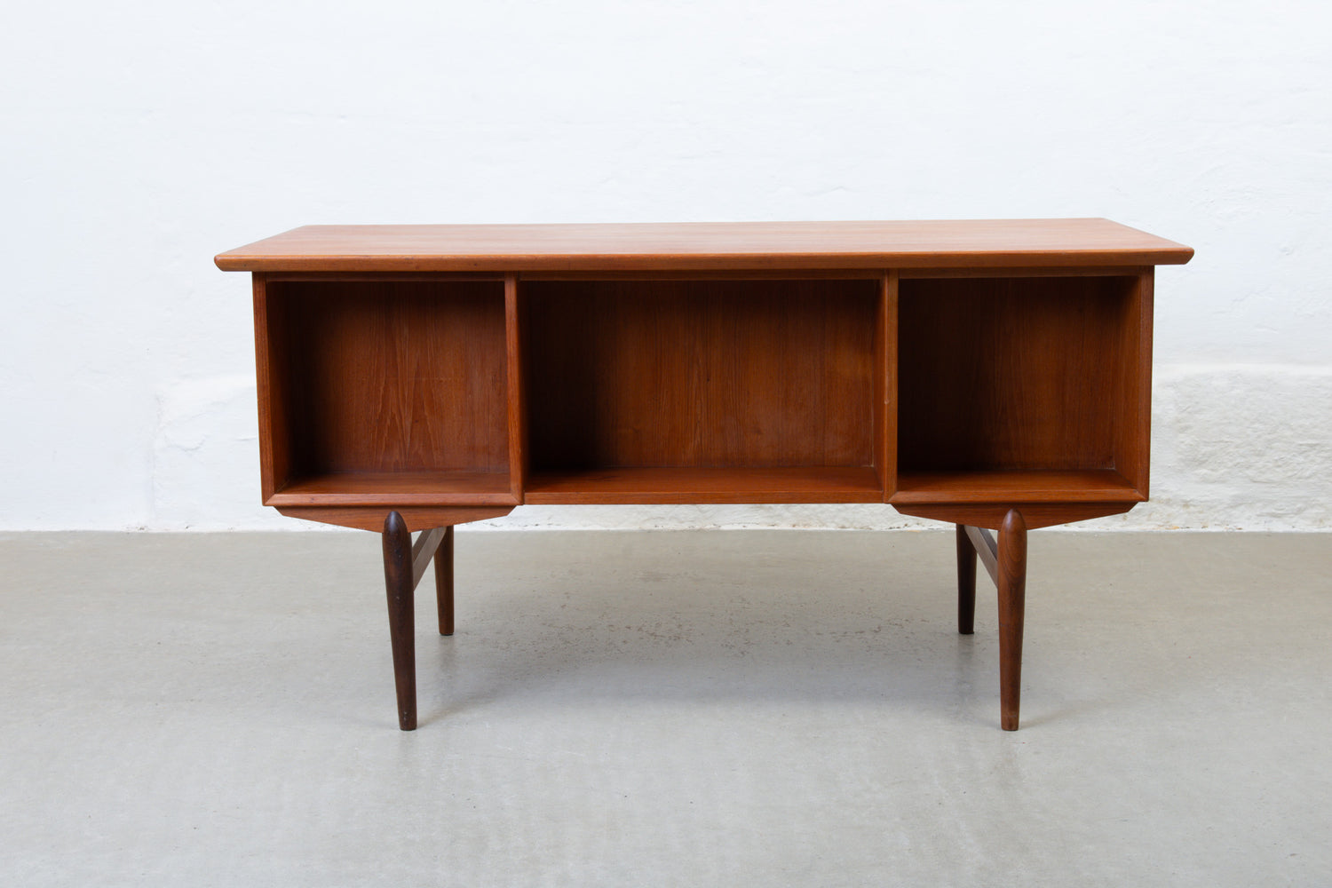Twin pedestal desk in teak with a selection of seven drawers and a rear bookshelf.