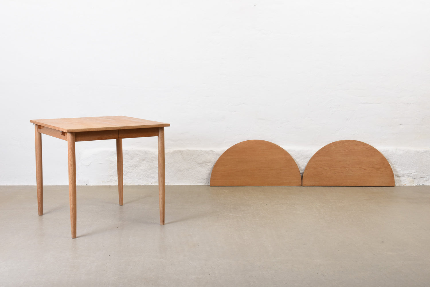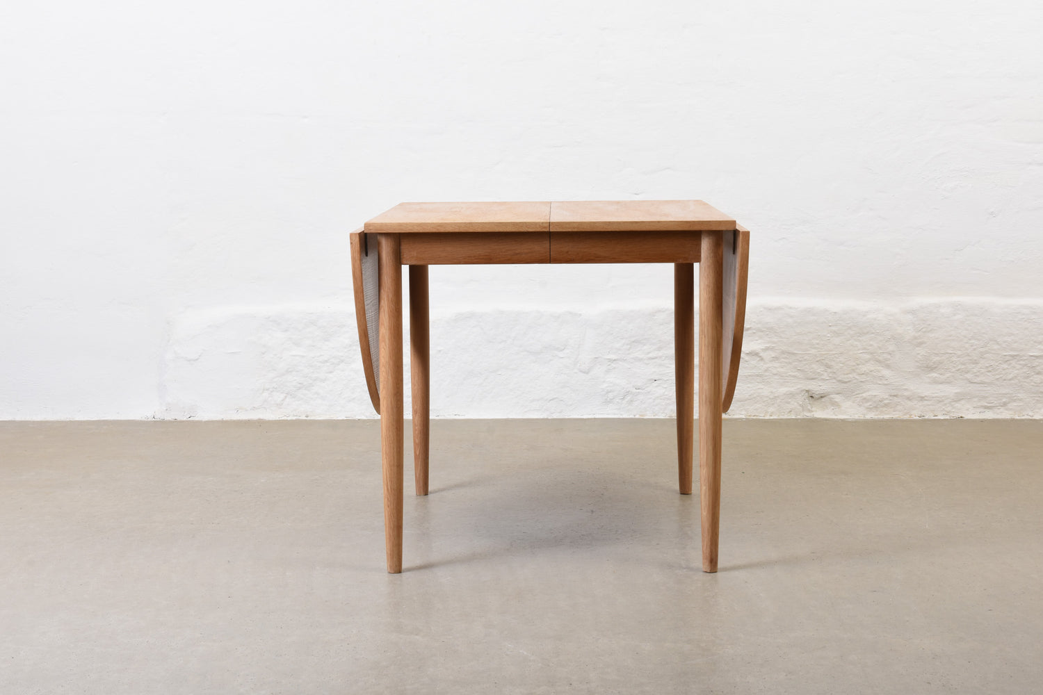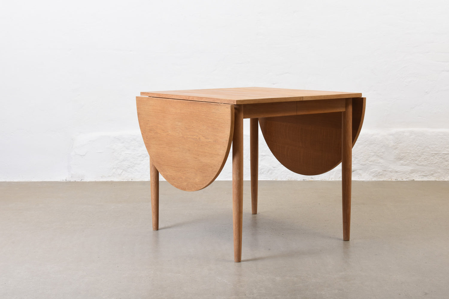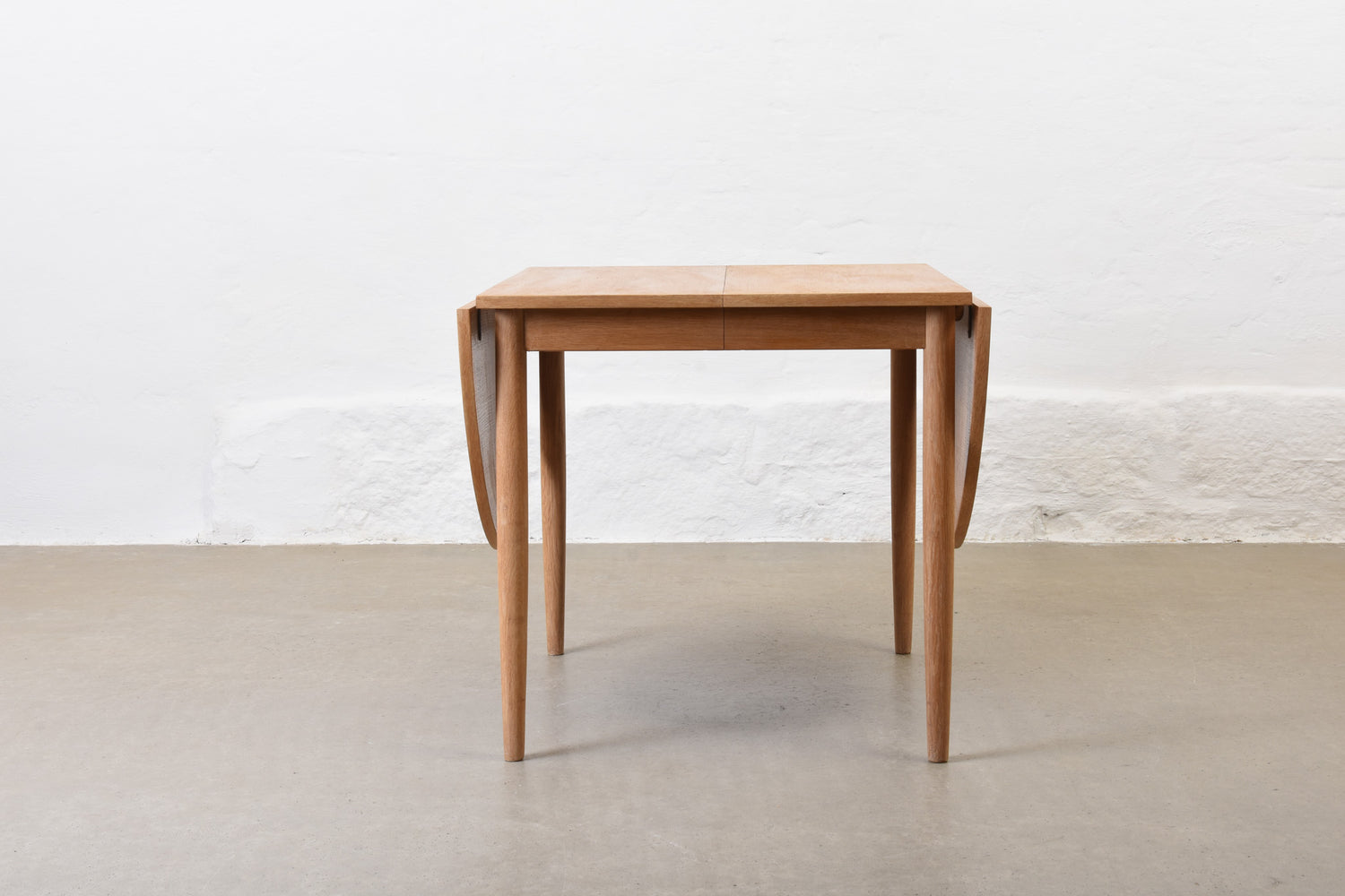 Square dining table in oak with two removable drop-leaf extensions. Sits four normally and up to six when fully extended.