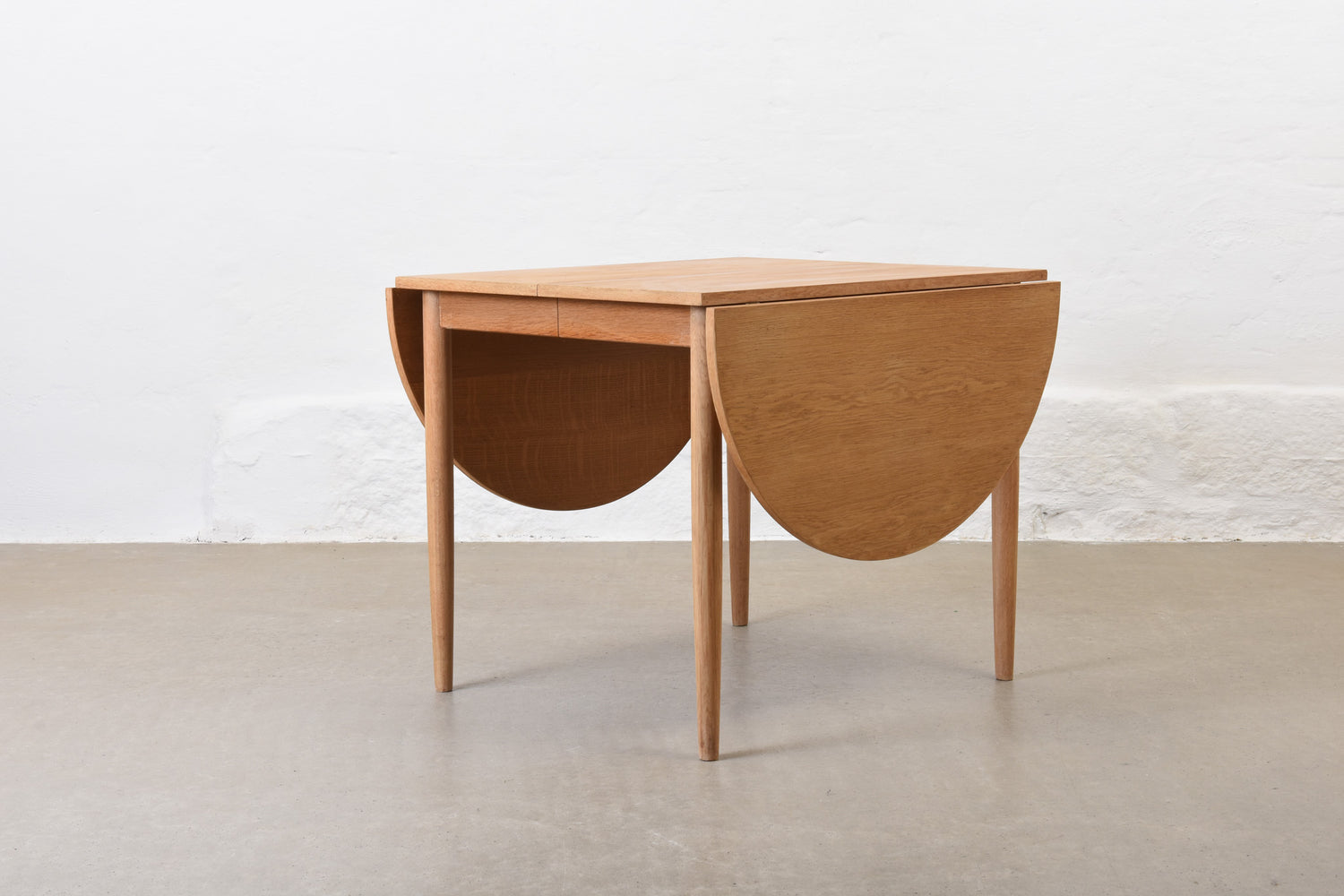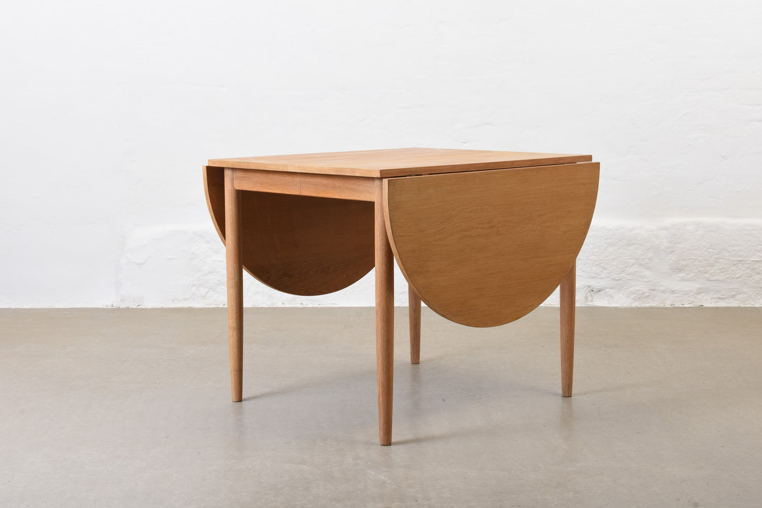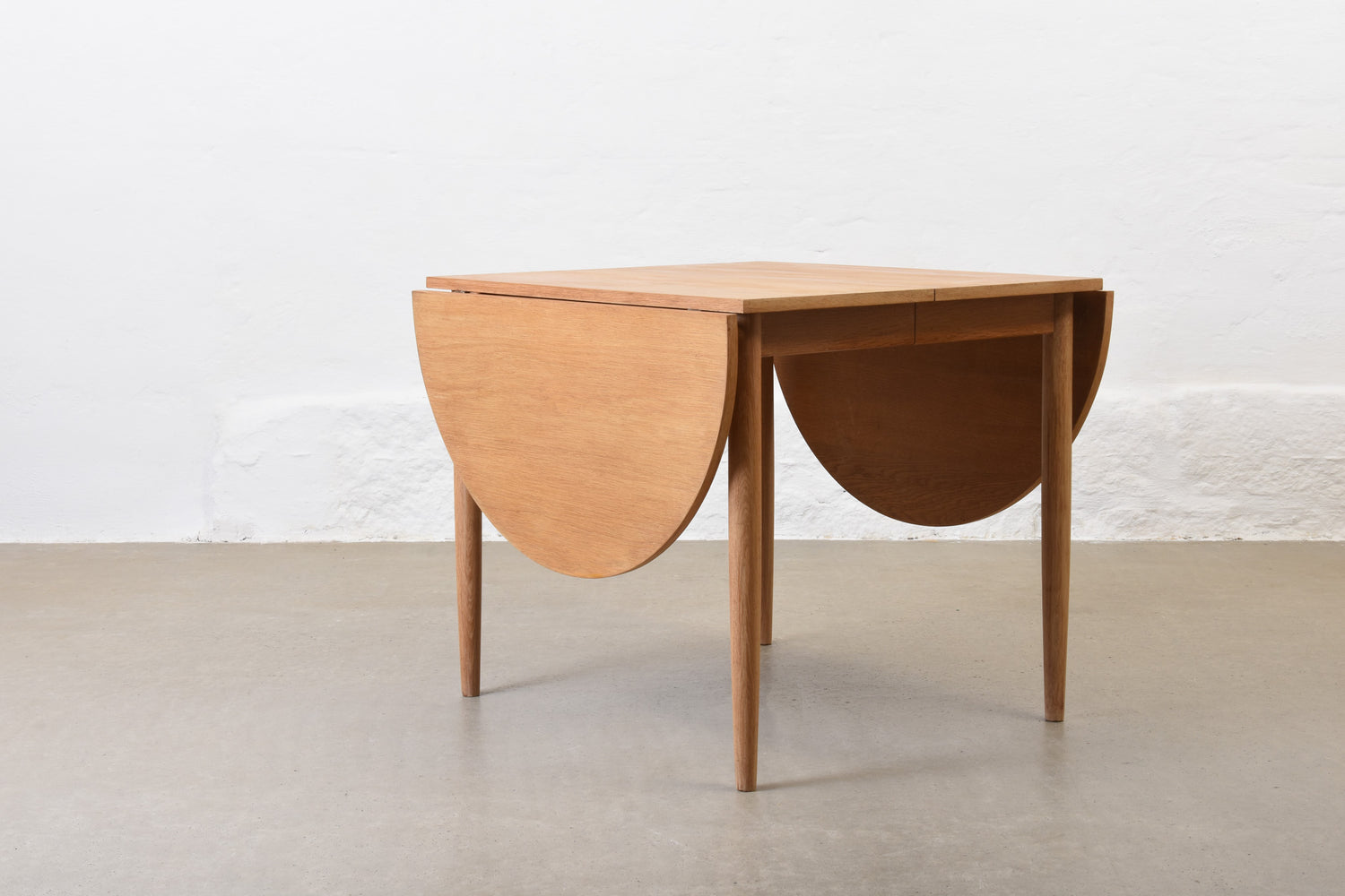 Square dining table in oak with two removable drop-leaf extensions. Sits four normally and up to six when fully extended.