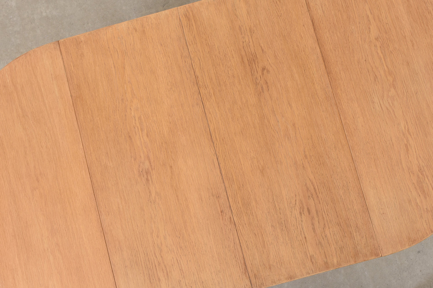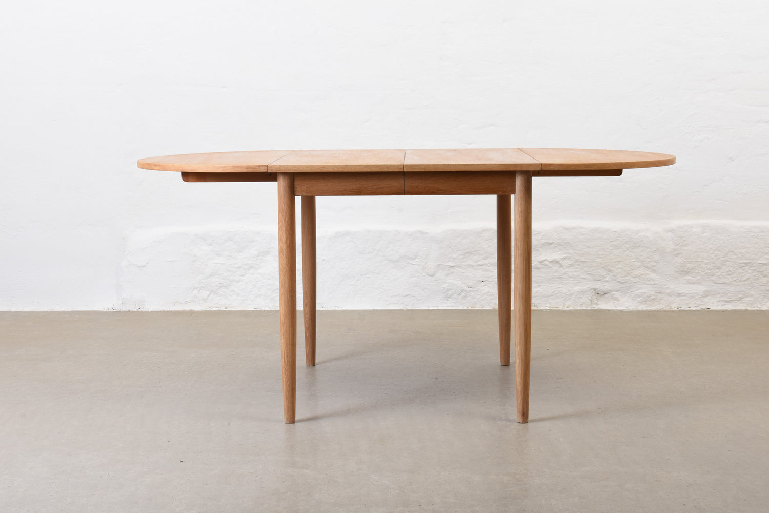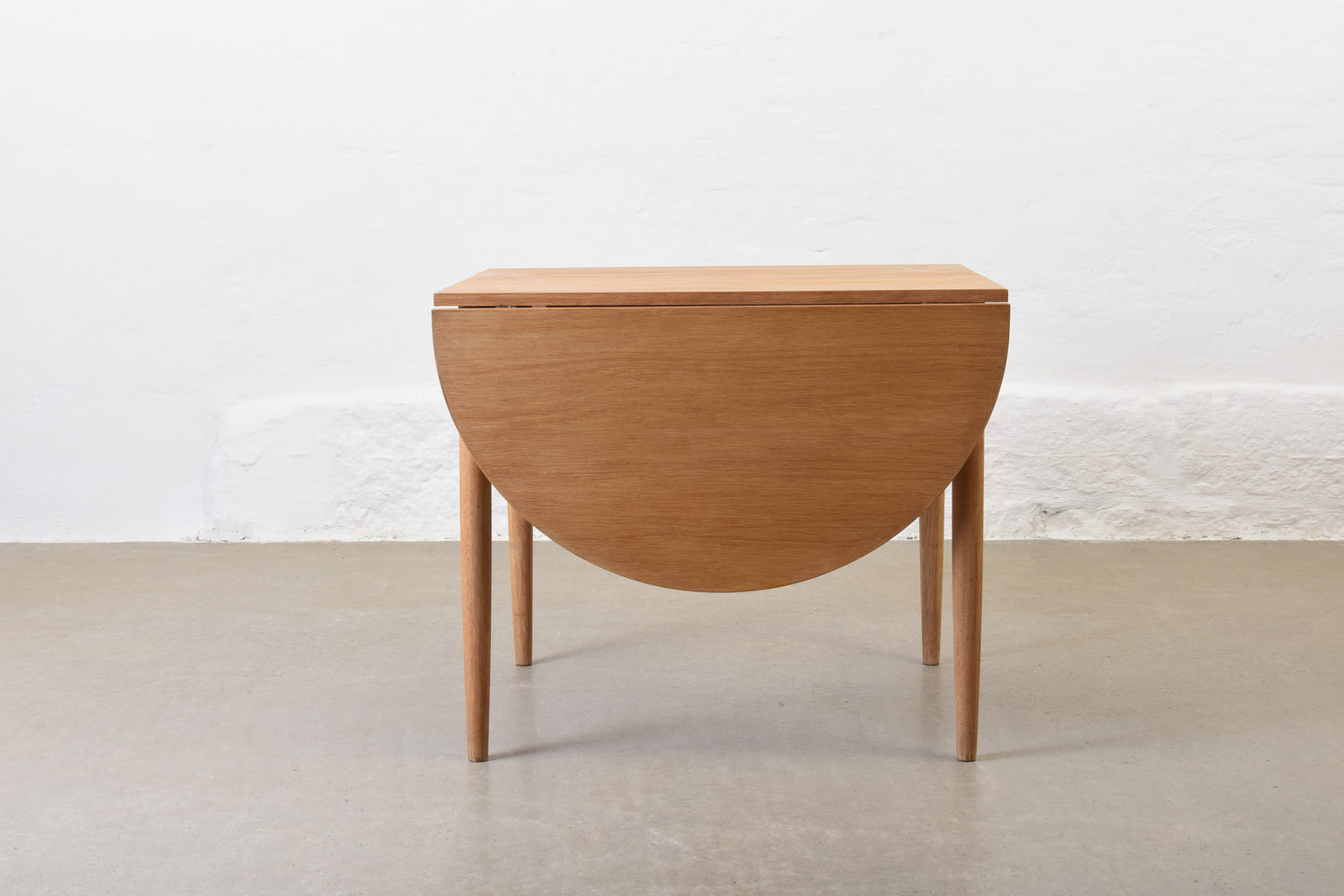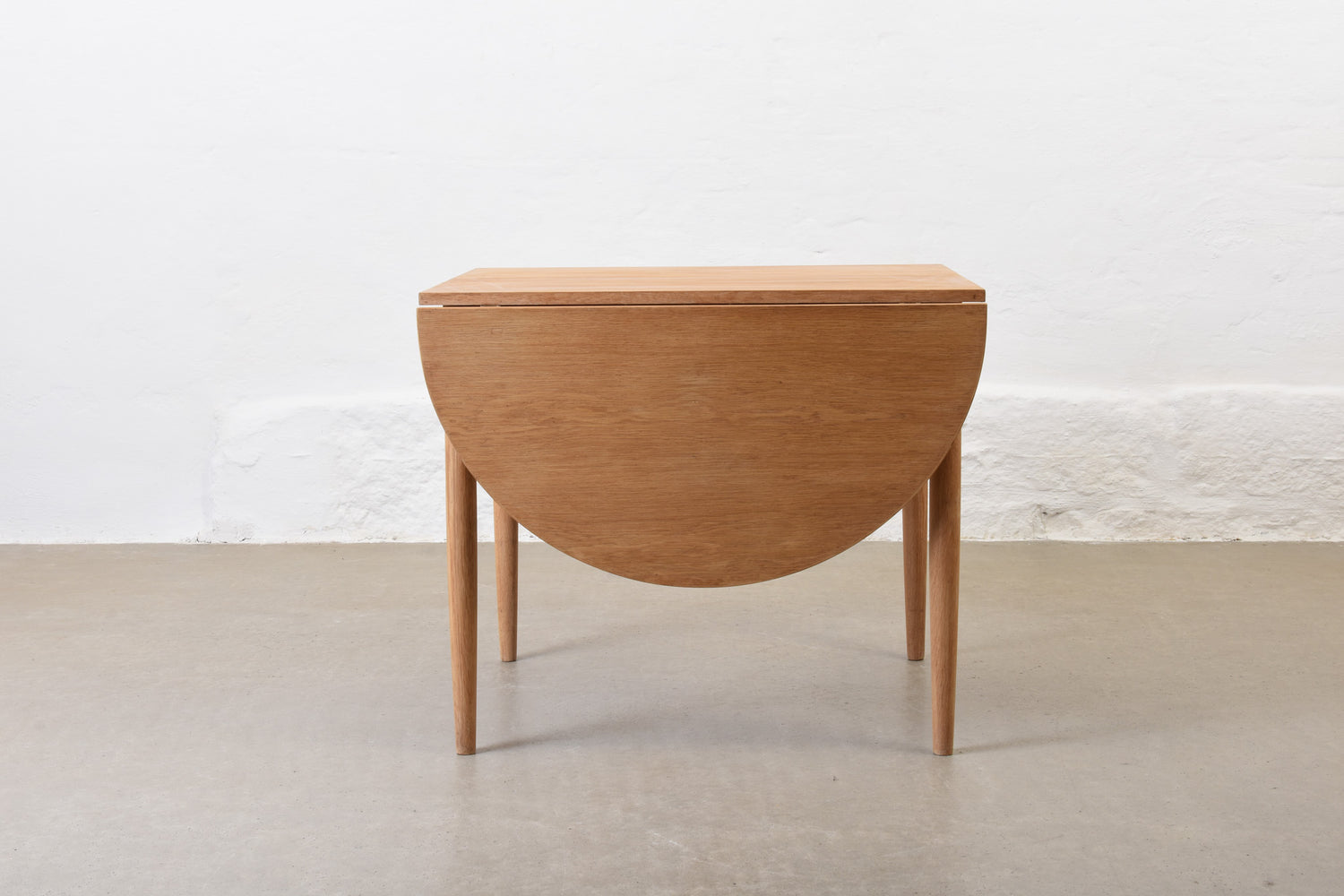 Square dining table in oak with two removable drop-leaf extensions. Sits four normally and up to six when fully extended.