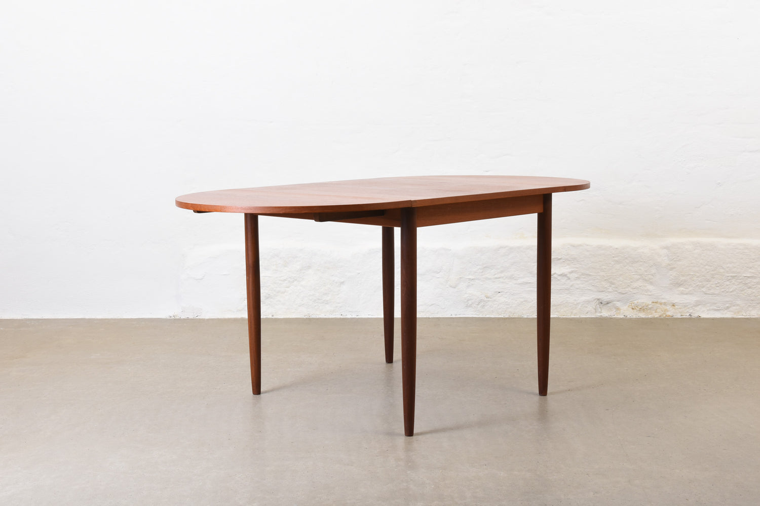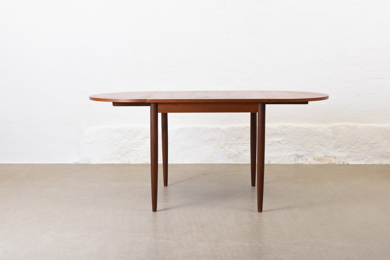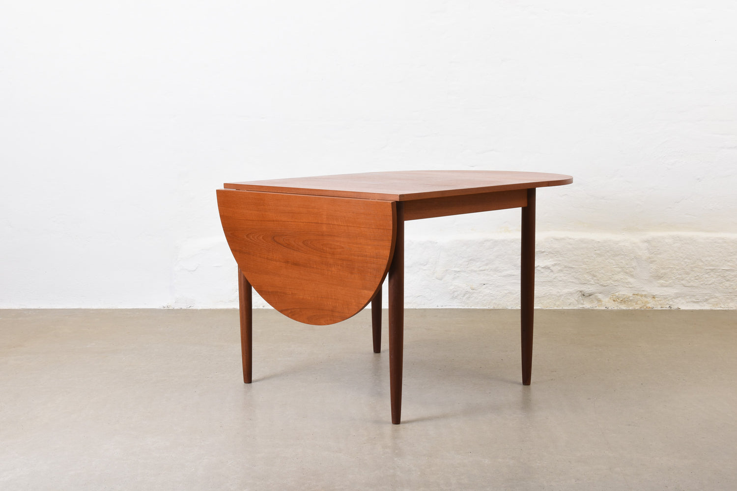 Square dining table in teak with two removable drop-leaf extensions. Sits up to six comfortably when fully extended.