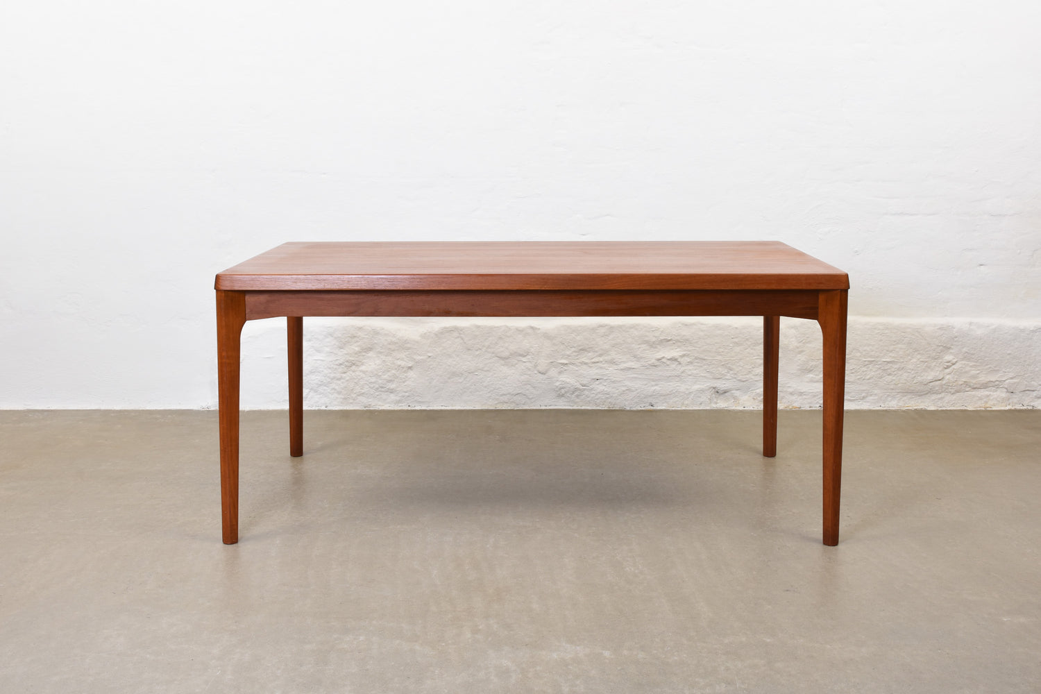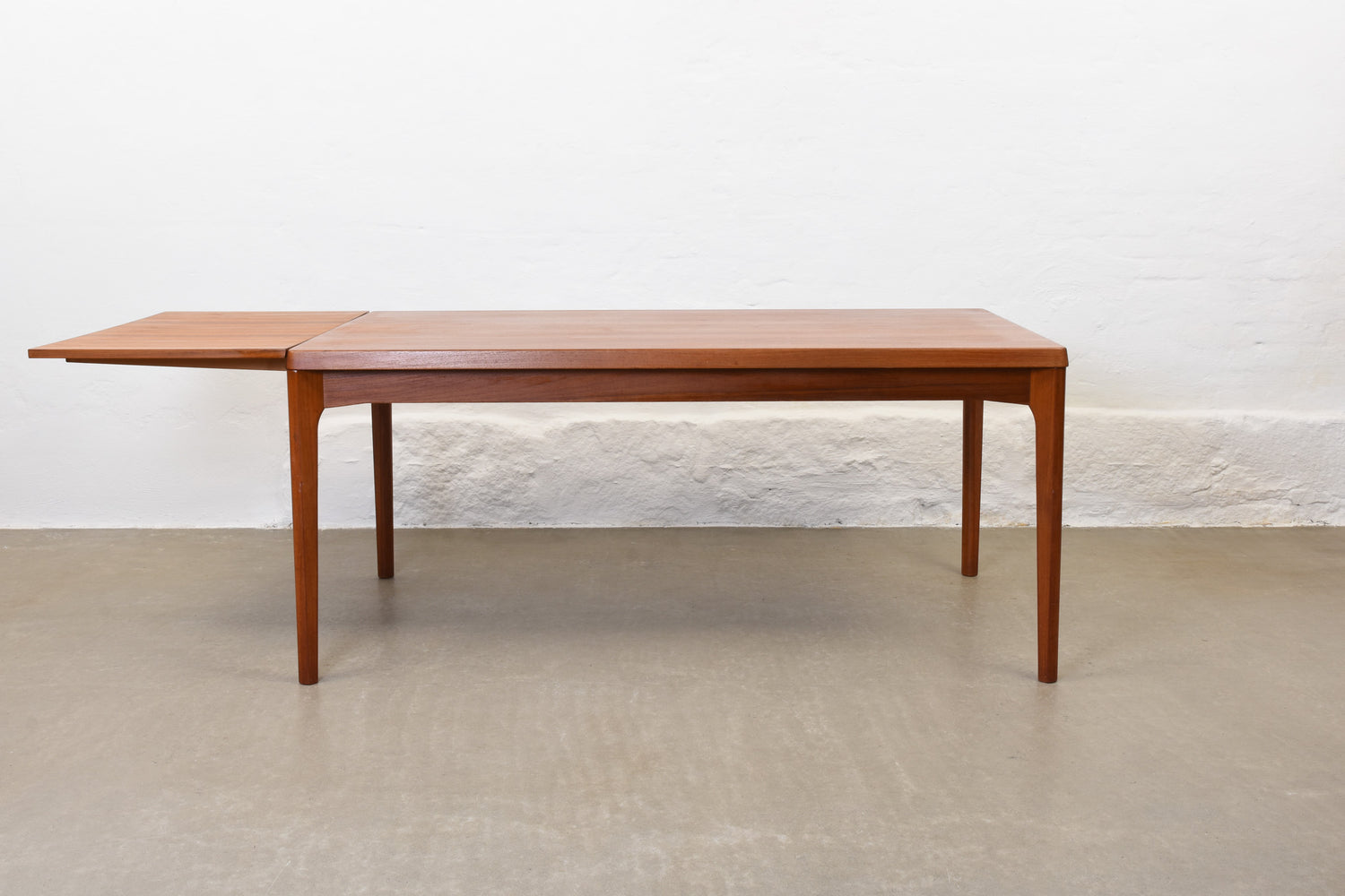 Extending dining table in teak with hidden pull-out leaves. Sits eight normally and up to twelve comfortably when fully extended.