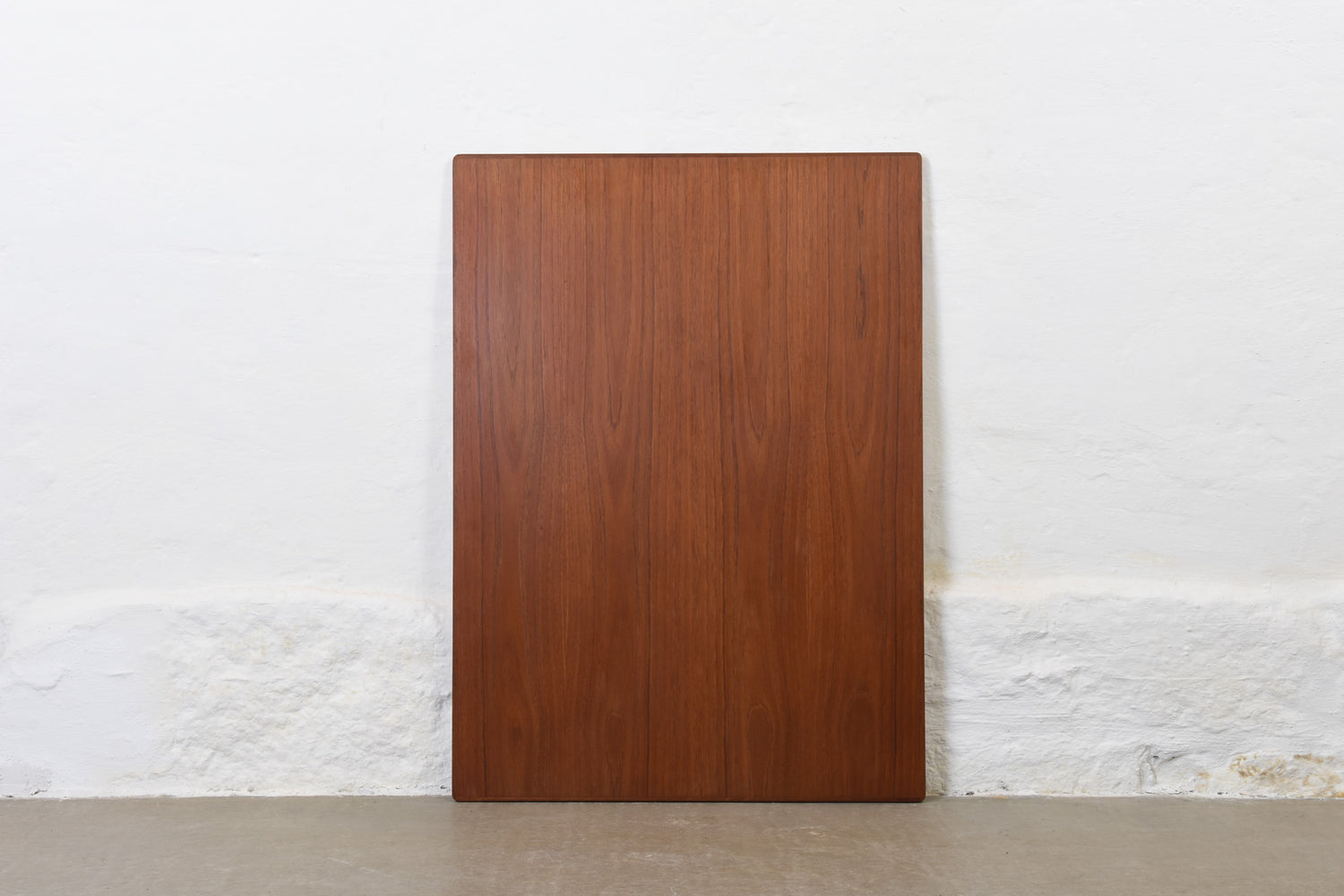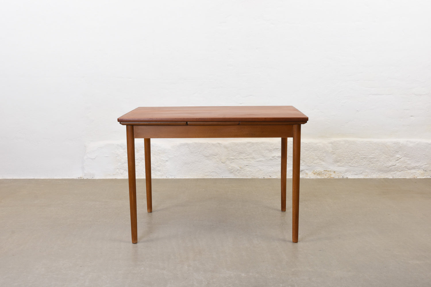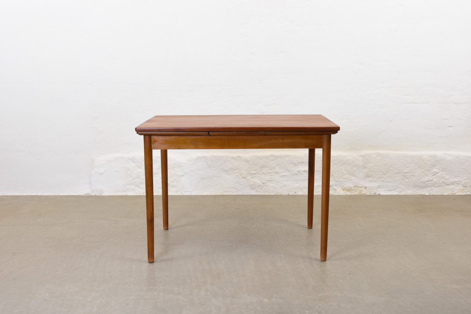 Extending dining table in teak with contrasting beech base. Features two pull-out extensions and will sit up to eight comfortably when fully extended.