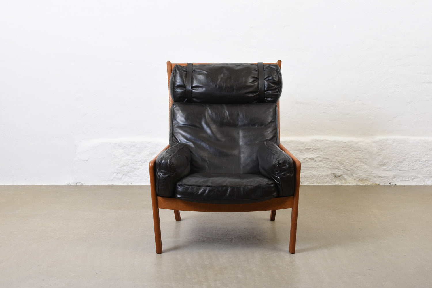 'Model GJ 13' high back lounge chair and ottoman in oiled oak. Features loose feather-filled cushions and its original black leather upholstery.