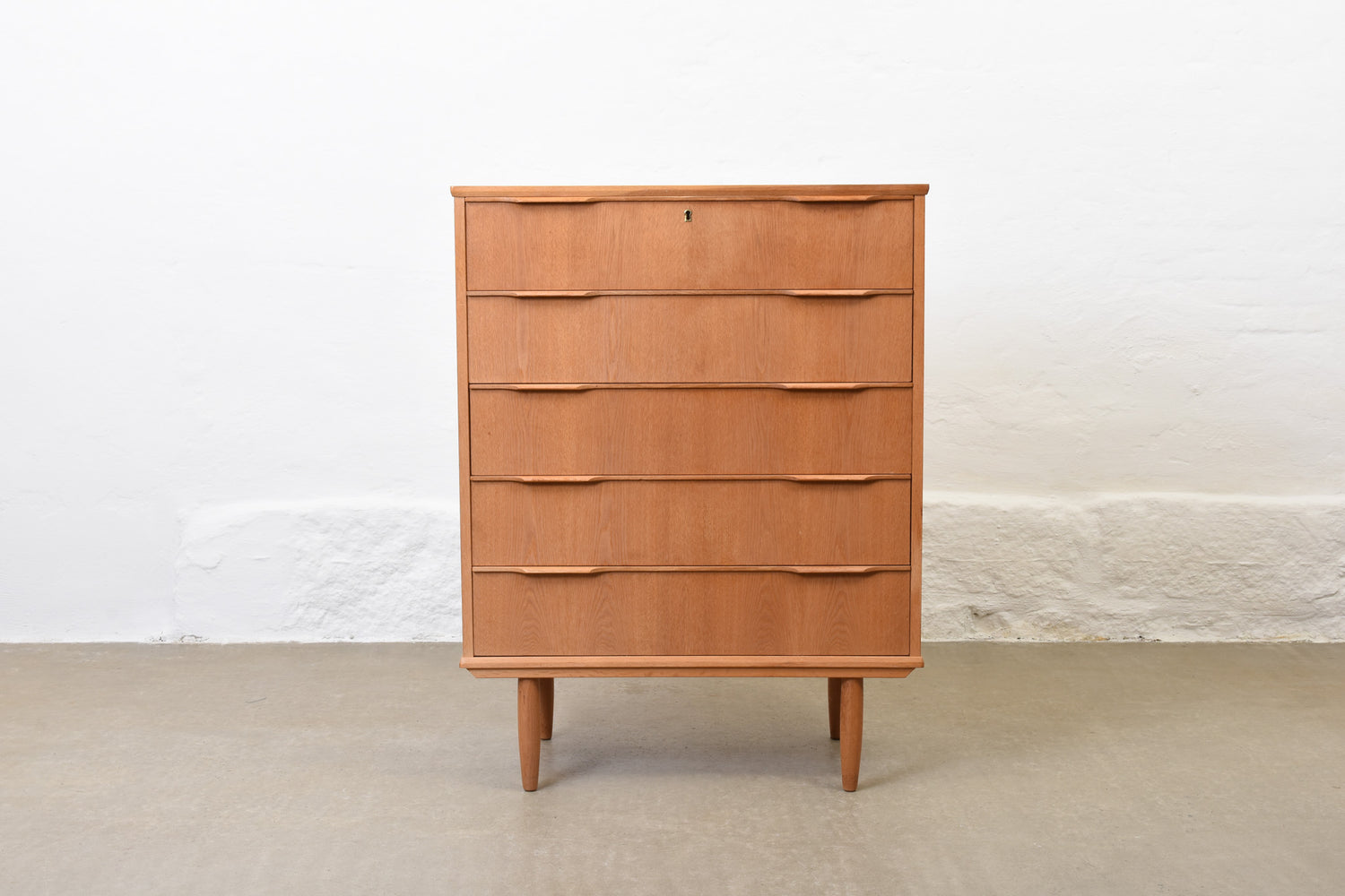 Vintage chest of five drawers with lipped handles in oak. Sits on tapered legs.