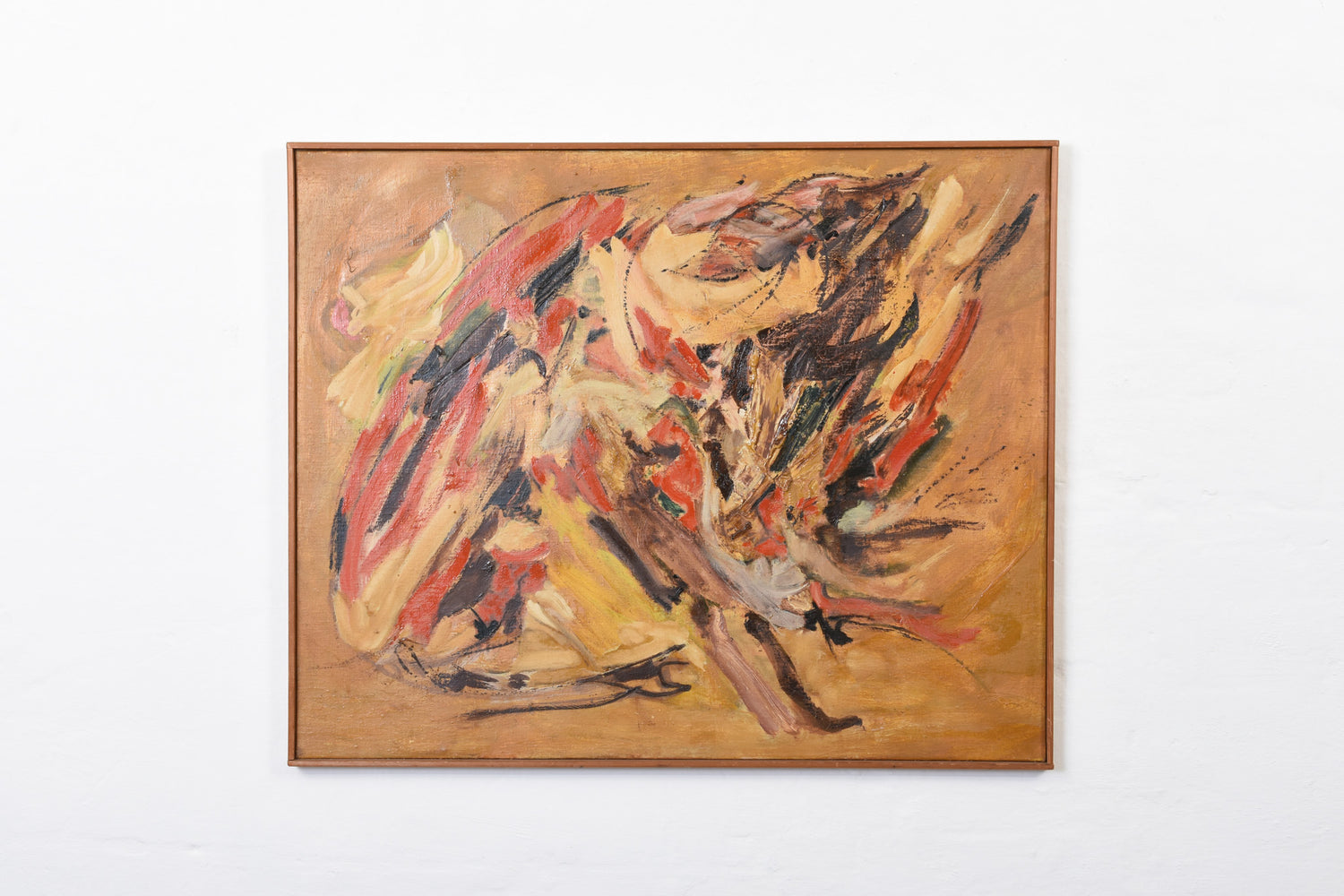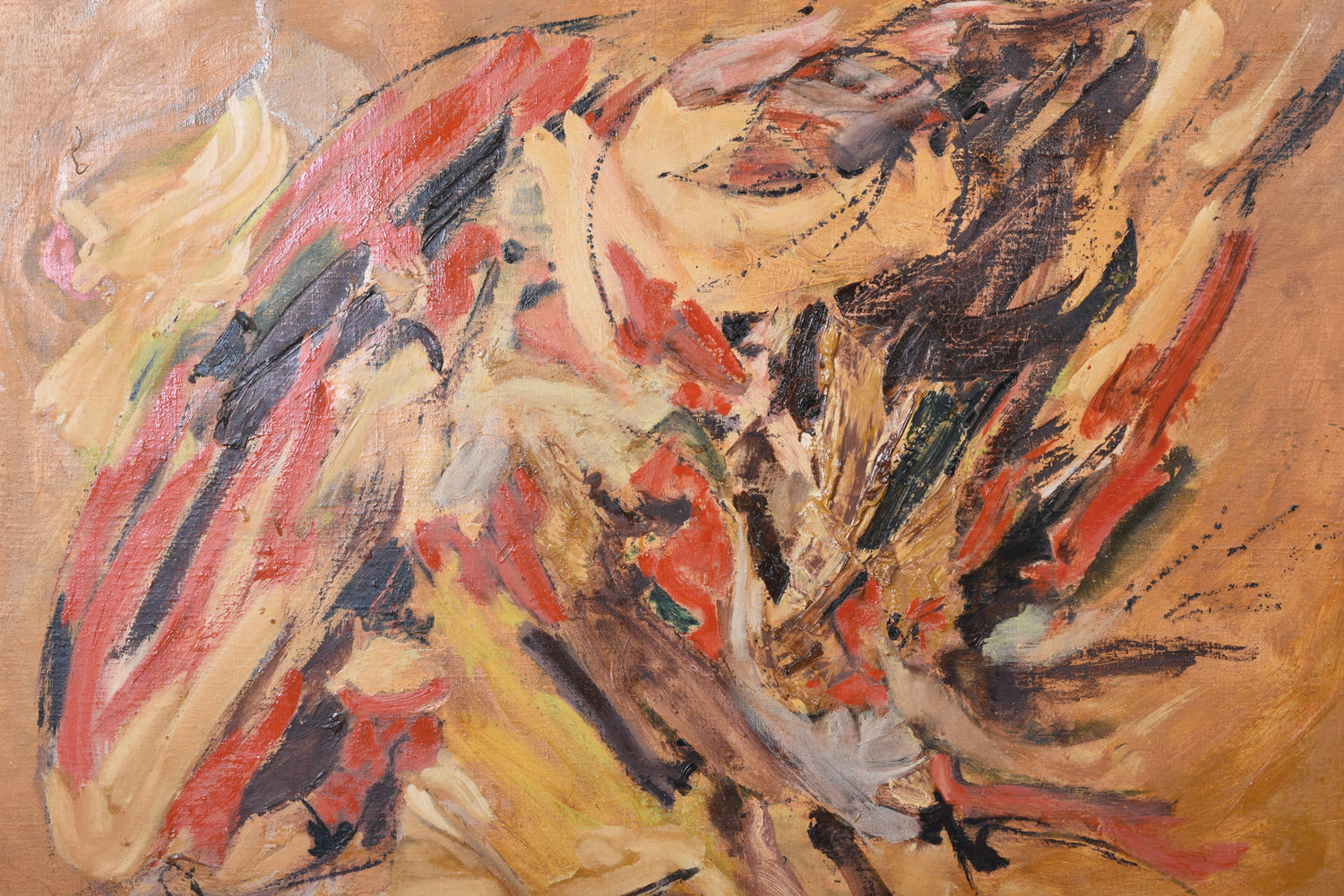 In this oil on canvas, we are presented with a flurry of movement and speed. Energized dashes of red, yellow and earthy tones propel this abstract form into life, engaging our eye to dart around the canvas to try and keep up with its fluid path. This energetic and confident approach to applying paint can be seen in a number of works by the artist, where he often explored the boundaries between figurative painting and abstraction.