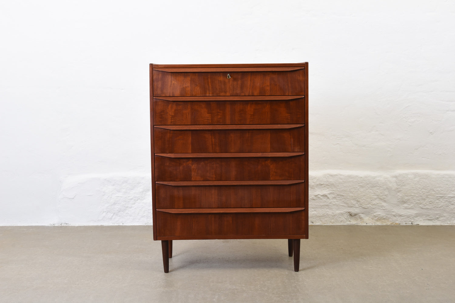 Teak chest of six drawers with lipped handles. Sits on turned teak legs.