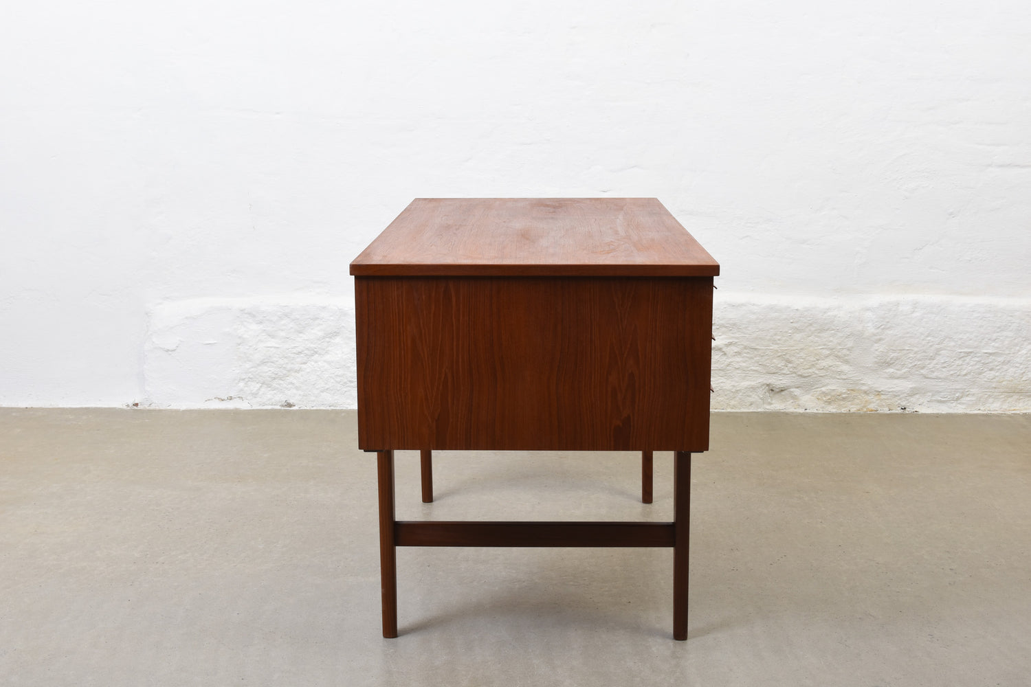 Twin pedestal desk in teak with a selection of six drawers with lipped handles. The top drawers on either side of the desk lock and the original key is also included.