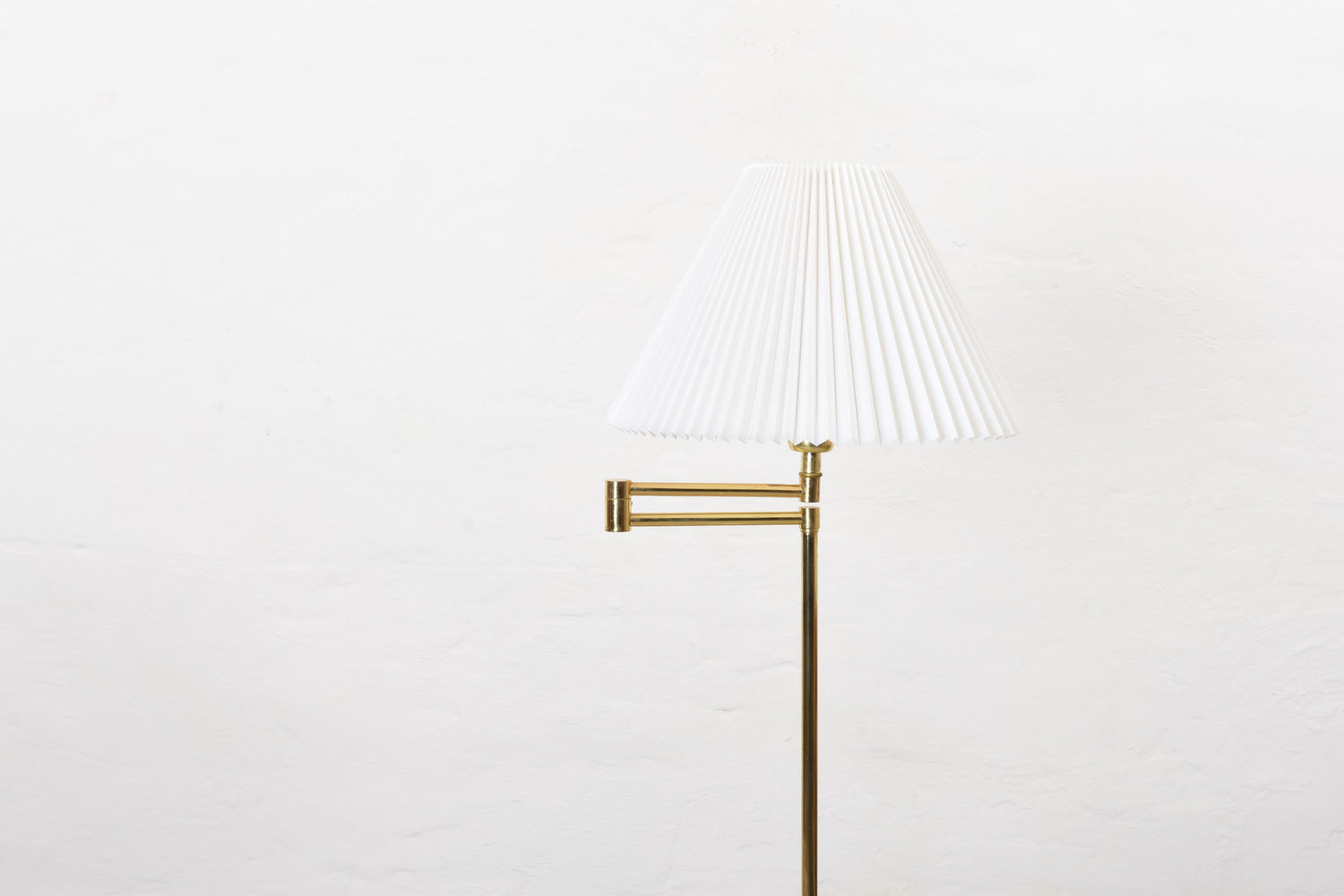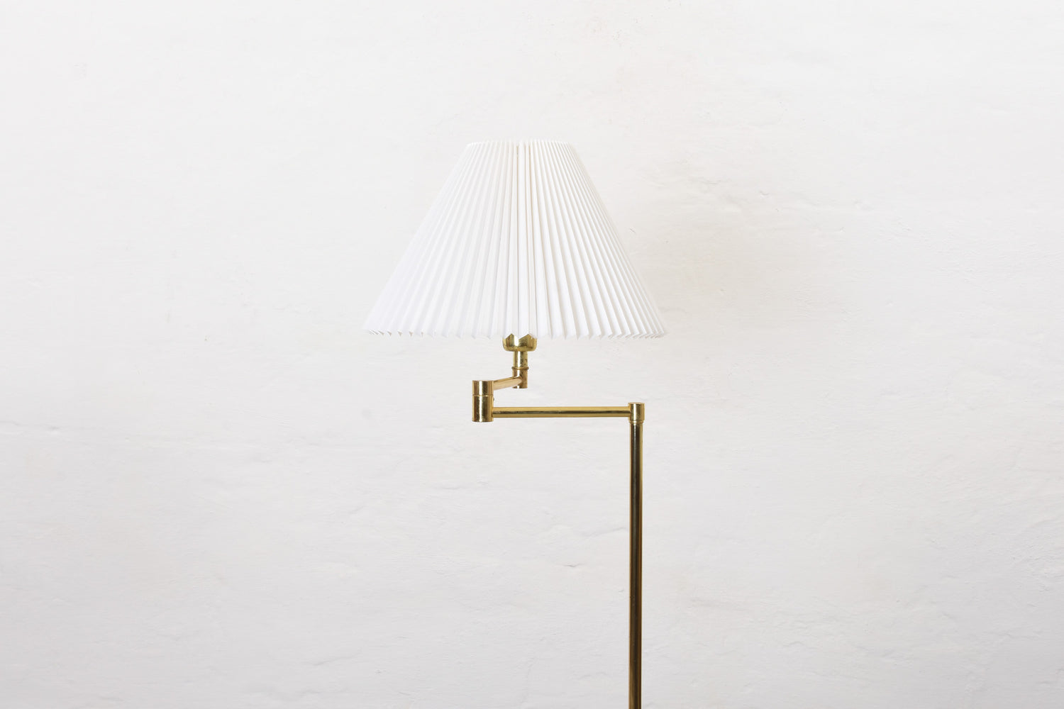 Vintage Danish floor lamp with a brass finish, adjustable stem and its original pleated shade.